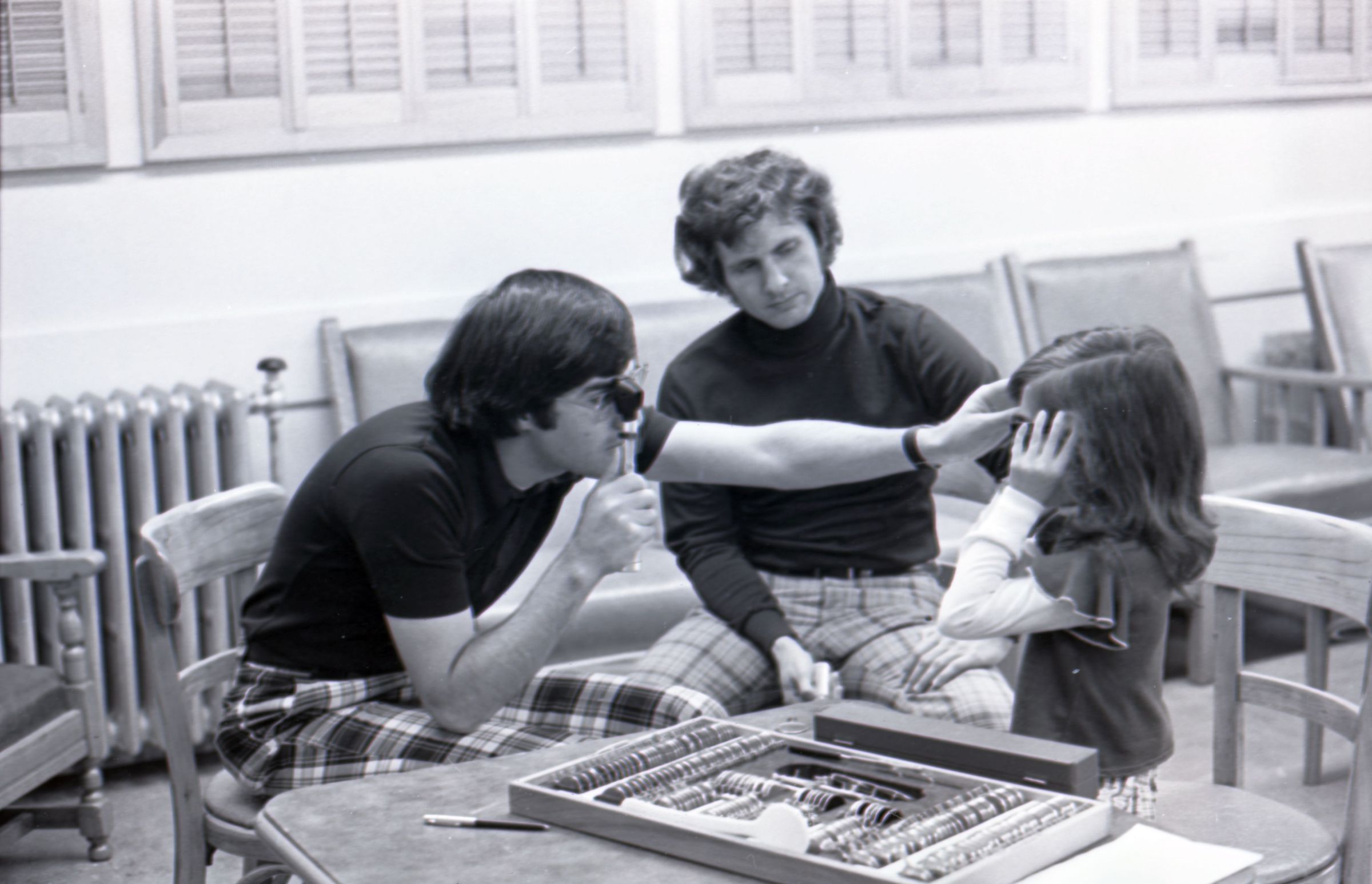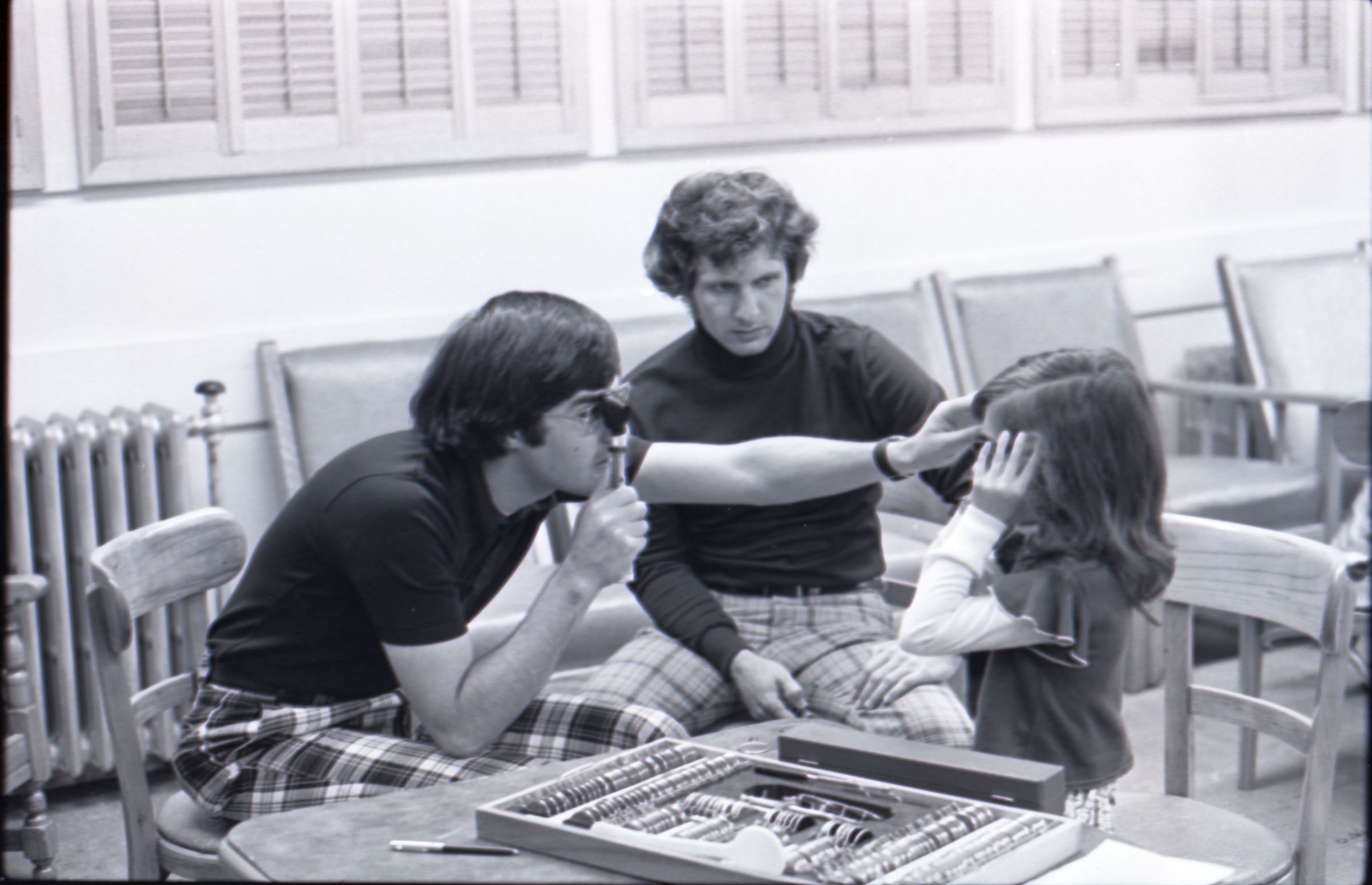 The images in group "e" show a man (Mike Kreidler) posing for portrait photos, two men performing an eye exam on a little girl, and two men crouched down in a large area filled with many potted plants.