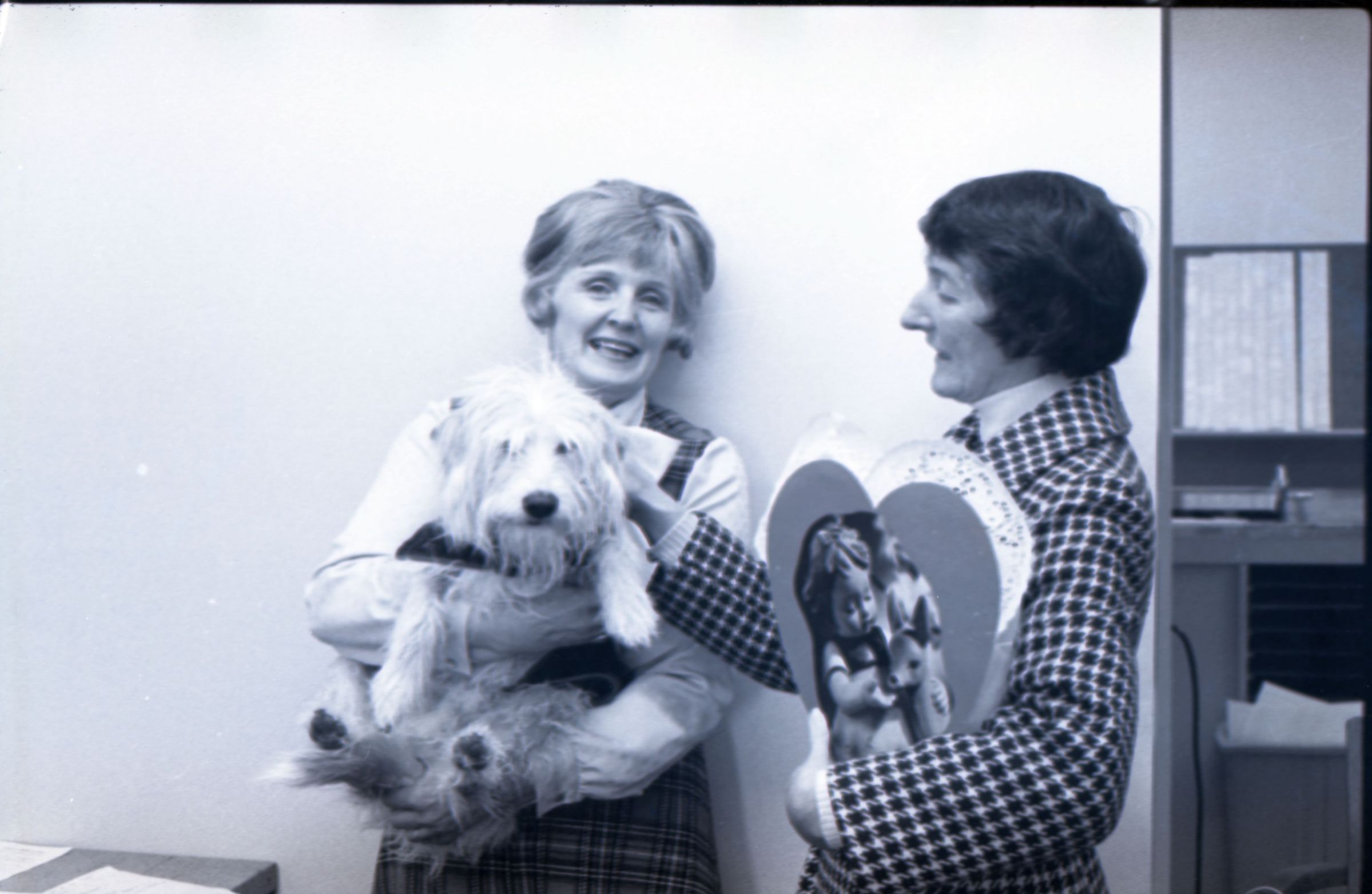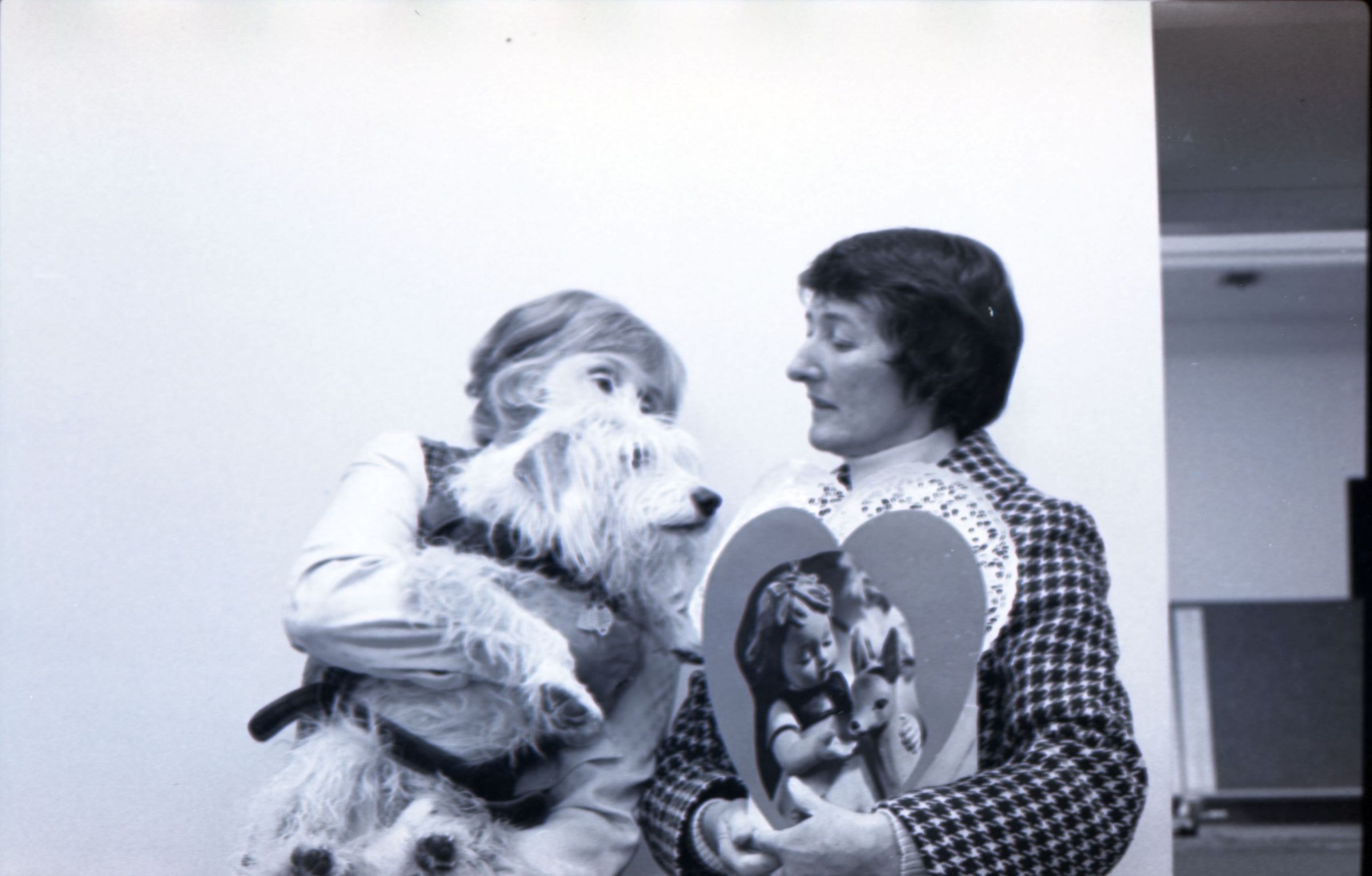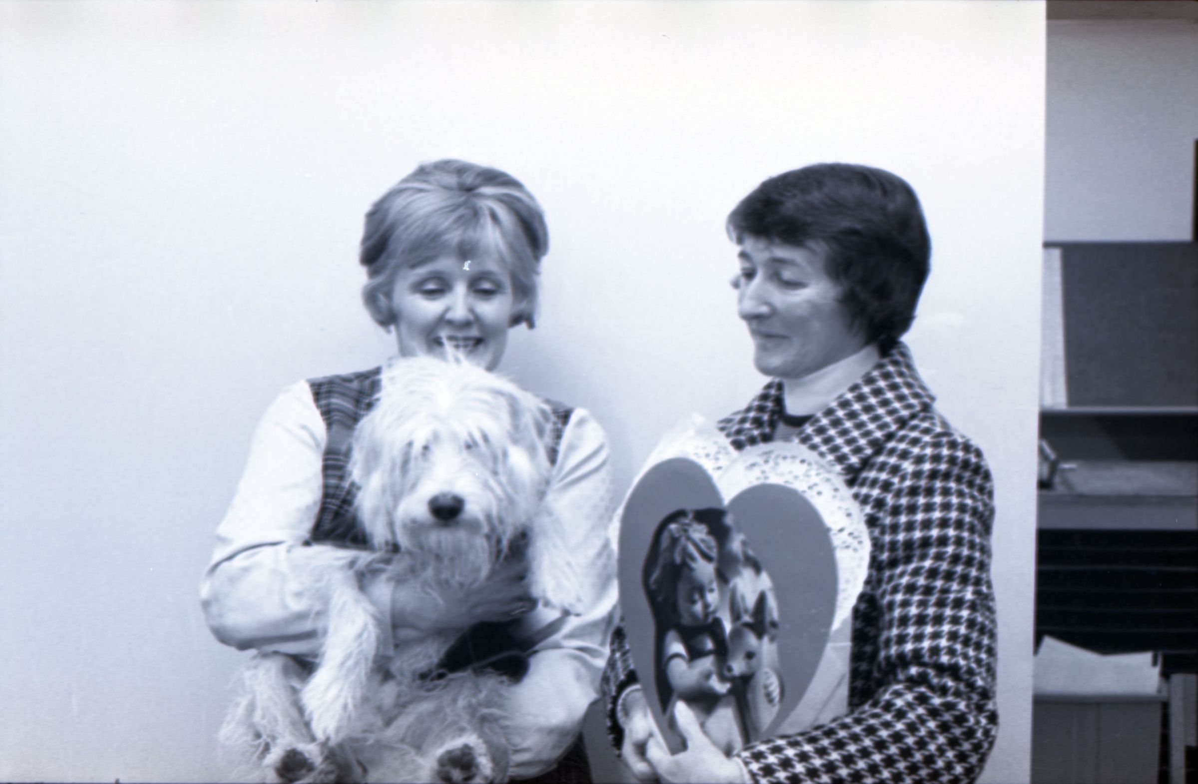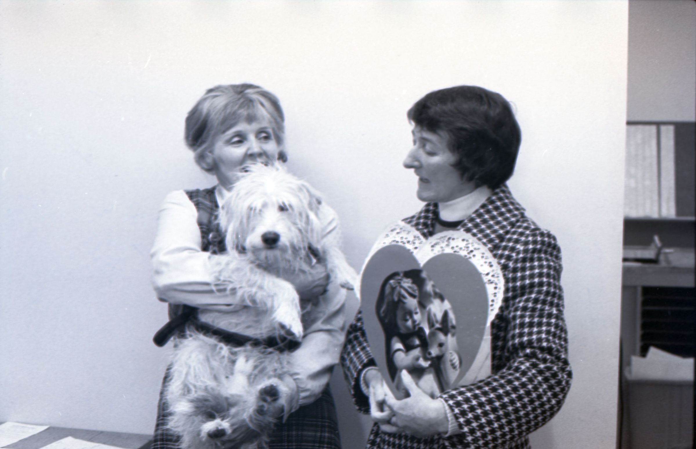 The images in group "j" show a man's lower face and torso in front of a wall with plaques or similar items hanging on it; and two older women, one holding a dog and the other holding valentines.