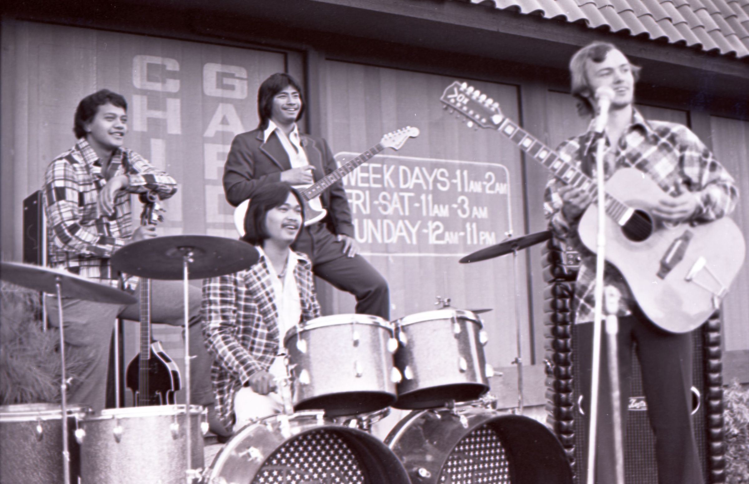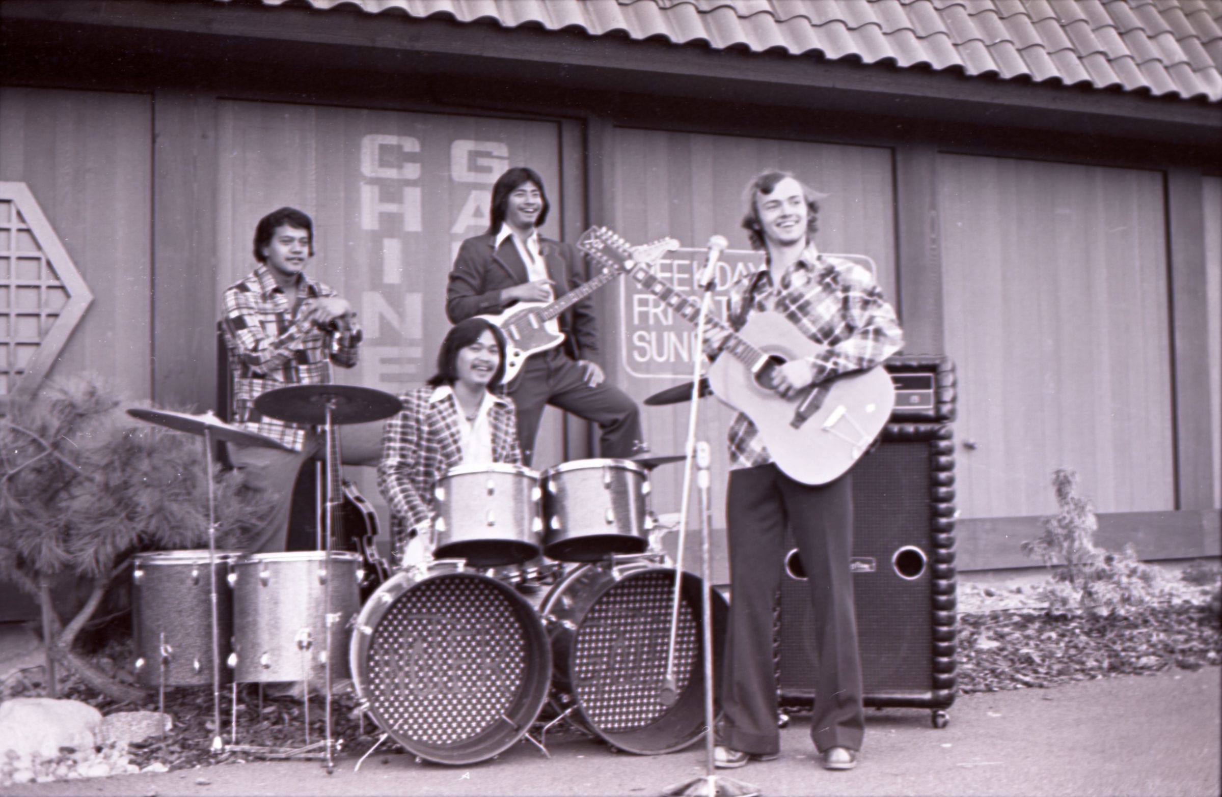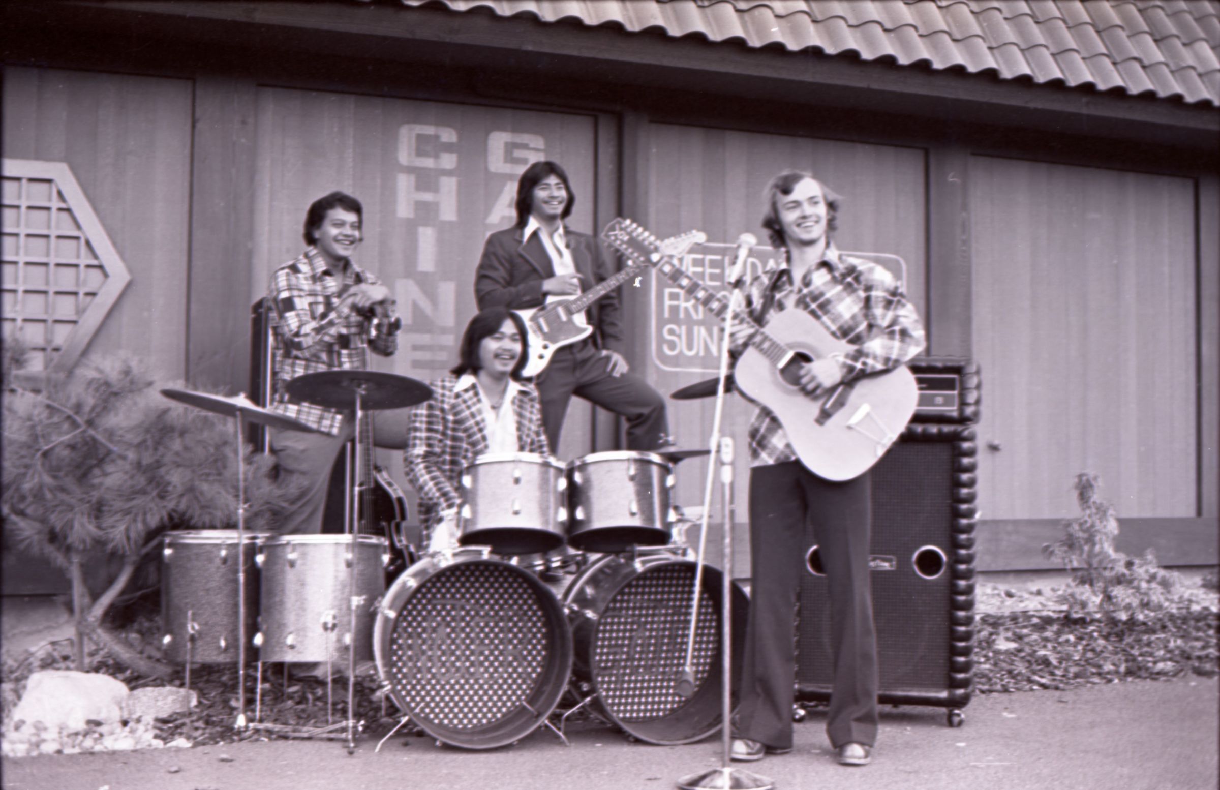The images in group "m" show a four-piece rock band posing for photos outside of the Chinese Garden restaurant. From left to right are: the electric bass player, the drummer, the electric guitarist and the acoustic guitarist/vocalist.