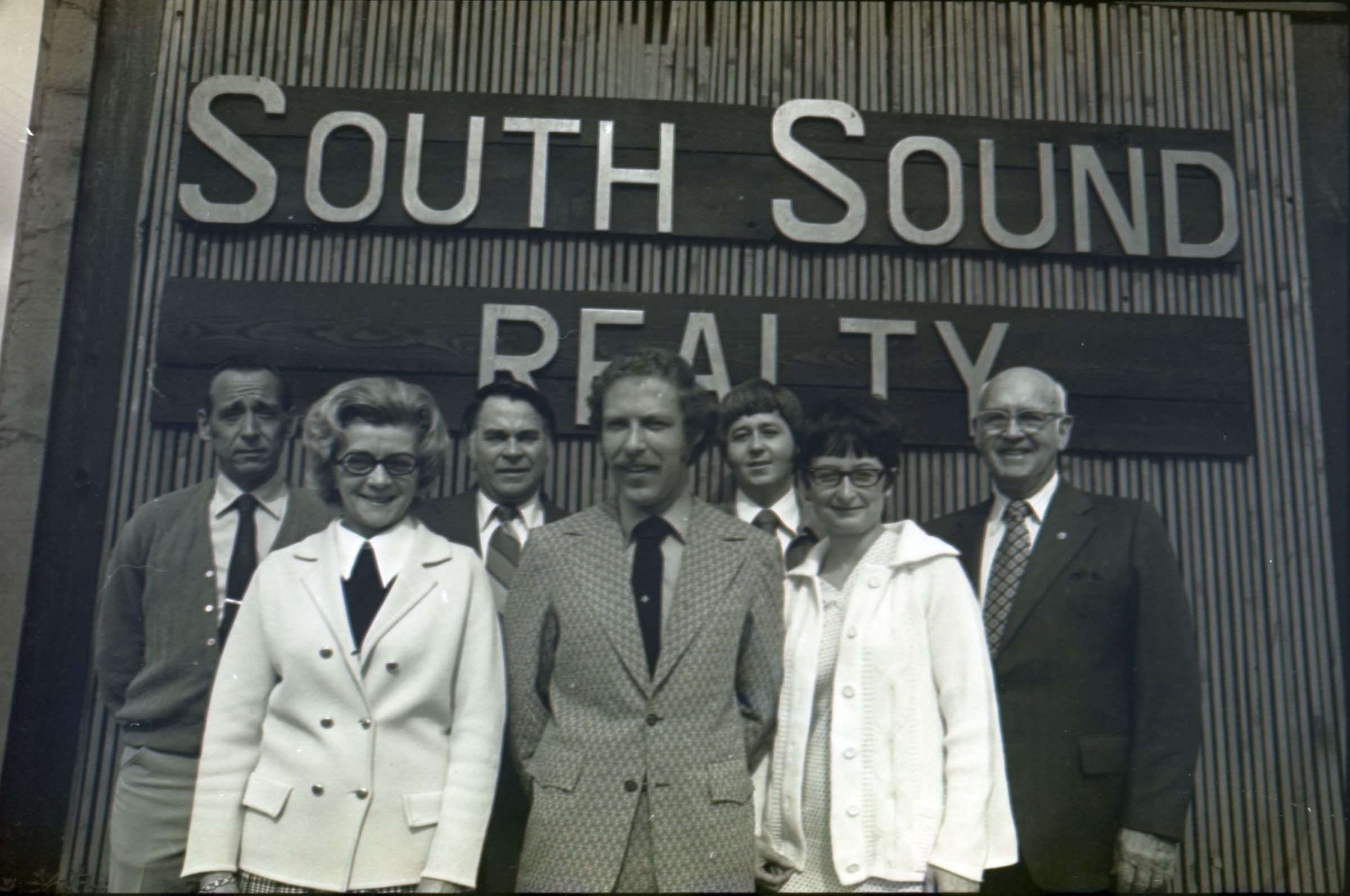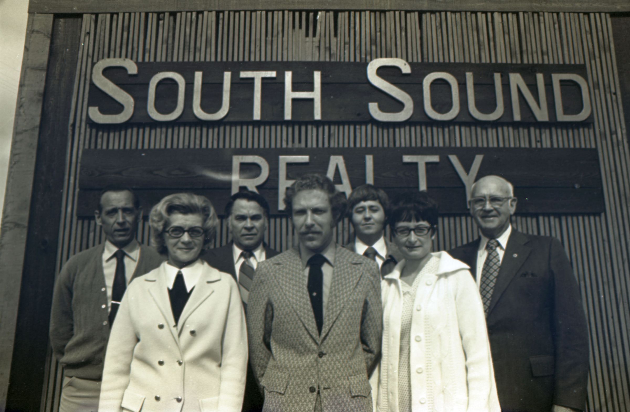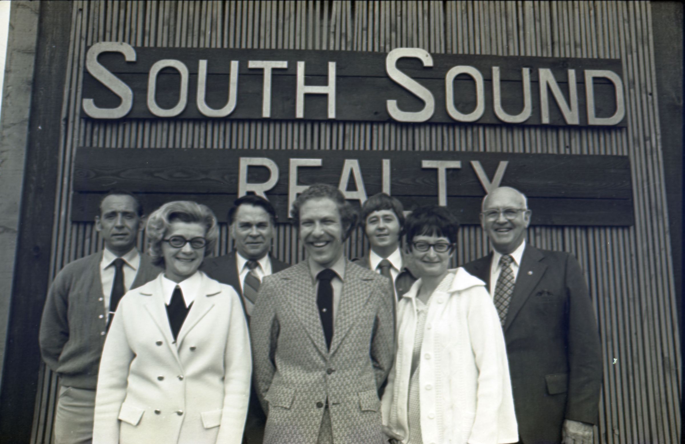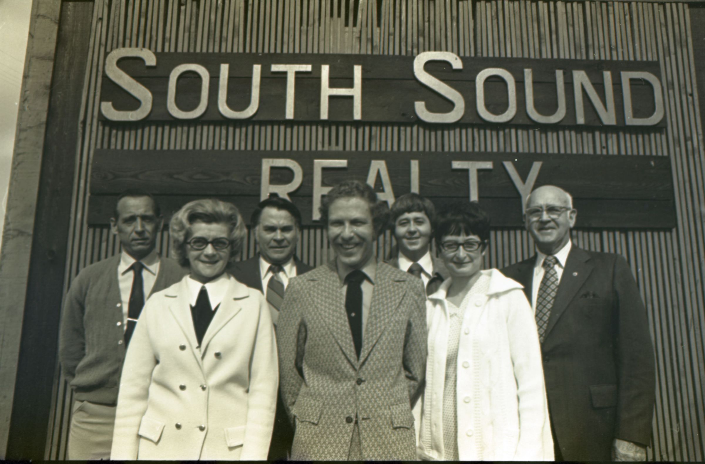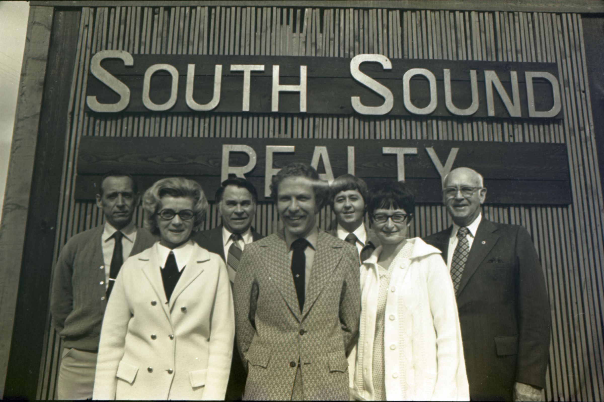 The images in group "d" show five men and two women all in business attire posing together for a group photo in front of a sign on the side of a building which reads "SOUTH SOUND REALTY." Three people are in the front row: the man at the center and one woman to either side. All of the people in the back row are men. All of the people are looking toward the camera and smiling.