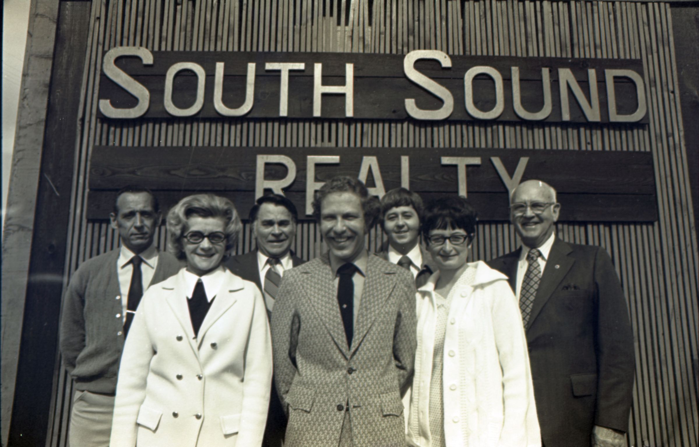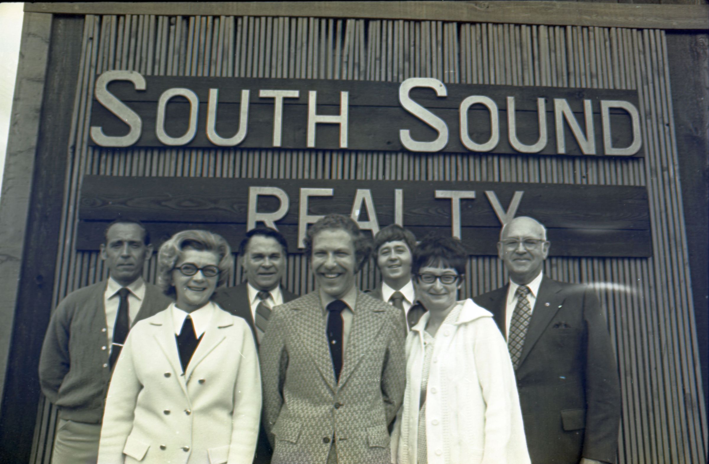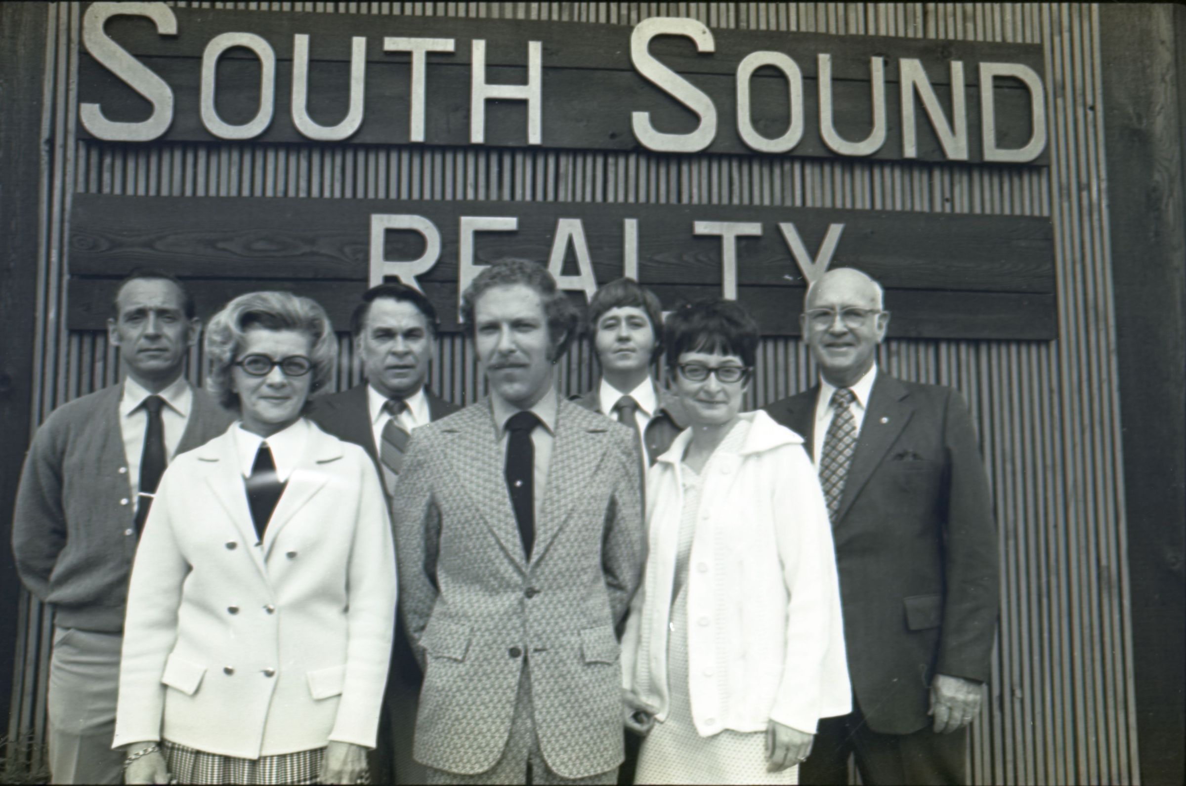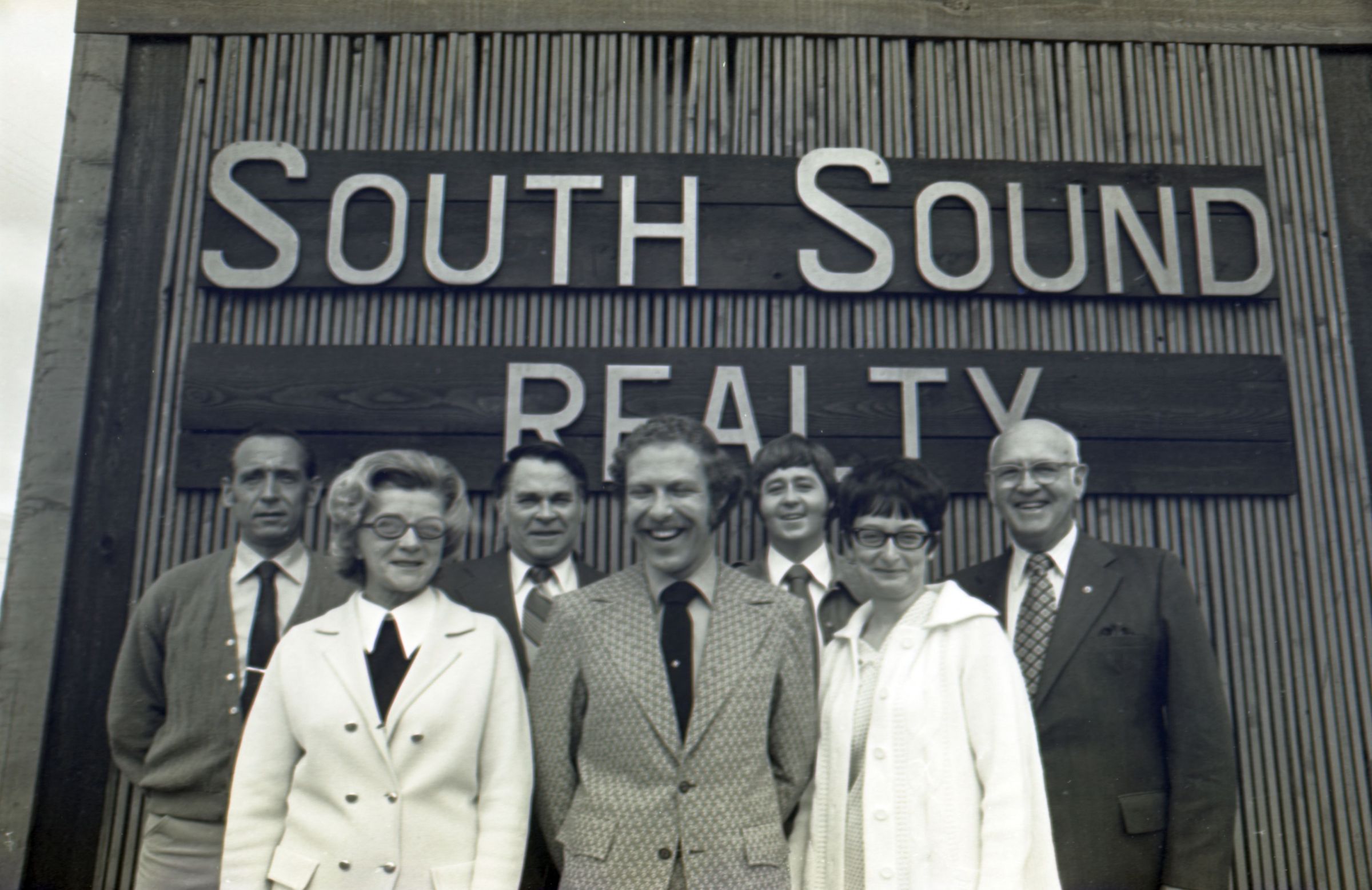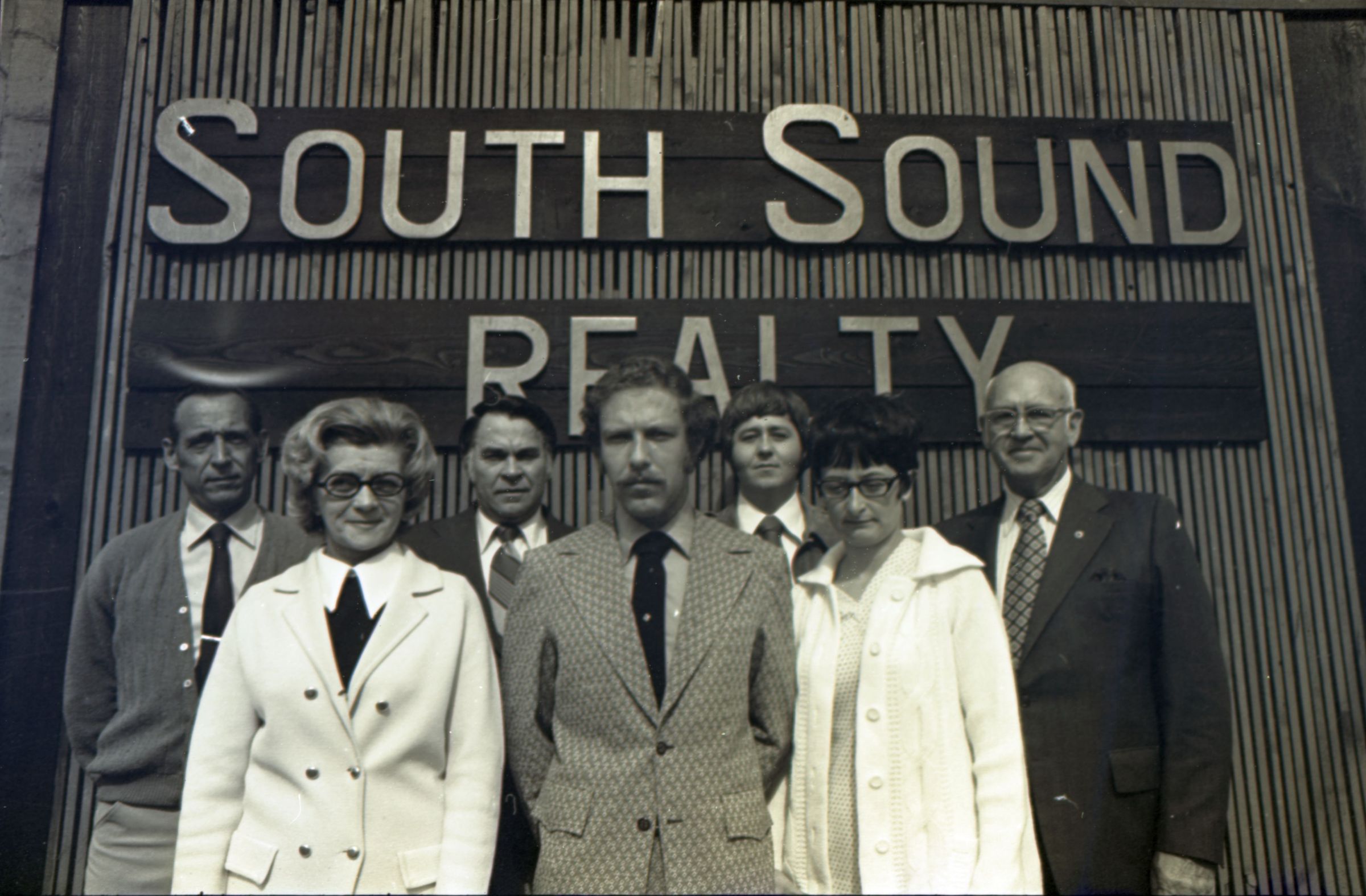 The images in group "d" show five men and two women all in business attire posing together for a group photo in front of a sign on the side of a building which reads "SOUTH SOUND REALTY." Three people are in the front row: the man at the center and one woman to either side. All of the people in the back row are men. All of the people are looking toward the camera and smiling.