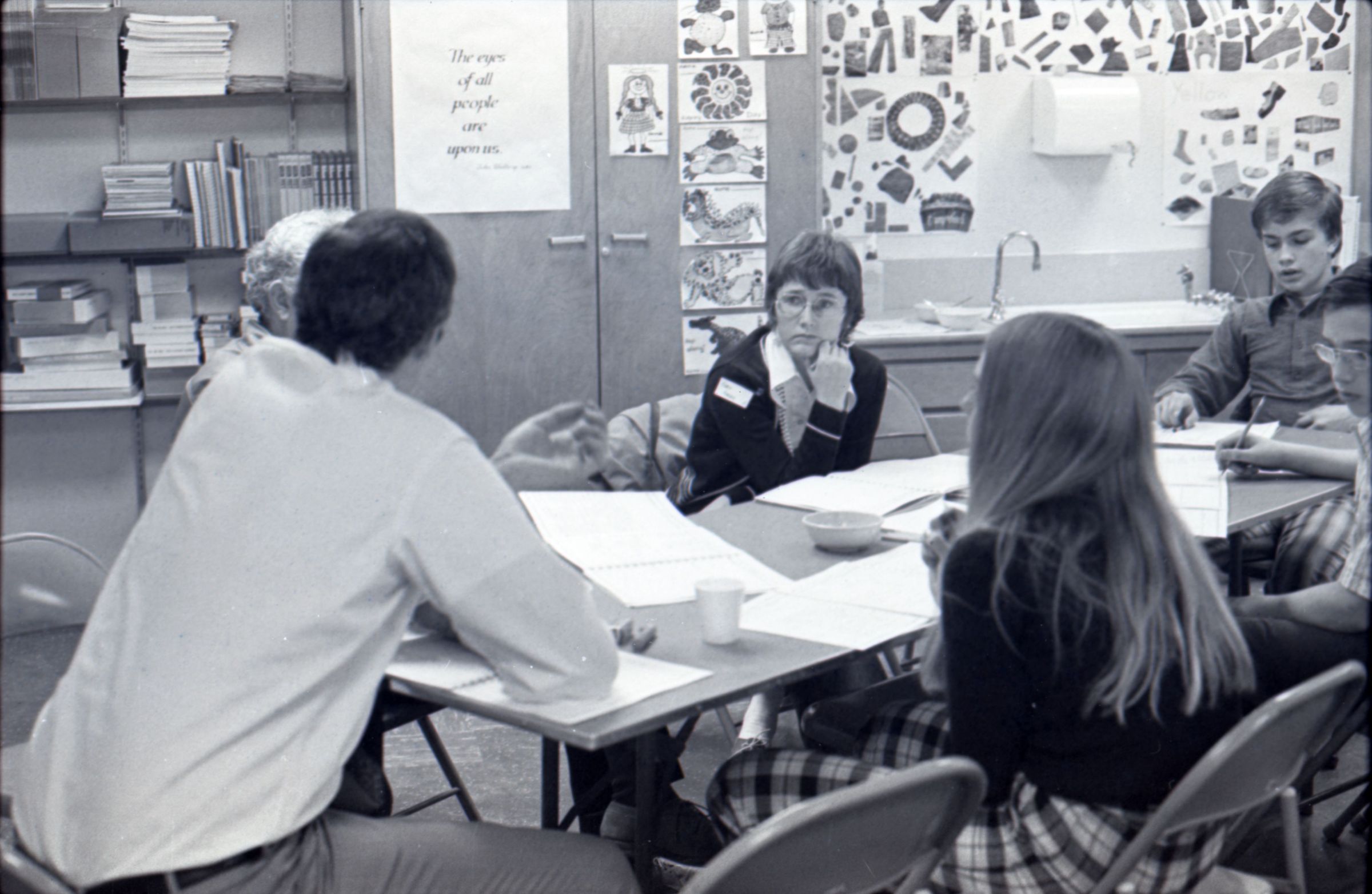 The images in group "b" show a meeting, which may be one of the meetings seen in group "a."