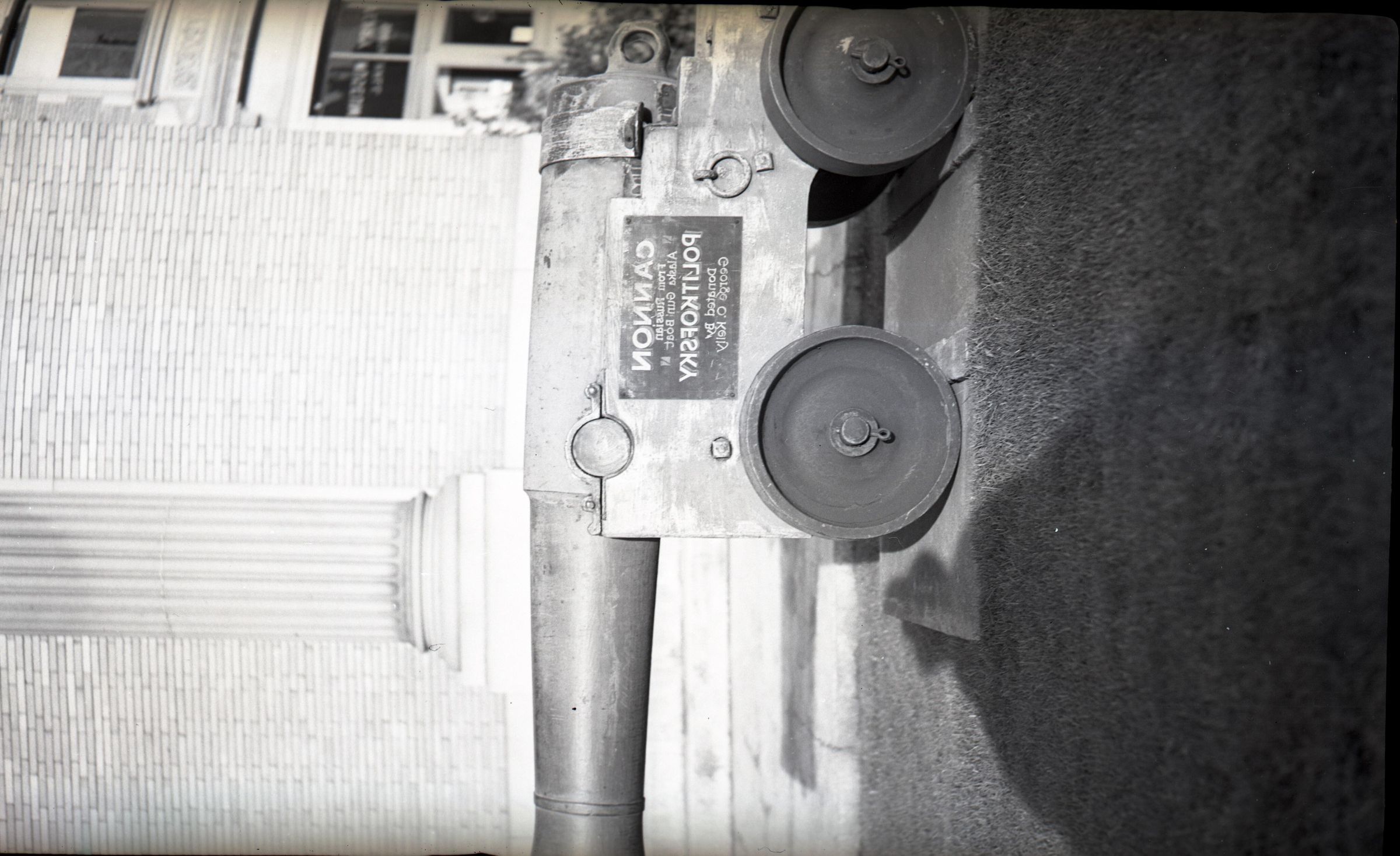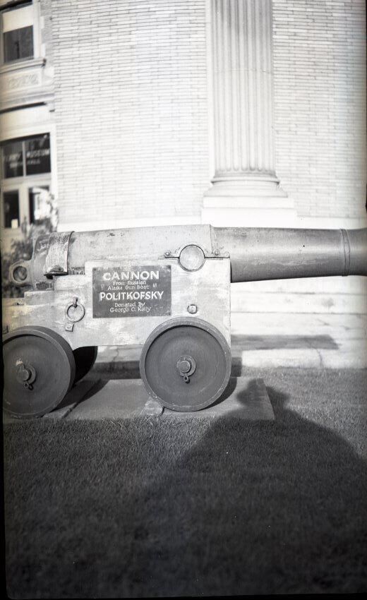 Black and white negative of a cannon at the Historical Society Building in Tacoma. In the foreground is a shadow of a person, probably the photographer. The cannon is in the center of the image, and has two large wheels visible. Above that is the carriage which has a plaque on the side with writing, that which is readable says "cannon politkofsky". There is a key ring hanging on the side. Above the carriage is the barrel of the cannon, with a pivot rod on the carriage. Behind the cannon is a building with a column and a brick wall. At the left is windows of a building. There is a white border on all sides, and in the bottom border is "#1293 11/22/39".