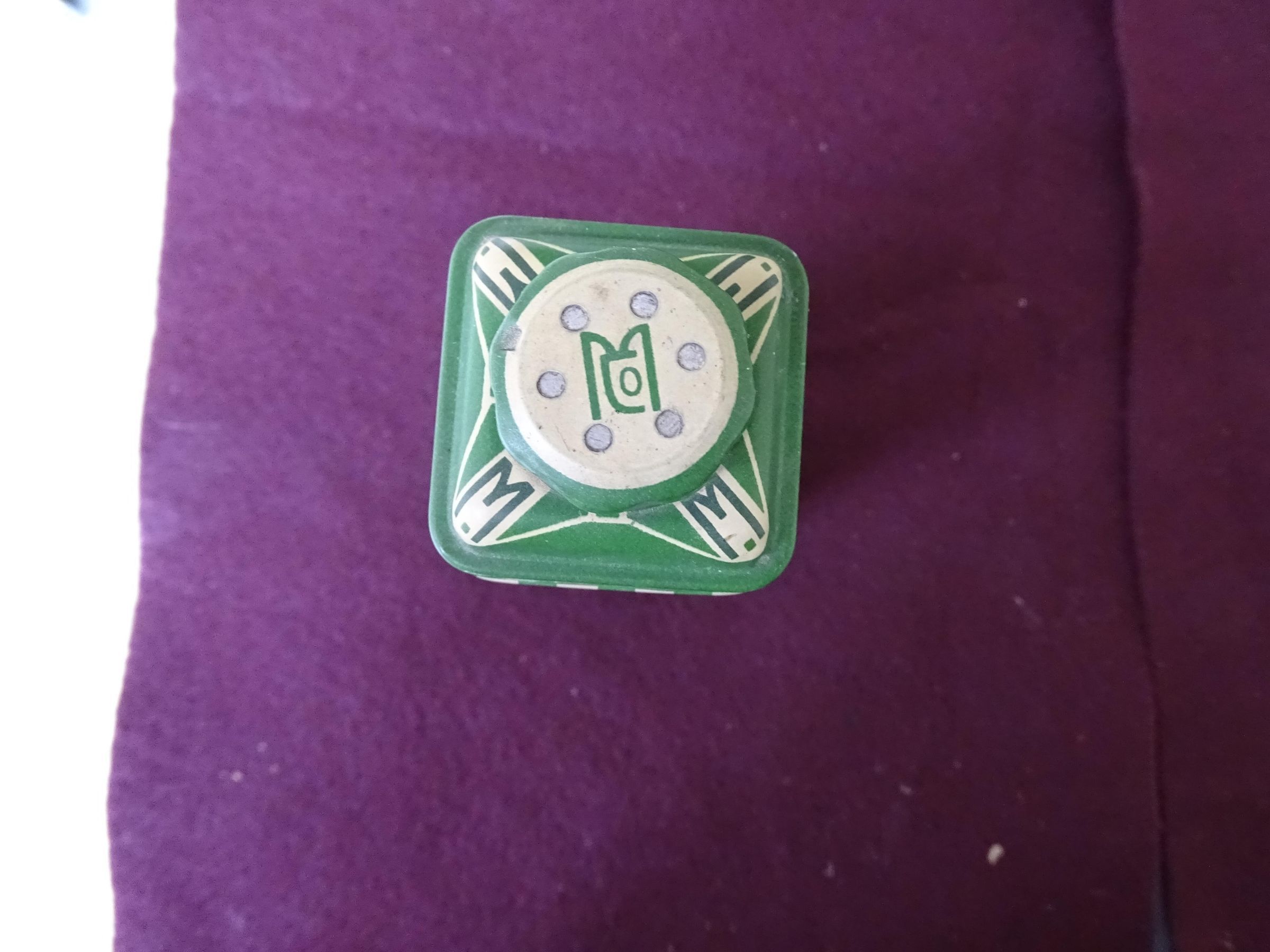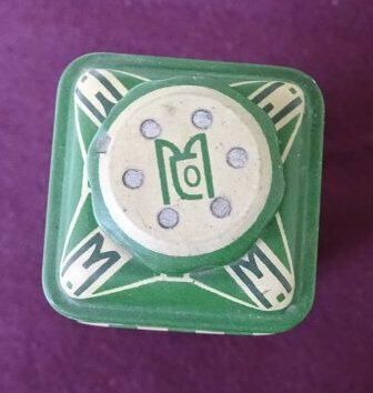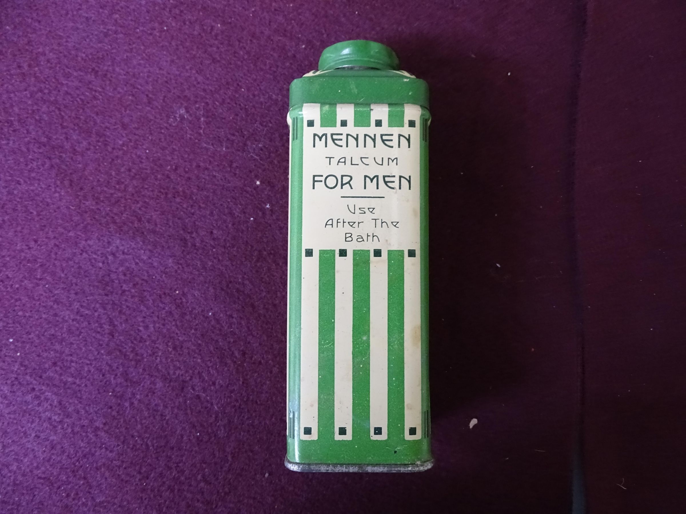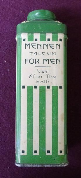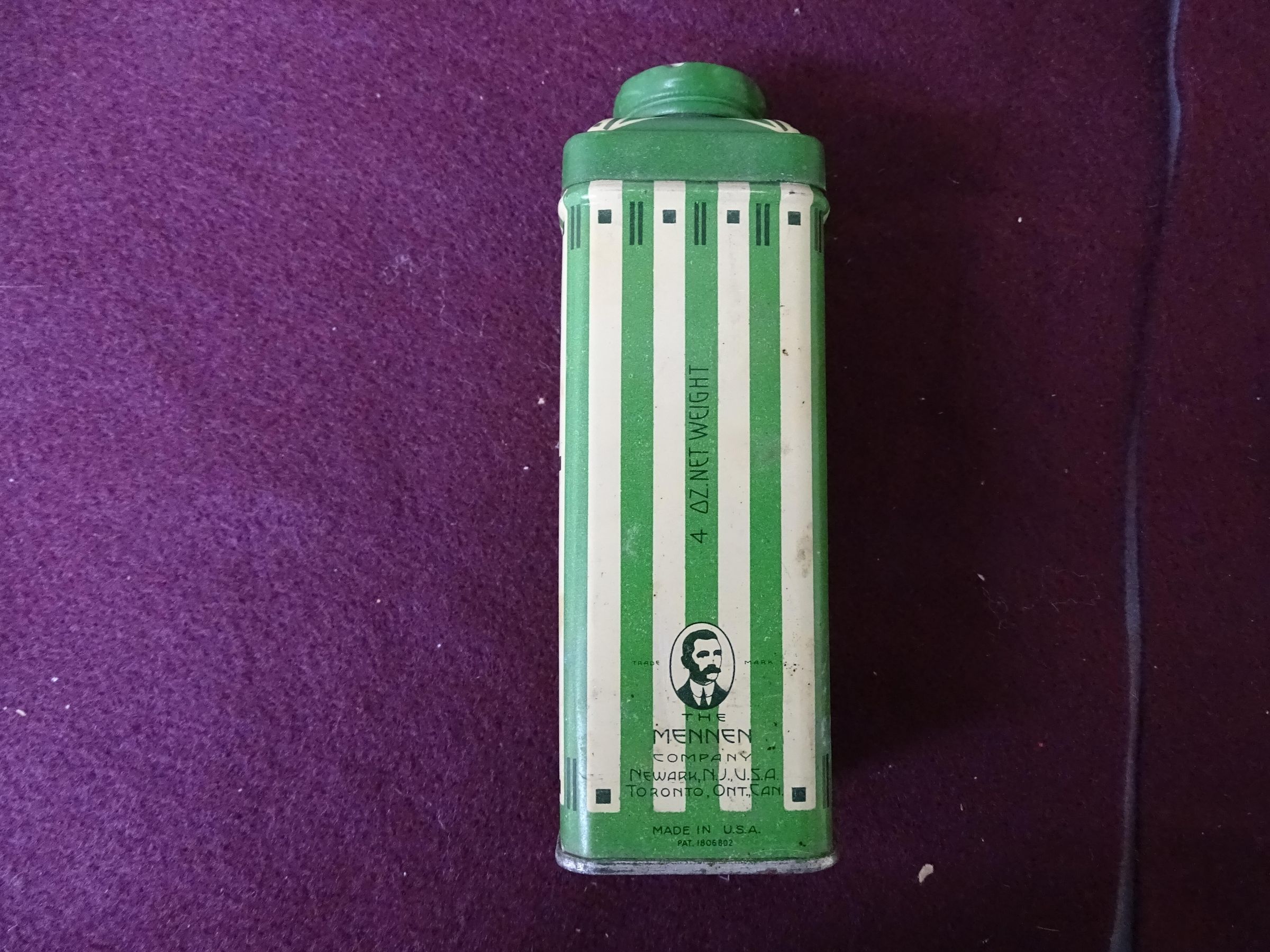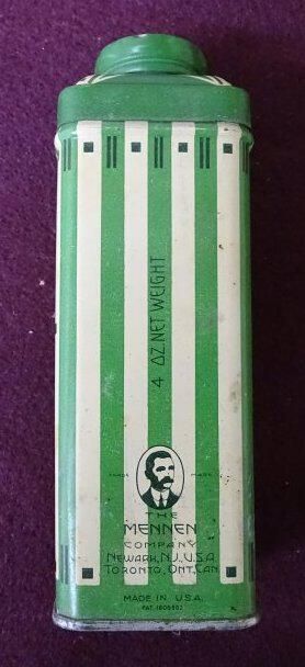 Metal container holding talcum powder. The object is a square metal tube standing upright. At the top of the tube is a pressed metal cap with a round dispenser that has holes that line up with other holes in the metal below. On the dispenser is a stylized letter "M". On the shoulders of the cap are four more such letters. The object is painted green and white with the sides being alternate stripes. On side one are the words "Mennen talcum for men Neutral tint won't show on your face". On side two is "container made in U.S.A." and in very small letters near the bottom "10 A X" or "10 A K". On side three is "Mennen talcum for men Use after the bath". On side four is "4 oz net weight", "trade mark" on either side of an image of a man, "The mennen Company Newark N.J. U.S.A Toronto, Ont. Can. made in U.S.A. Pat. 1806802".Made/Created