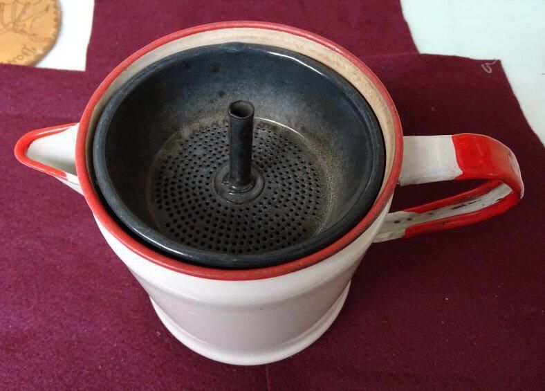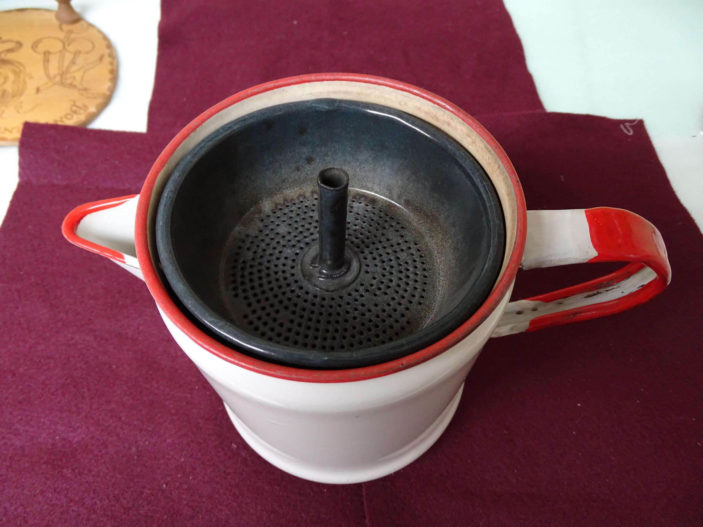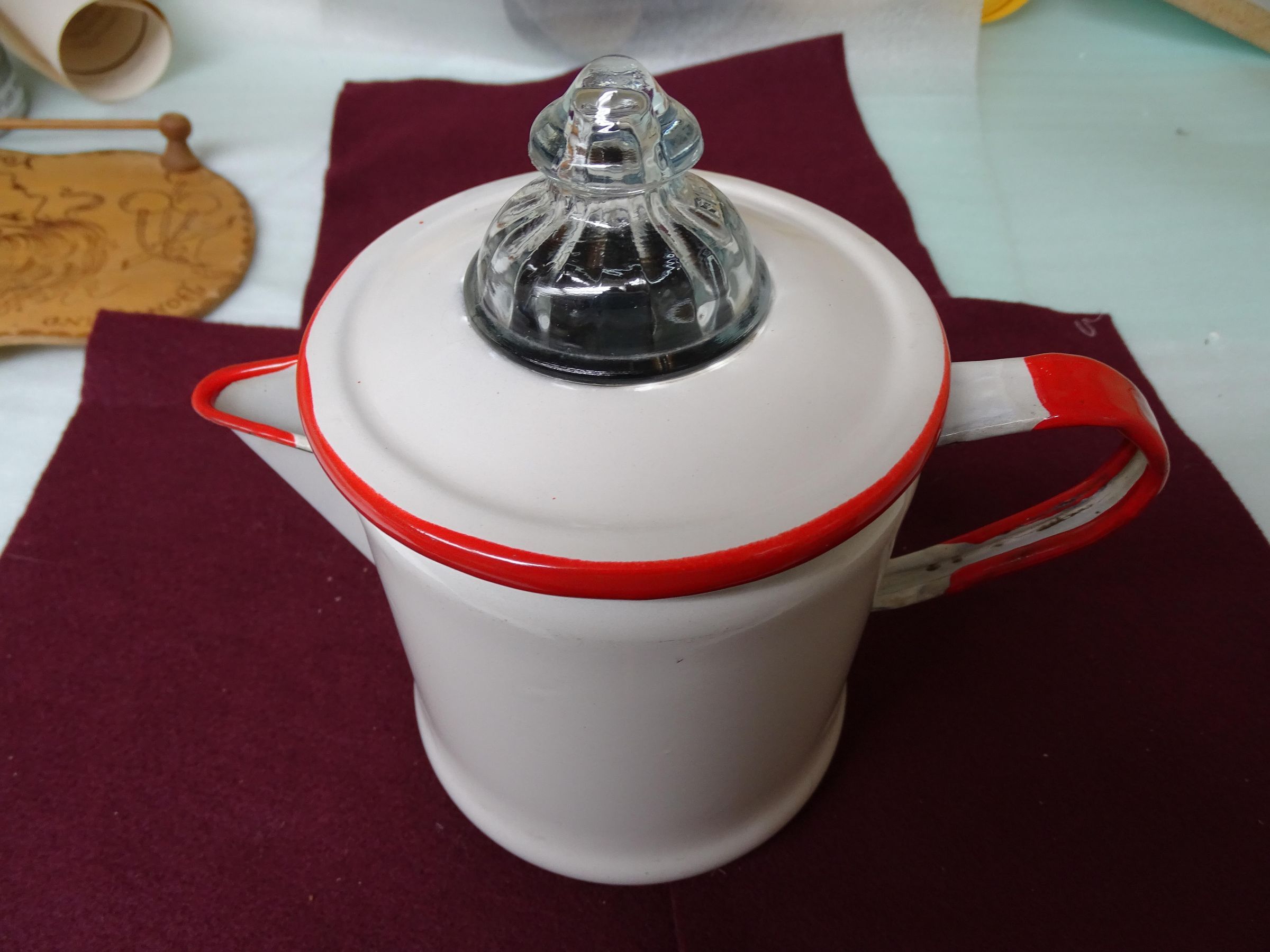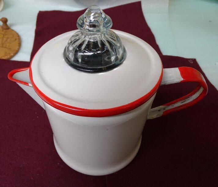 Metal percolator coffee pot with basket and lid. The pot has a white coating called enamelware and has red painted trim on the handle , spout, and top rim. The basket is dark enameled metal on a tube attached to an arched stand that sits on the inside bottom of the pot. The lid has a white coating with red trim and in the center of the lid is a glass dome. On the dome is cast "Fire King".Made/Created