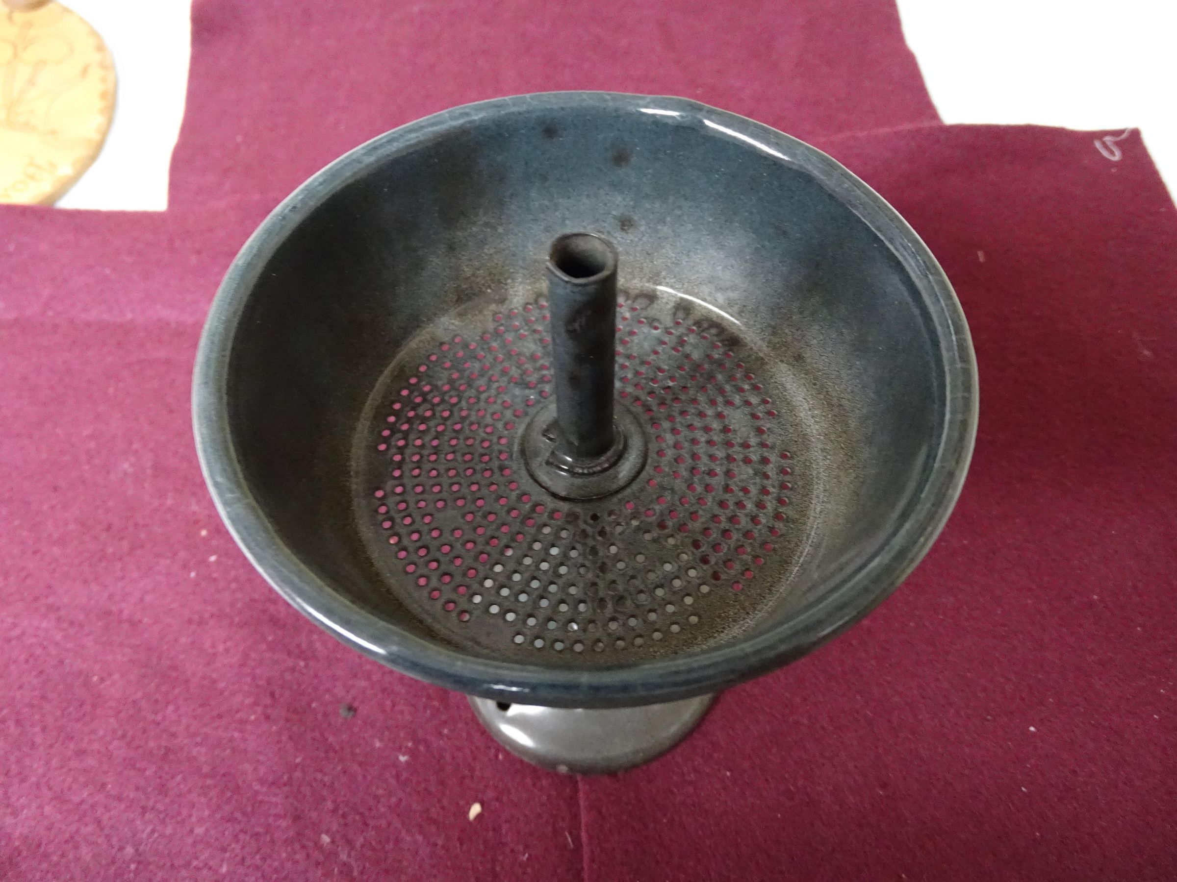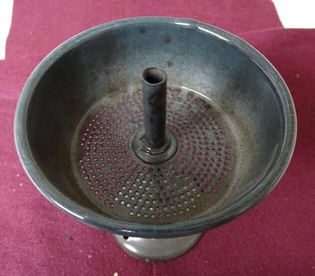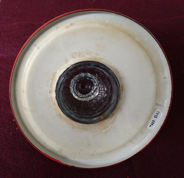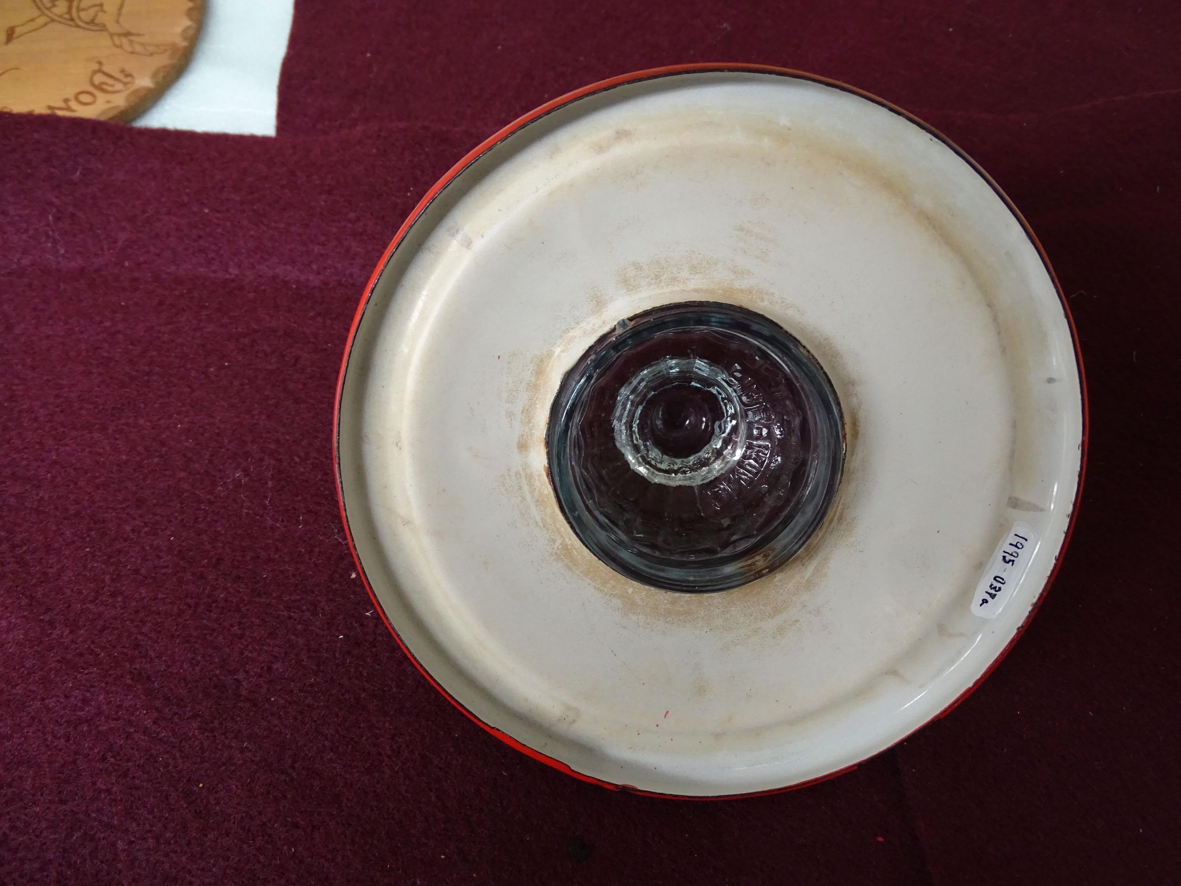 Metal percolator coffee pot with basket and lid. The pot has a white coating called enamelware and has red painted trim on the handle , spout, and top rim. The basket is dark enameled metal on a tube attached to an arched stand that sits on the inside bottom of the pot. The lid has a white coating with red trim and in the center of the lid is a glass dome. On the dome is cast "Fire King".Made/Created