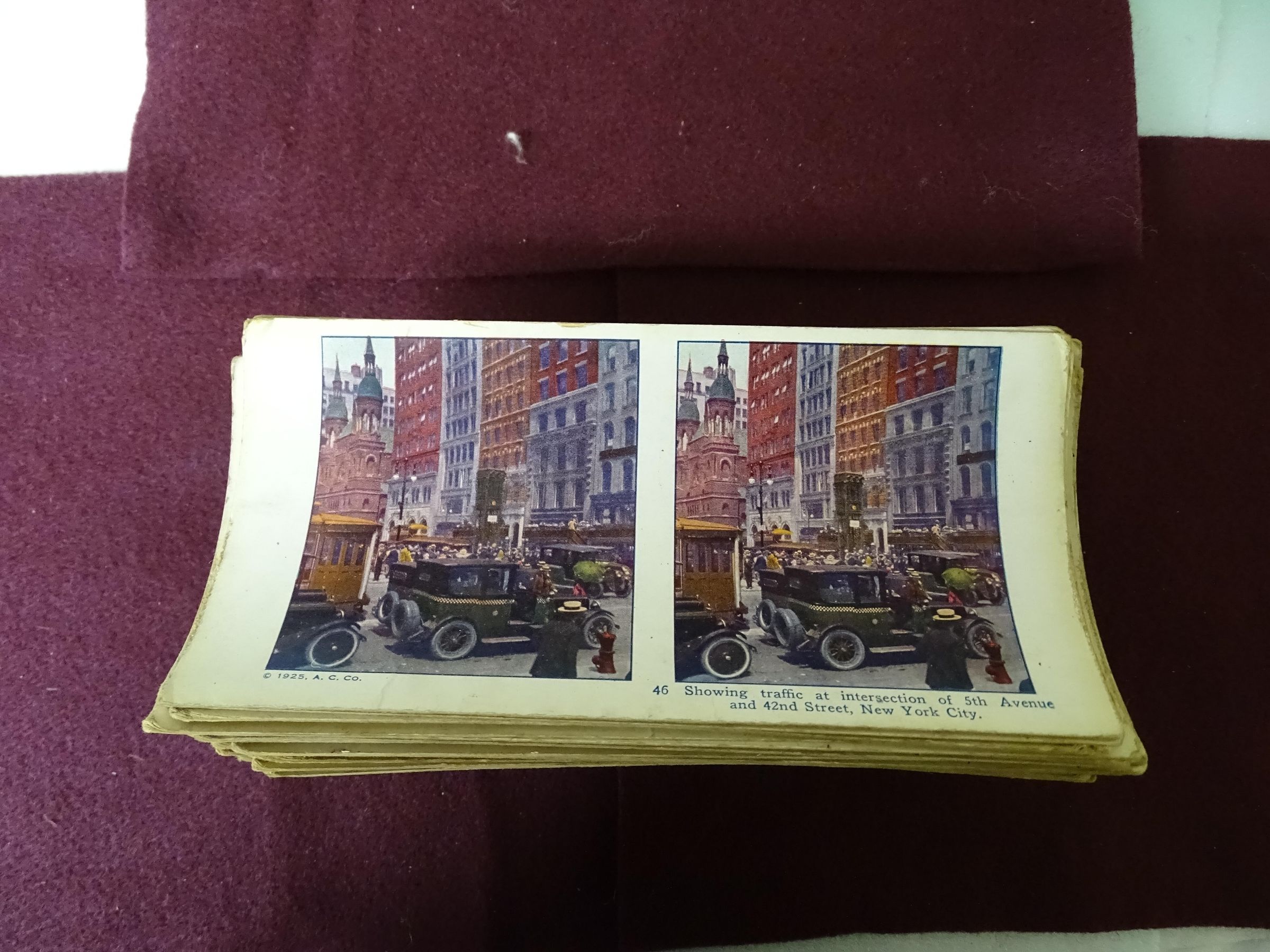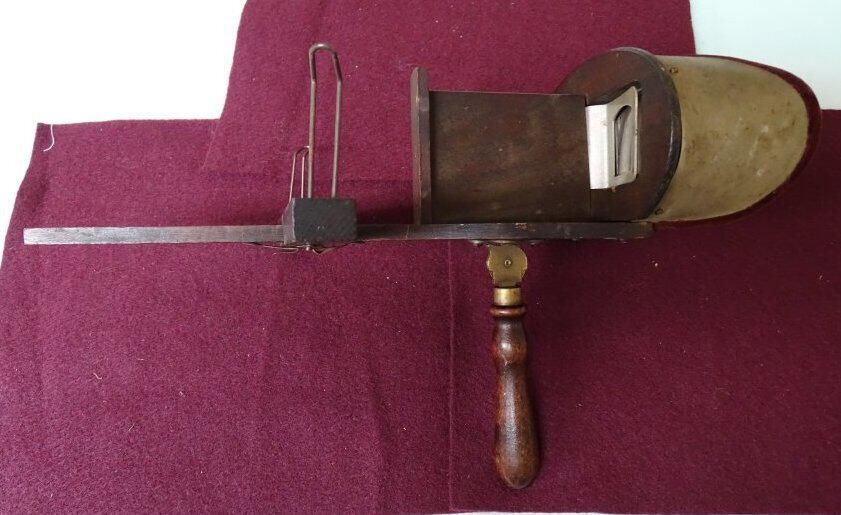 Wood, metal, and glass stereoscope and slides. This model is known as a Holmes Stereoscope for its inventer, Oliver Wendell Holmes. A long flat piece of wood has attached by screws a viewing hood which consists of an eye enclosure and a metal frame holding two glass lenses. On the flat piece beyond the hood is a vertical piece of wood between the lenses. There is a square piece of wood with wires to hold slides perpendicular to the flat piece that moves back and forth. Underneath the flat piece is a folding handle. There are 117 slides with two images on each that permit a view through the lenses to appear three dimensional.Made/Created