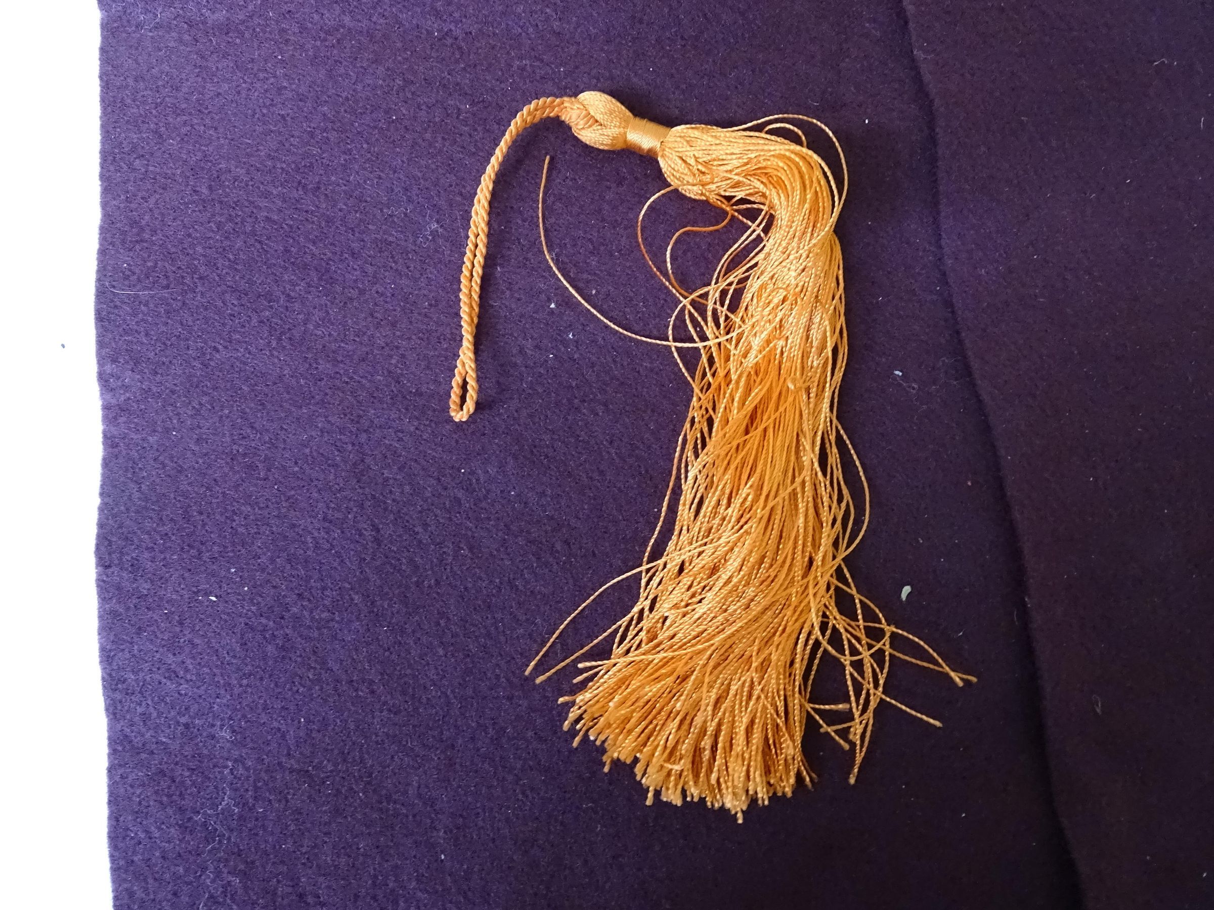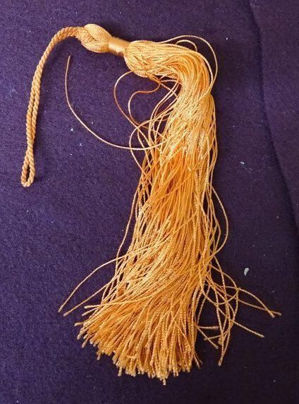 A Tassel made up of Orange threads bound at the top by smaller threads and with larger threads making up a loop for hanging.