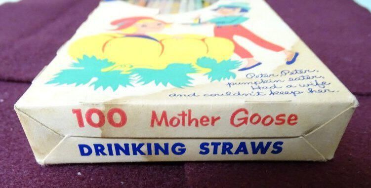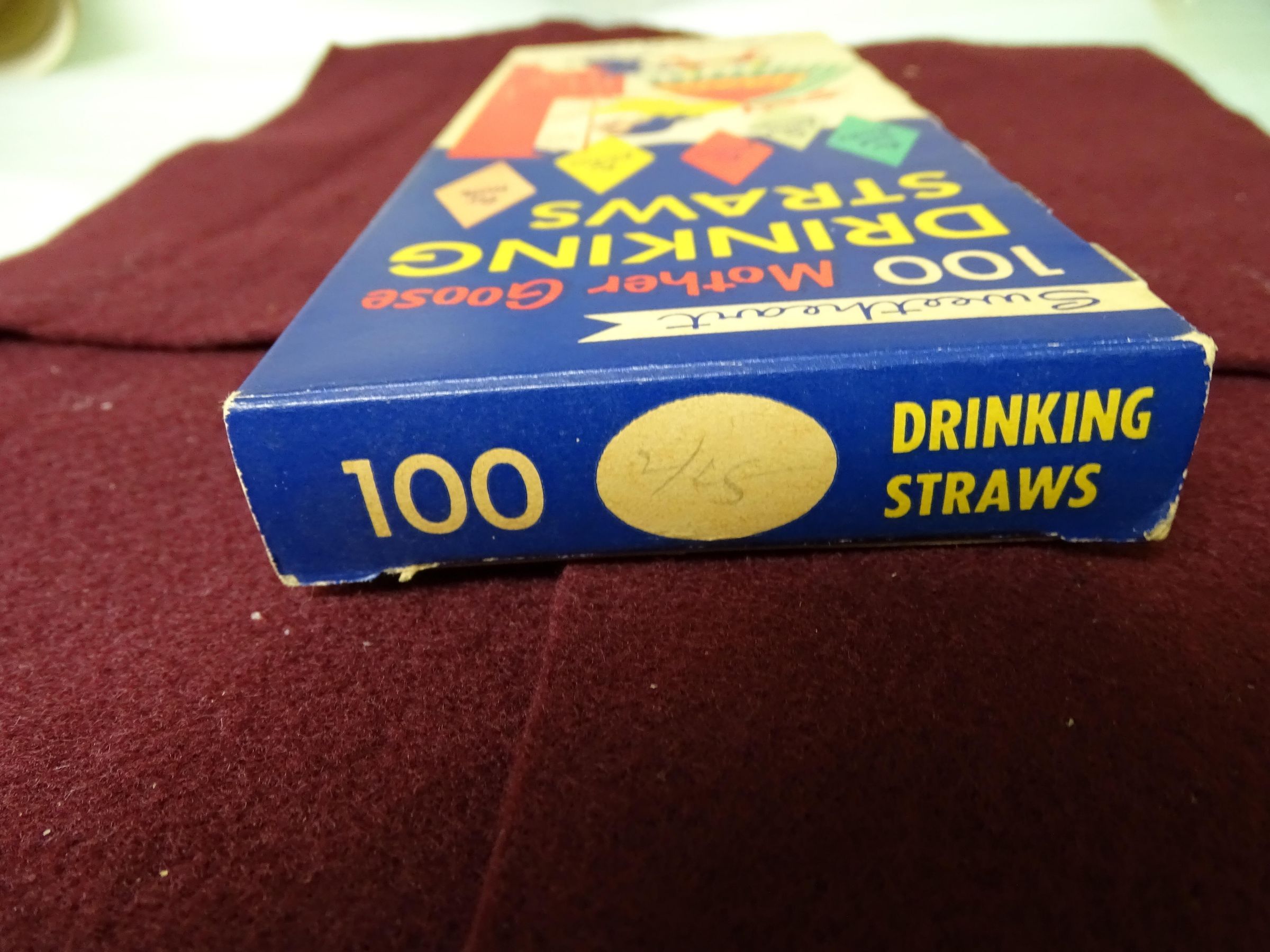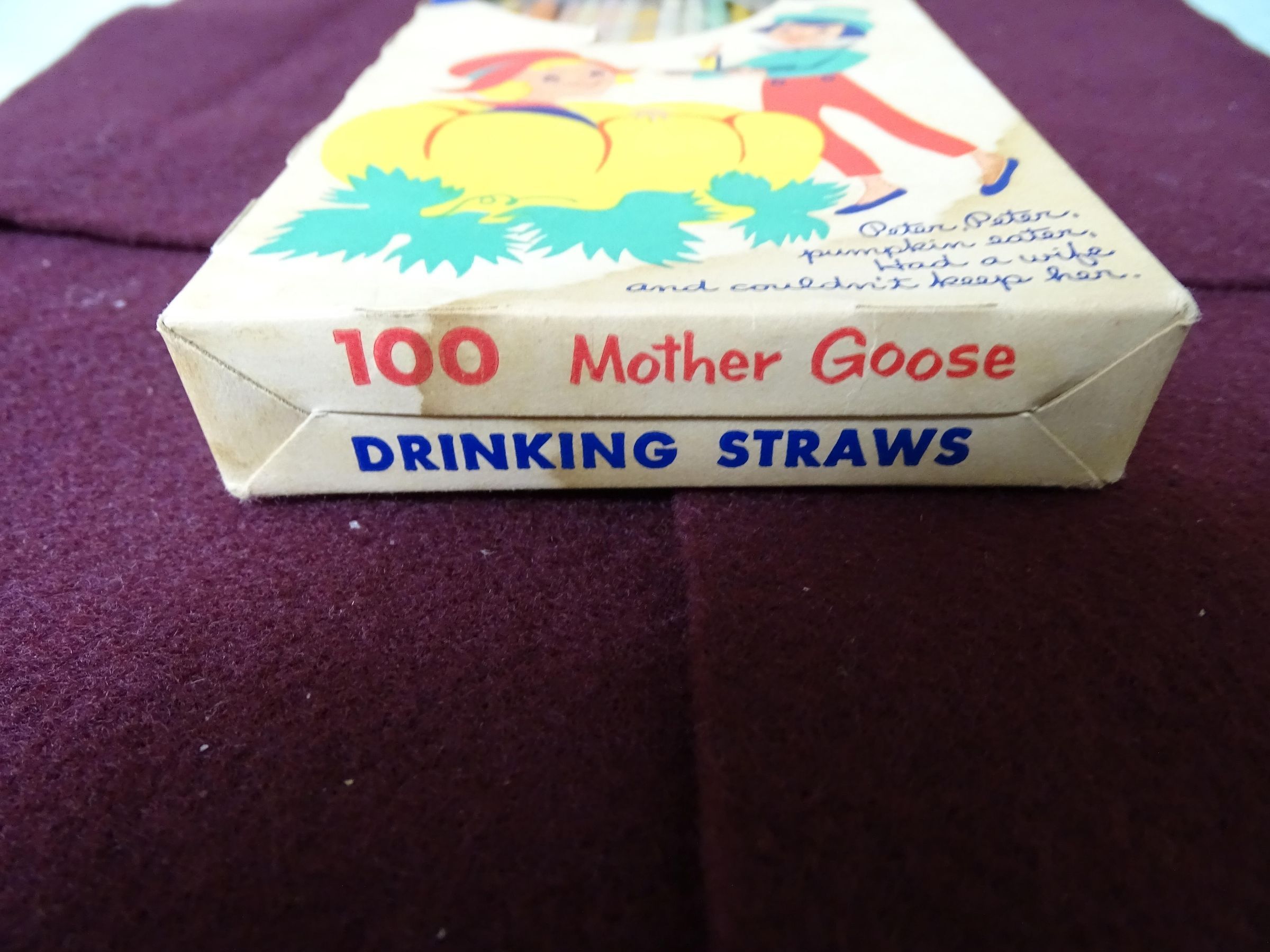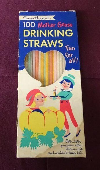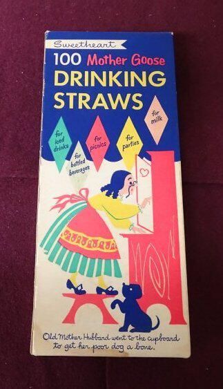 Cardboard box containing drinking straws. The box has a drawing on one side of Mother Goose and her cupboard with a dog and on the other side a drawing of Peter, Peter Pumpkin Eater and his wife. The writing on the first side is "Sweetheart 100 Mother Goose Drinking Straws, for iced drinks, for bottled beverages, for parties, for milk, Old Mother Hubbard went to the cupboard to get her poor dog a bone" . On the other side, "Sweetheart 100 Mother goose Drinking Straws, Fun for all!, Peter, Peter Pumpkin eater Had a wife and couldn't keep her." On one edge, "100 Drinking Straws for all types of drinks" On the other edge, "100 Mother Goose Drinking s\Straws, Coast Maid Products Co. Los Angeles 21, Calif, U.S.A." On one end, "100 Mother Goose Drinking Straws" On the other end "100 Drinking Straws" and in an oval in pencil 2/65" Inside the box are multicolored drinking straws.Made/Created