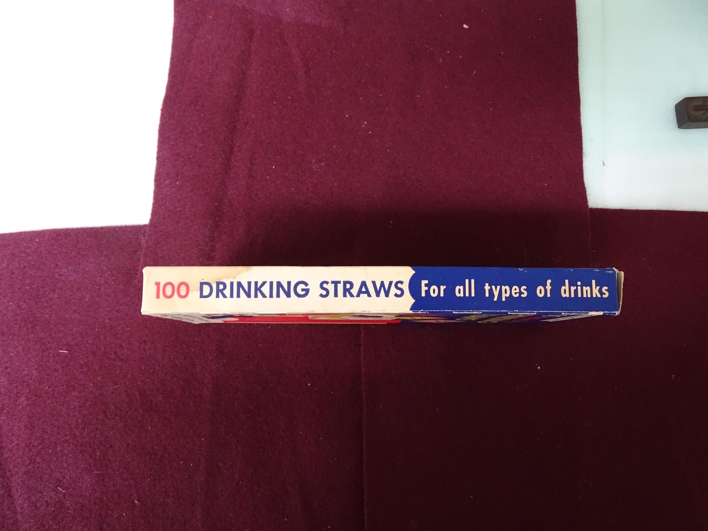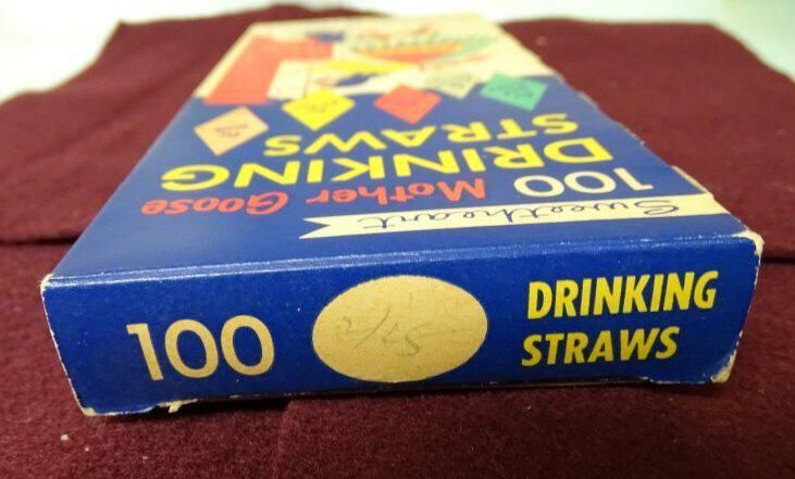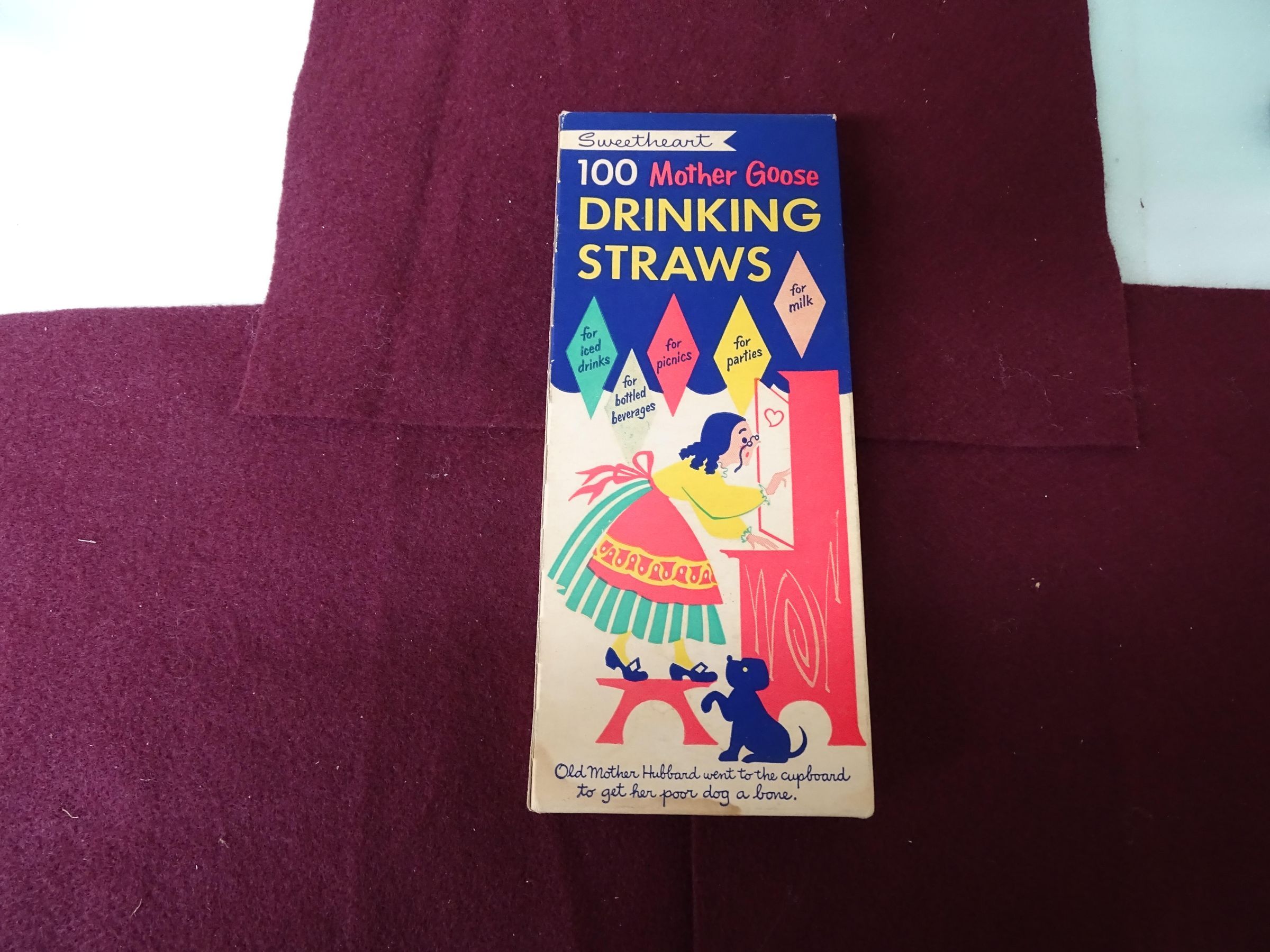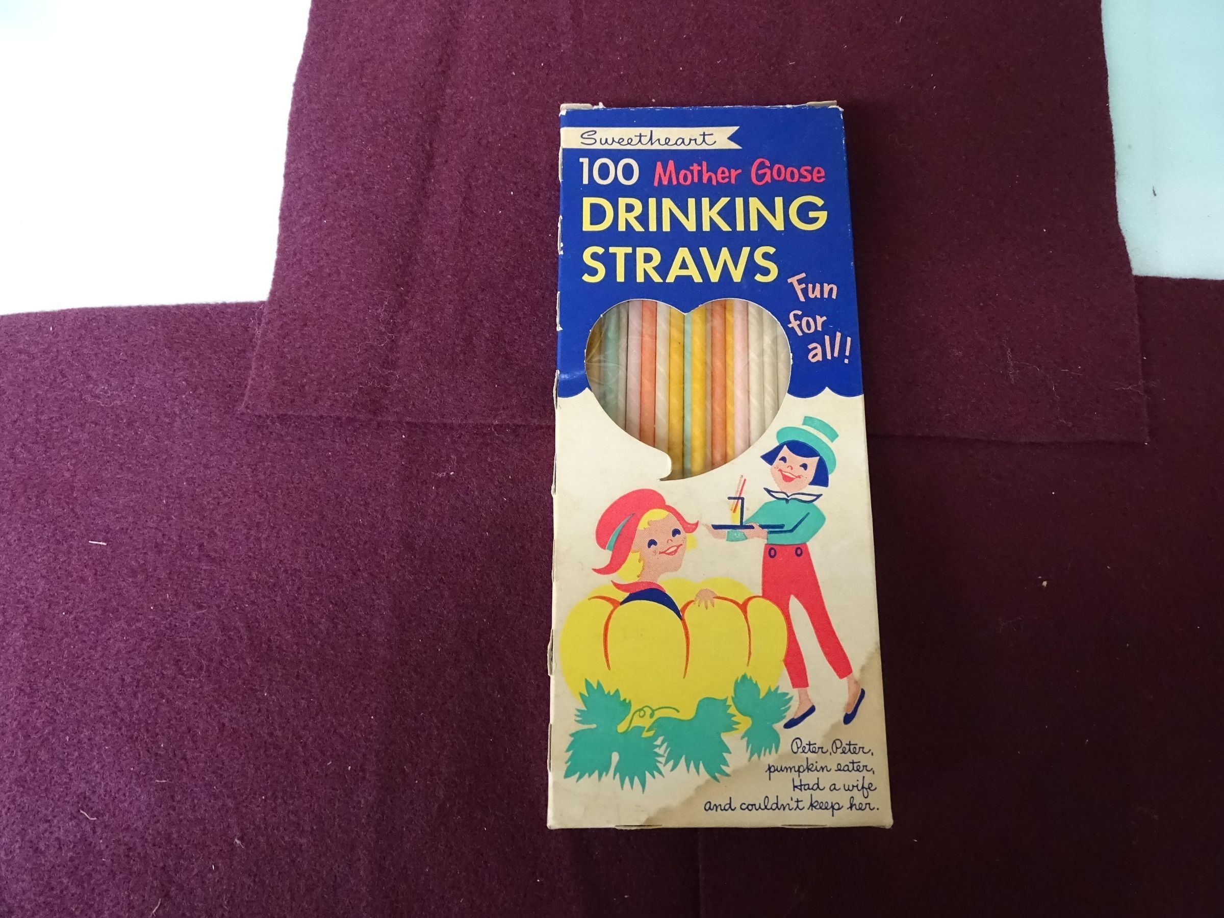 Cardboard box containing drinking straws. The box has a drawing on one side of Mother Goose and her cupboard with a dog and on the other side a drawing of Peter, Peter Pumpkin Eater and his wife. The writing on the first side is "Sweetheart 100 Mother Goose Drinking Straws, for iced drinks, for bottled beverages, for parties, for milk, Old Mother Hubbard went to the cupboard to get her poor dog a bone" . On the other side, "Sweetheart 100 Mother goose Drinking Straws, Fun for all!, Peter, Peter Pumpkin eater Had a wife and couldn't keep her." On one edge, "100 Drinking Straws for all types of drinks" On the other edge, "100 Mother Goose Drinking s\Straws, Coast Maid Products Co. Los Angeles 21, Calif, U.S.A." On one end, "100 Mother Goose Drinking Straws" On the other end "100 Drinking Straws" and in an oval in pencil 2/65" Inside the box are multicolored drinking straws.Made/Created