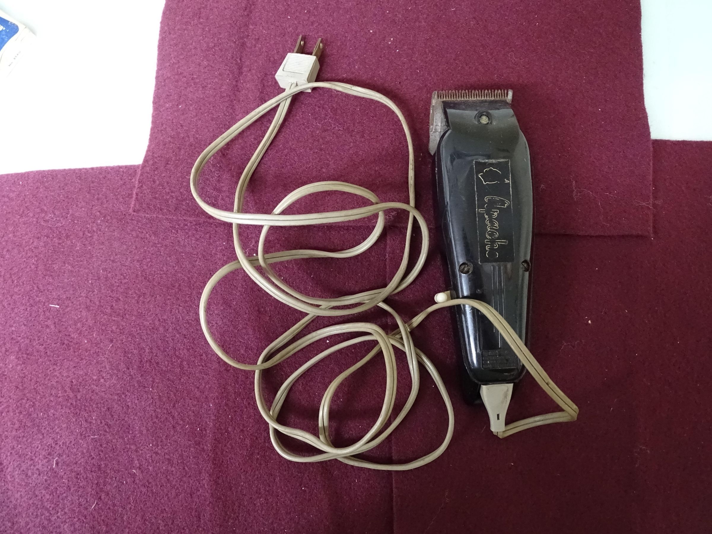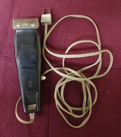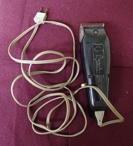 Plastic and metal electric hair clipper. A plastic (probably Bakelite) body has at one end a metal plate with stationary teeth across which another set of teeth move so as to cut hair. At the other end is an electrical cord and plug. On one surface of the body is the word "Apache" and an outline of an Indian's head with a feather. Near a toggle switch are the words "Off" and "On". Near the electrical cord end is the following in very small molded print "UL Model sc/mc, Pat'd Notice inside, 120 V AC, .32 A, Wahl Clipper Corp." On the other side of the body is stamped "B 64". On the metal plate are is stamped "Wahl O O O Solid".Made/Created