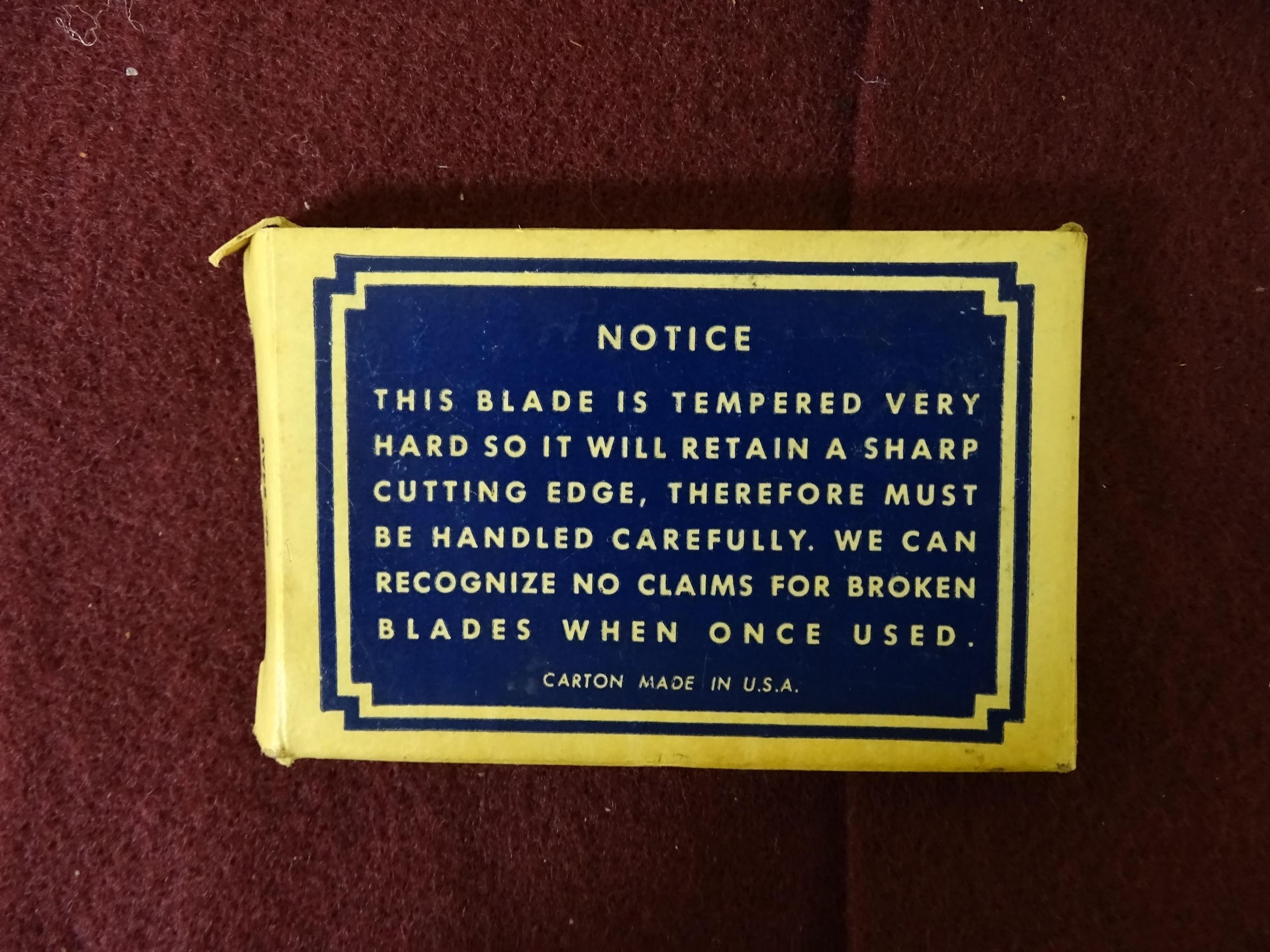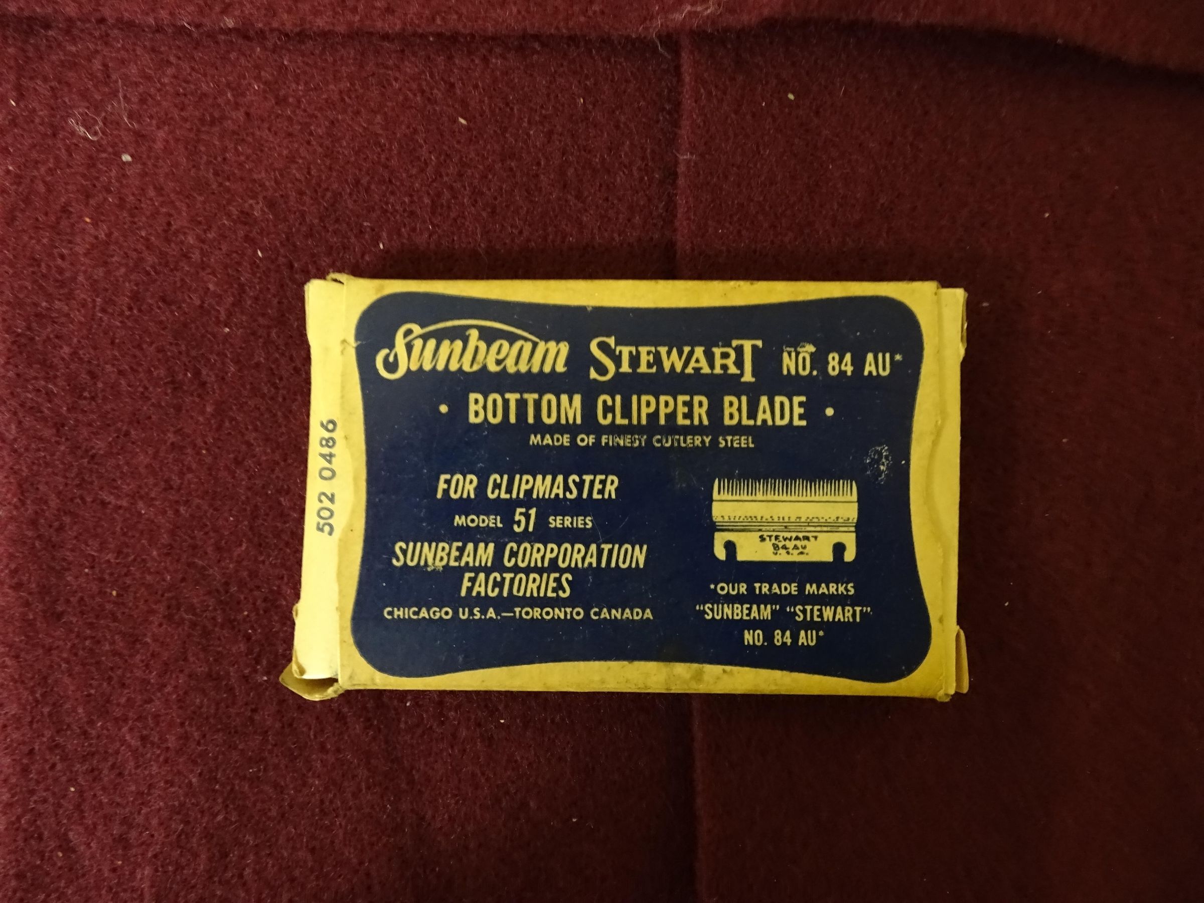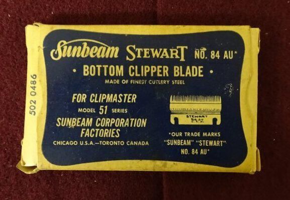 Metal bottom blade for Sunbeam Clipmaster hair clipper in a cardboard carton with an instruction sheet inside the carton. On the blade is "Sunbeam Stewart" and "84AU, U.S.A." The instruction sheet provides use instructions and at the bottom is "Sunbeam Corporation. 5400 Roosevelt Rd. Chicago, Ill. 60650, Printed in U.S.A. 500-3000744" On the carton is "Sunbeam Stewart No. 84AU, Bottom Clipper Blade, made of finest cutlery steel, for Clipmaster Model 51 series, Sunbeam Corporation Factories, Chicago U.S.A.-Toronto Canada, Our trade Marks 'Sunbeam' 'Stewart' No. 84AU" and a picture of the blade. On the back of the carton is "Notice this blade is tempered very hard so it will retain a sharp cutting edge. therefore must be handled carefully. We can recognize no claims for broken blades when once used. Carton made in U.S.A." On one end of the carton is "No. 84AU". On the other end is a flap with "502 0486" on the tab part, and "No.84AU" on the end with "USB 4.35" in pencil.Made/Created