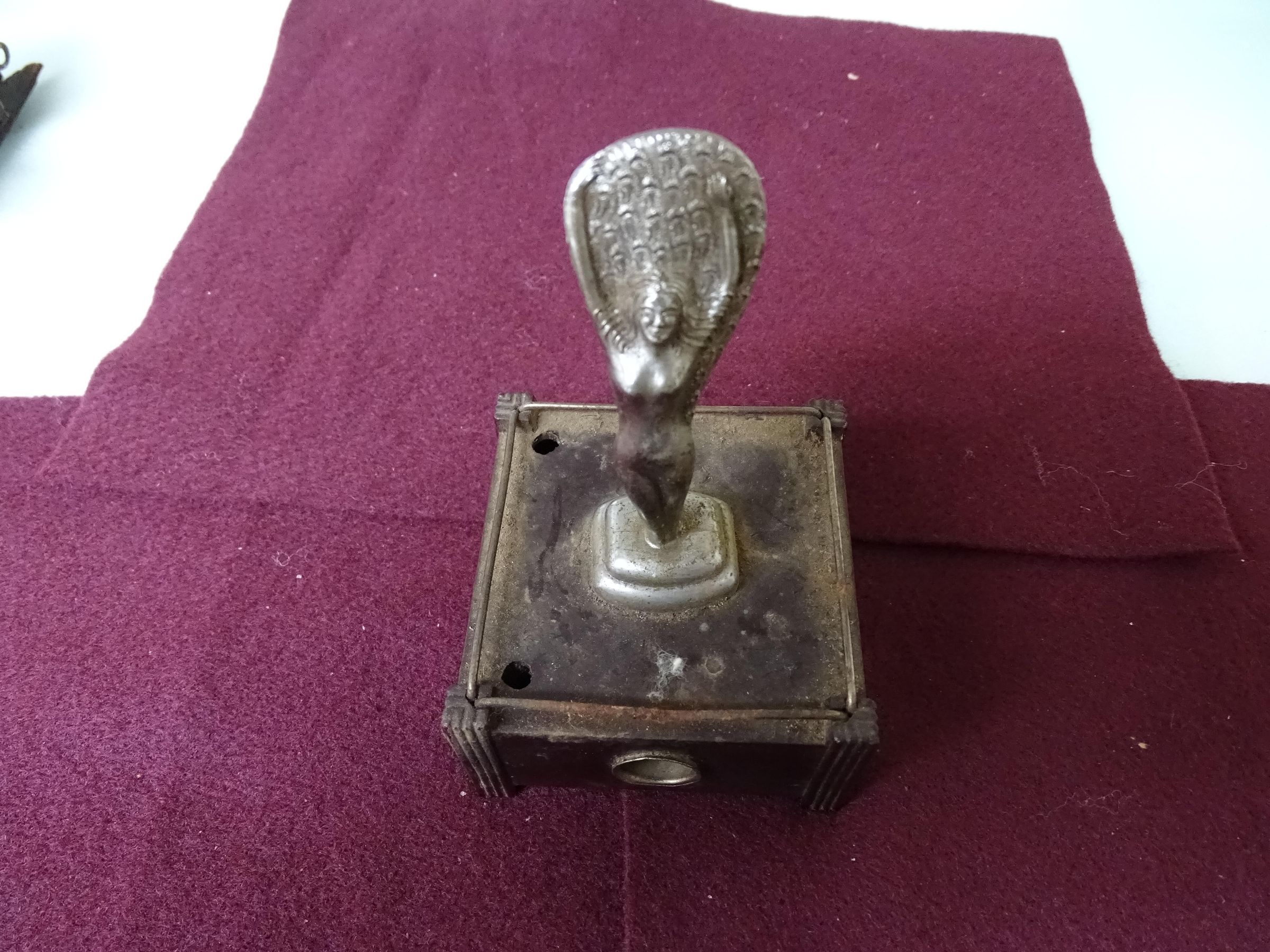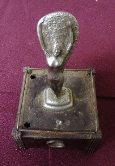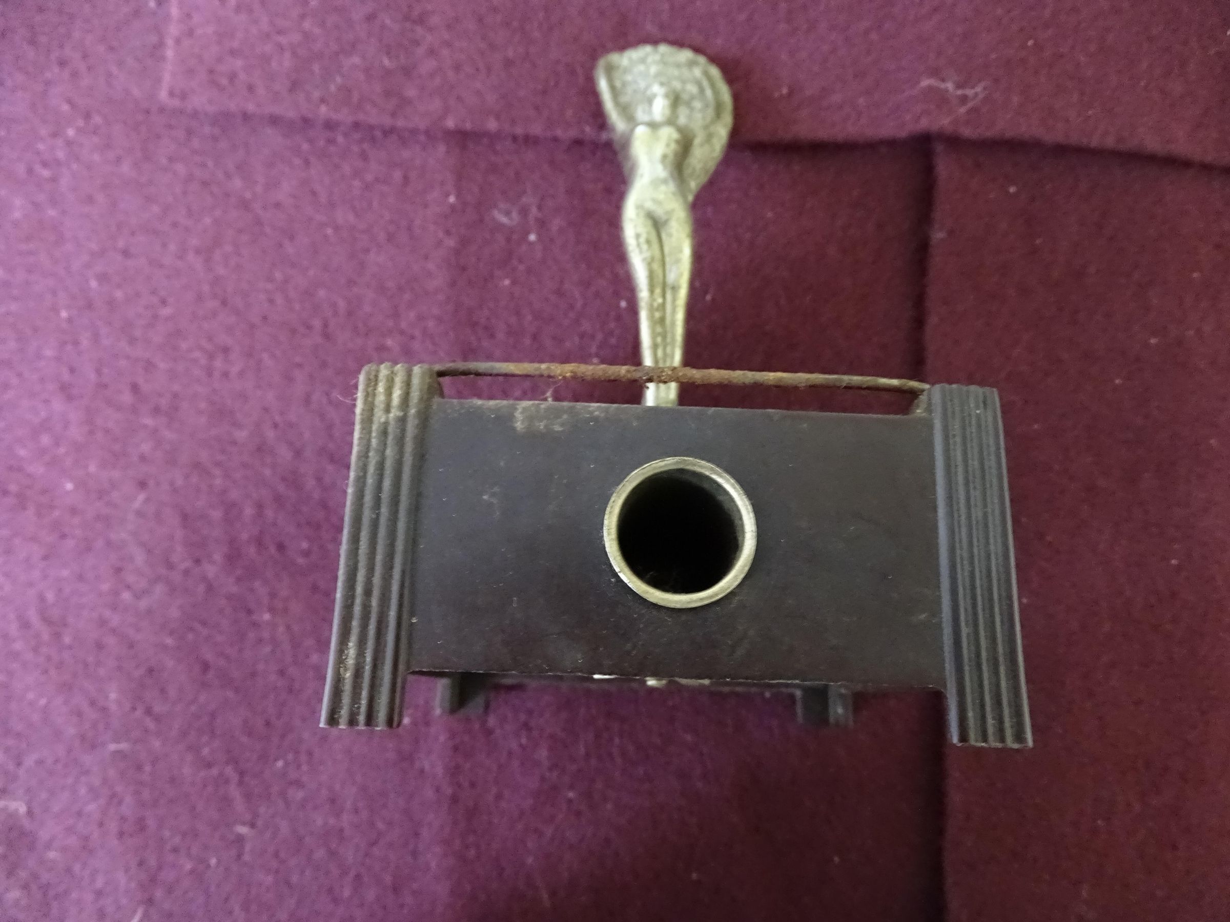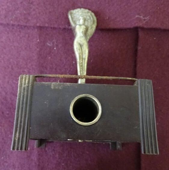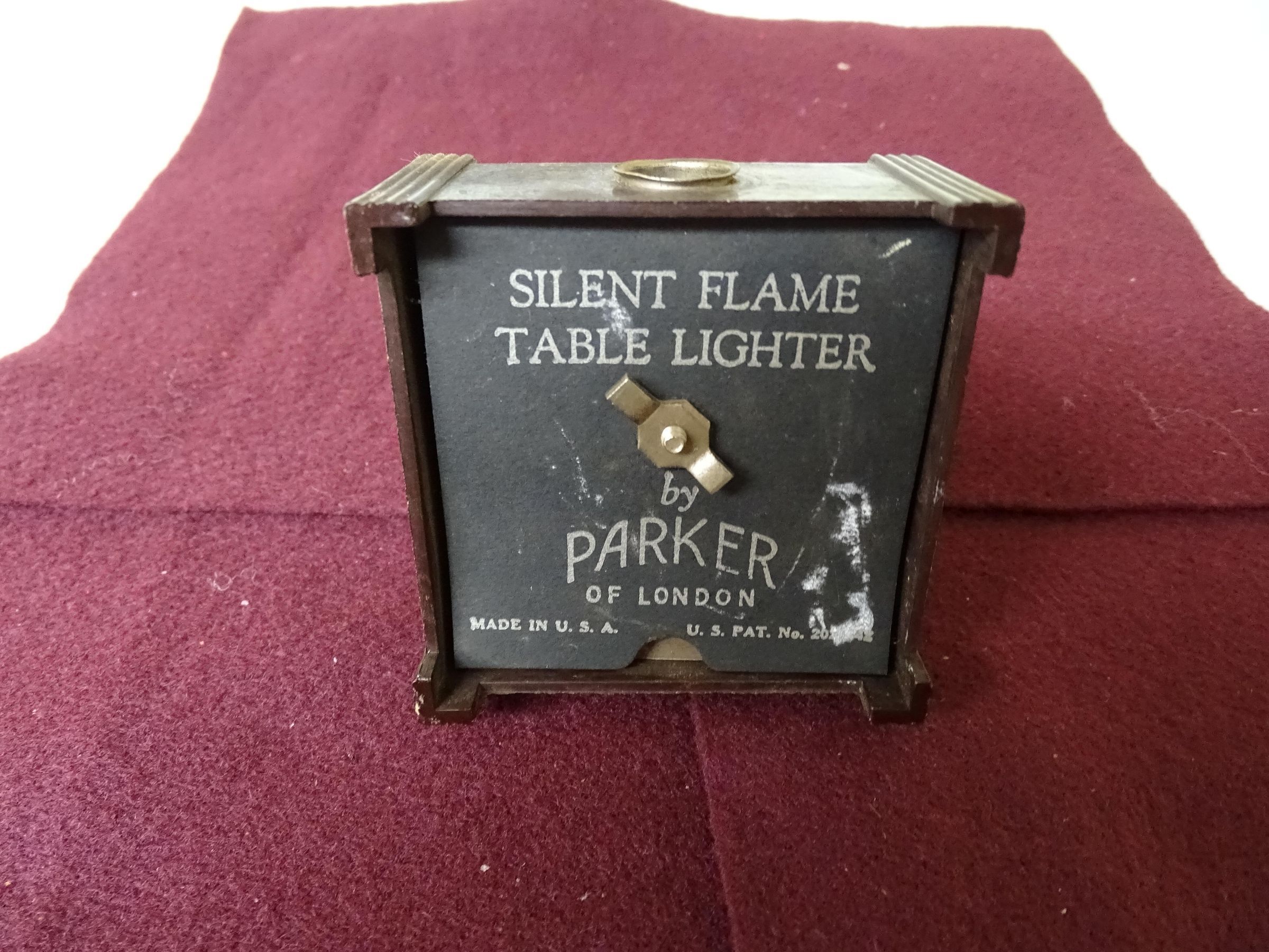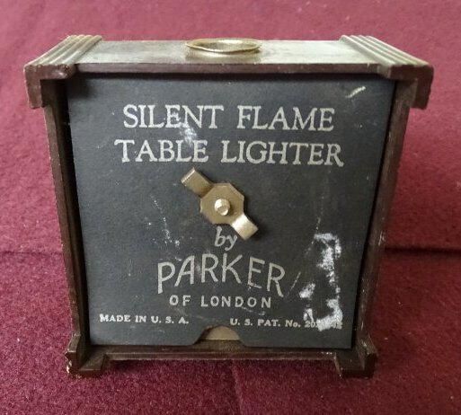 Metal and plastic cigar lighter. The base is a Bakelite square box with small legs and with wires along each top edge. There is an opening on one side of the base into which a cigar or cigarette can be inserted. Inside the box are receptacles for batteries to power an electrical resistance element. On a plastic sheet held onto the bottom of the base by a screw and nut is "Silent Flame Table Lighter by Parker of London. Made in U.S.A., U.S. pat. No. 2020142". On the top of the base is a Chrome figure said to represent fan dancer Sally Rand.Made/Created