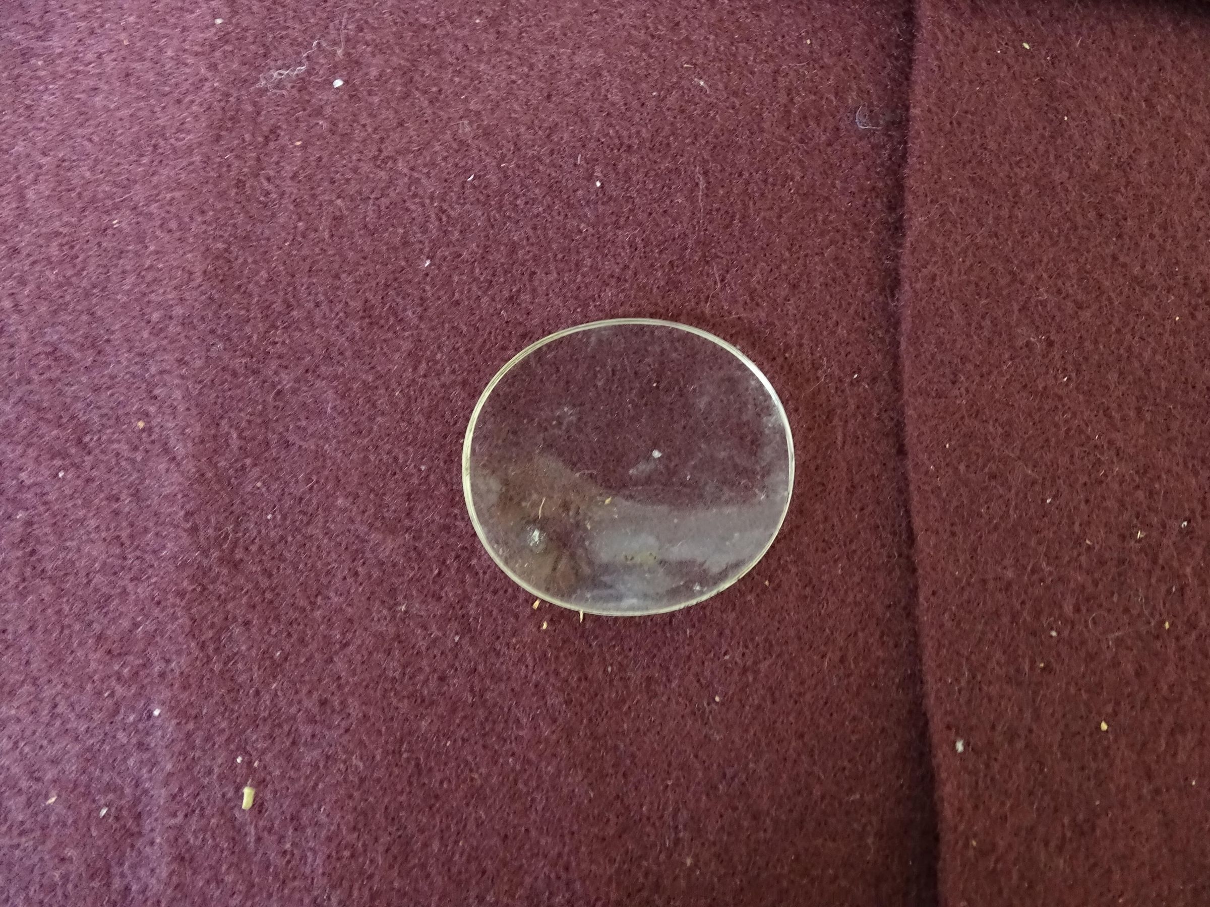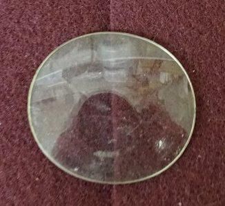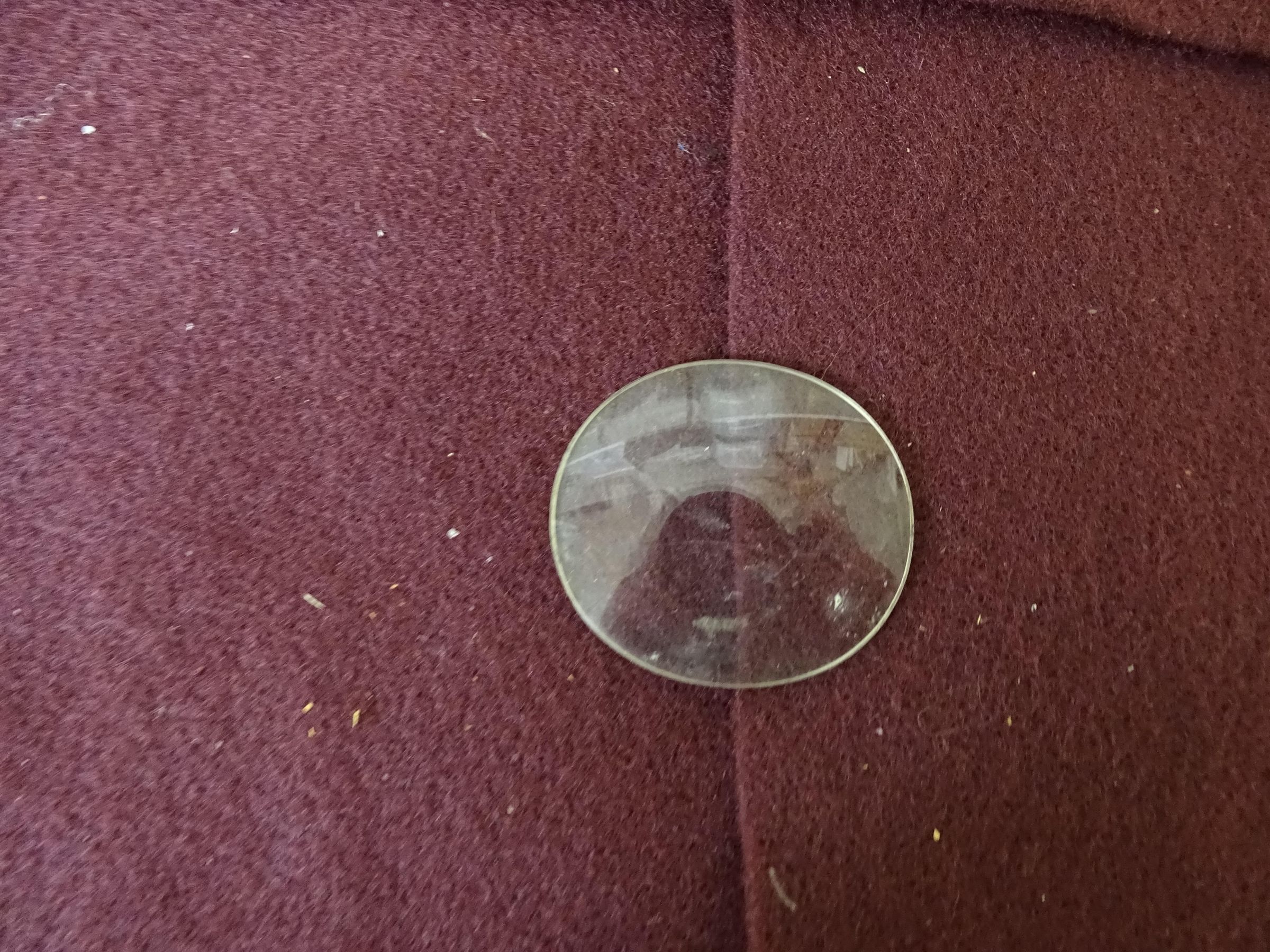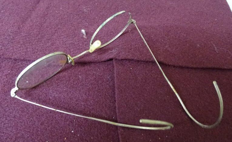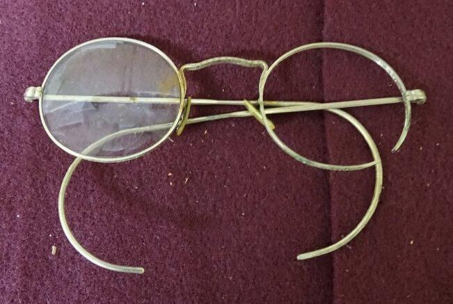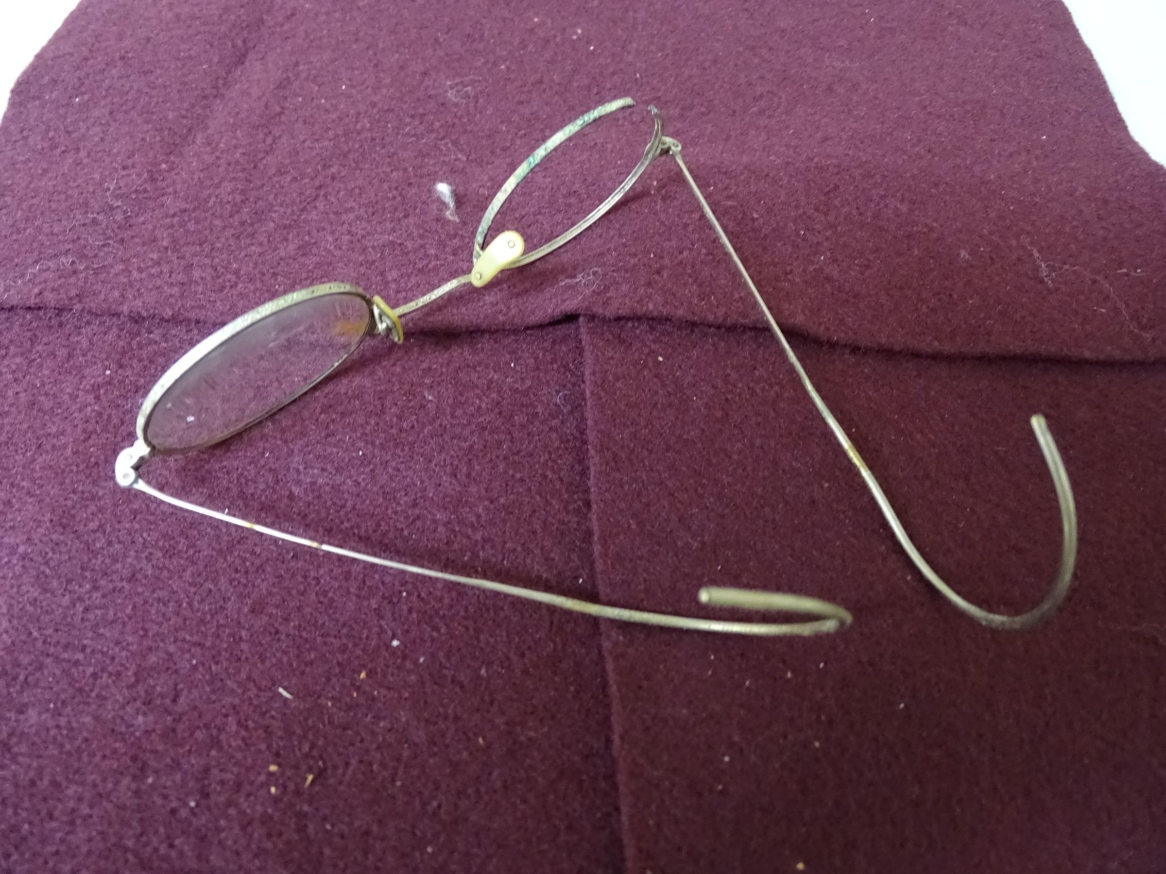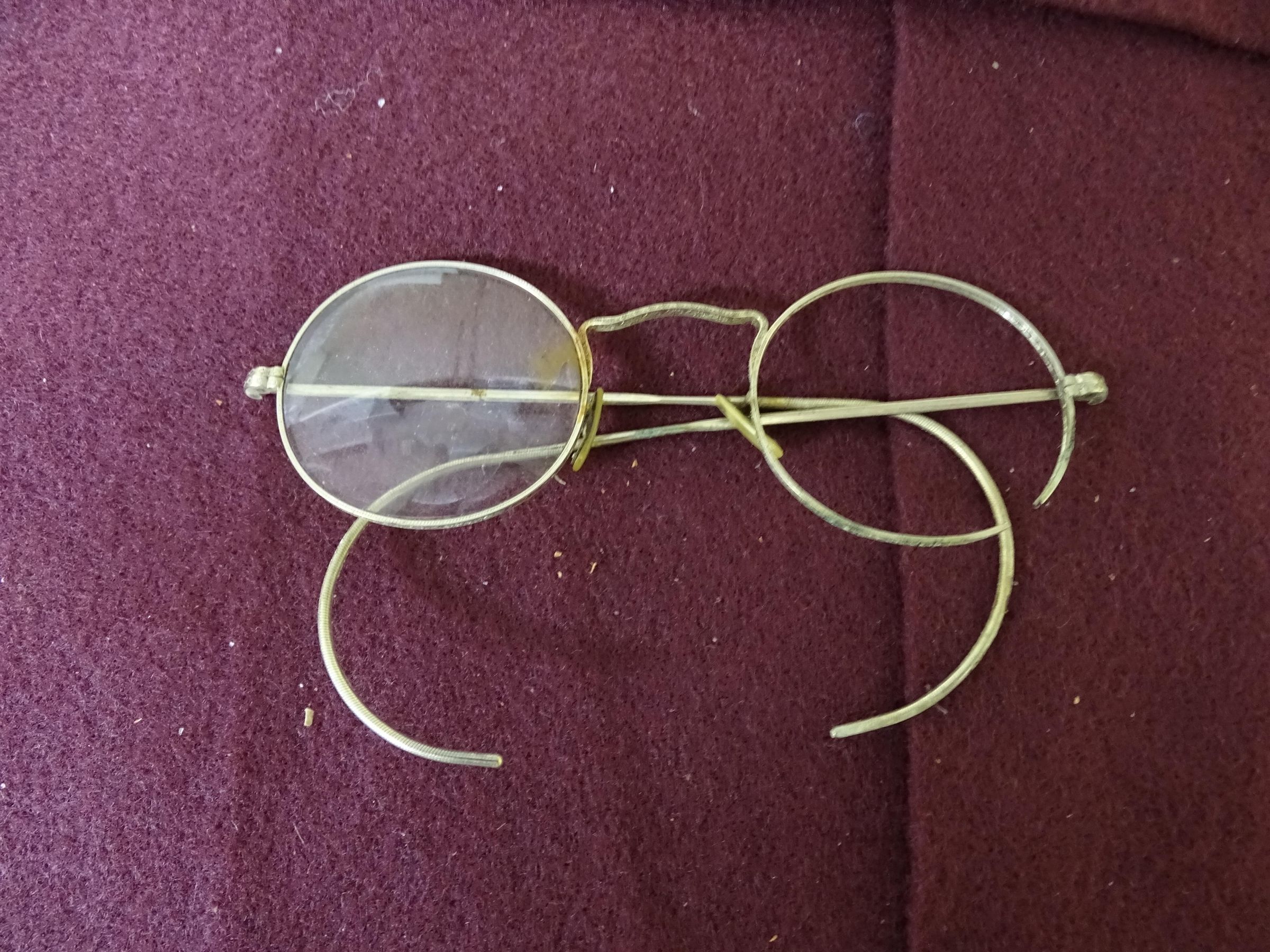 Metal eyeglass frame (A) with glass bifocal lenses. The frame is decorated on all pieces and appears to be gold plated with a low percentage. One of the circular pieces holding the lens is broken and the lens (B) has fallen out.Made/Created
