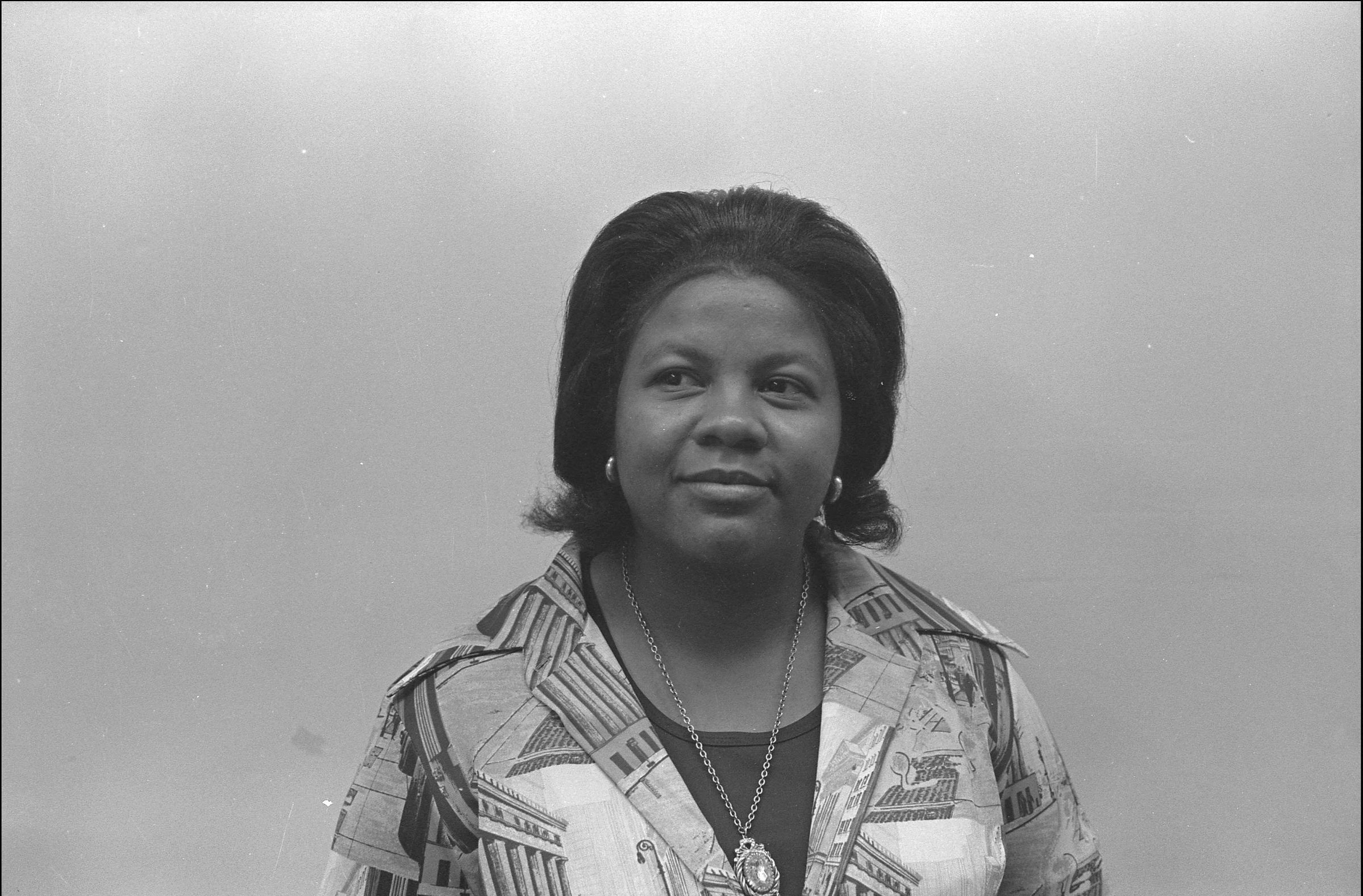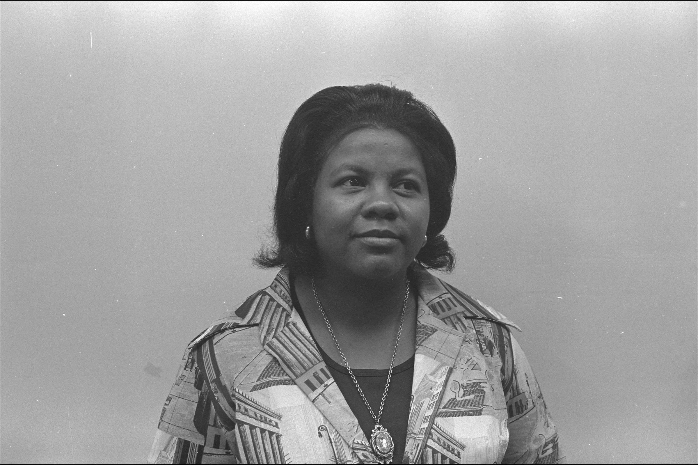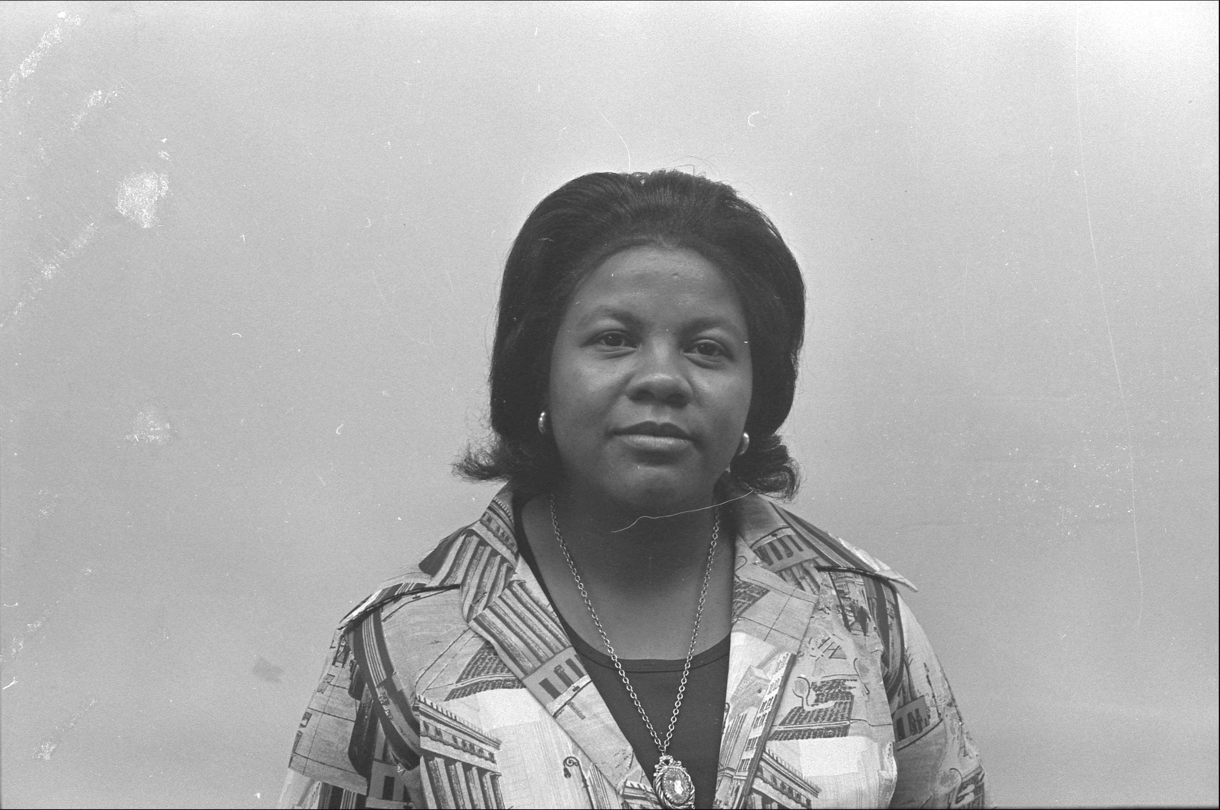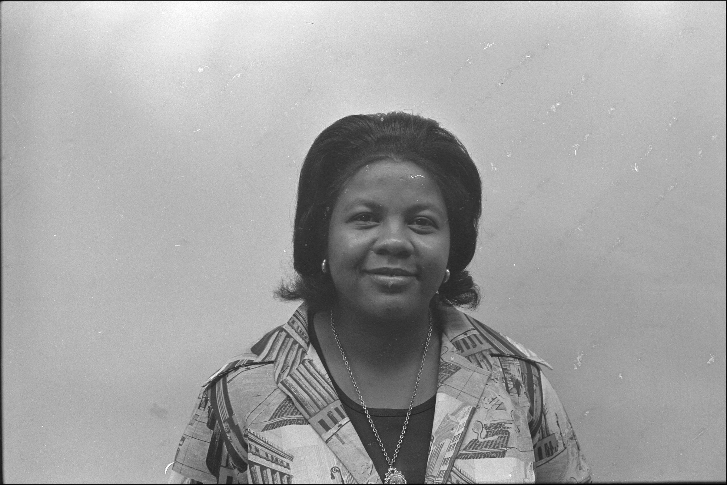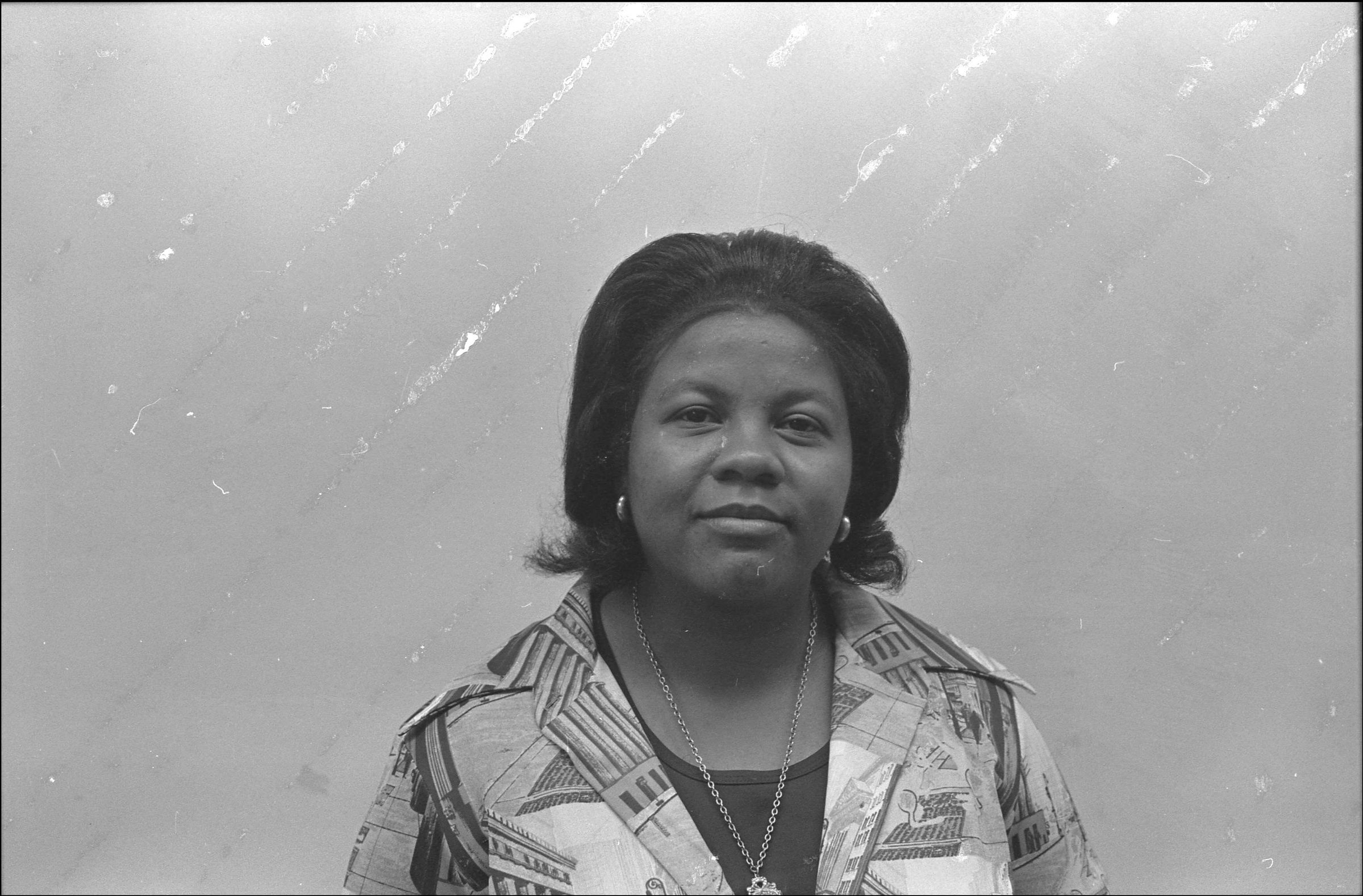 Thelma Jackson, 1976. This single black and white film negative strip was created for the Lacey Leader newspaper. These images show a woman (Thelma Jackson) with medium-length hair wearing a button-up shirt over a crewneck top posing for photos. She is also wearing a necklace. She is shown from the mid-chest up. She is facing directly toward the camera and not smiling. Images 8-12 are nearly identical to each other.