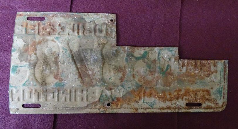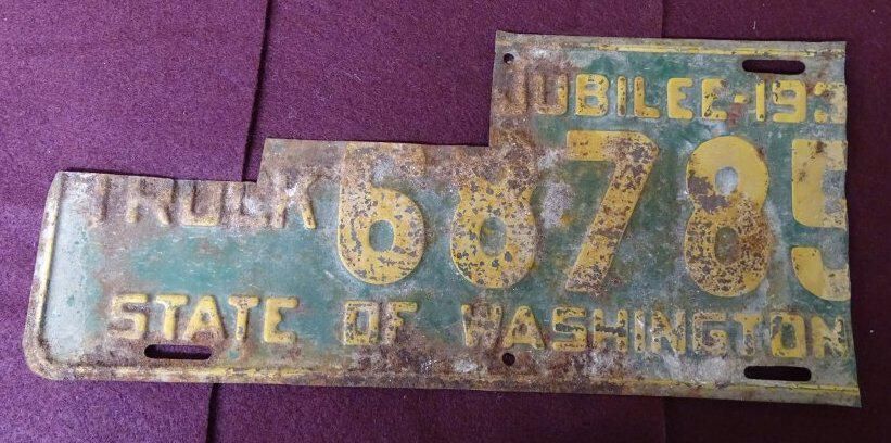 Metal Washington State 1939 truck license plate. Pieces of the plate have been removed so that it is incomplete. The plate has yellow painted numbers and letters on a green background. This plate recognizes the 50th anniversary of statehood and is a "Golden Jubilee" issue. The information on the plate is "Jubilee - 193, truck, 68785, State of Washington".Made/Created