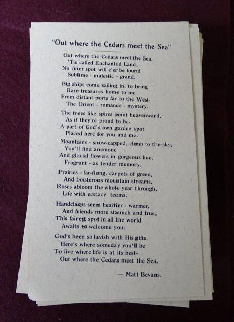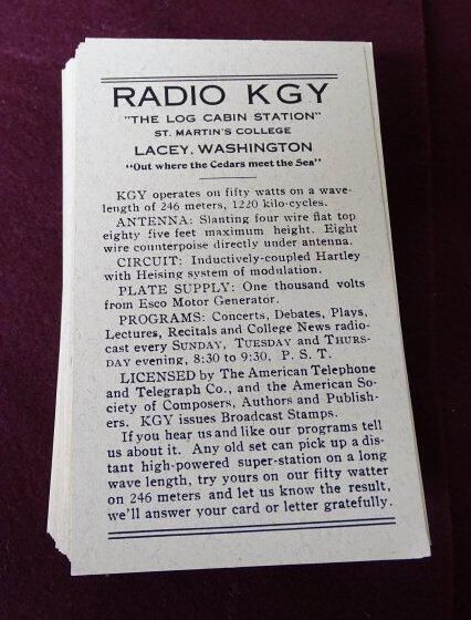 Buff colored paper cards, inside a plastic envelope, that provide information regarding radio station KGY. There are more than 100 cards. On the face of each card is printed "Radio KGY 'The Log Cabin Station' St. Martin's College, Lacey, Washington, 'Out where the cedars meet the sea'". Also provided on this side of the card is information as to frequency, antenna, circuit, plate supply, programs, and licensing. On the reverse side is a poem by Matt Bevans entitled "Out where the Cedars meet the Sea".Made/Created