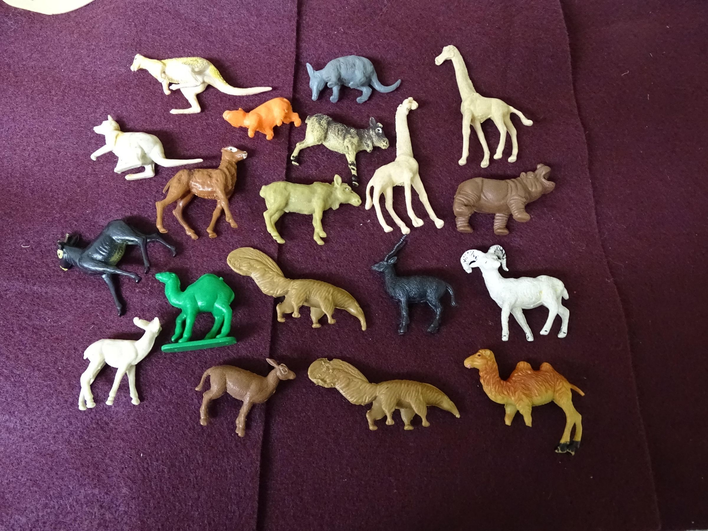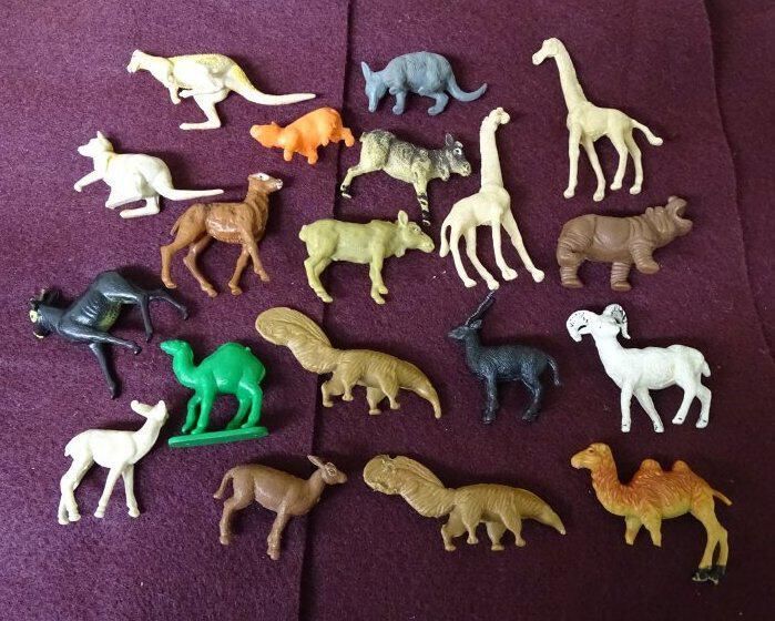 Brown plastic Noah's Ark toy with light brown deck piece, brown cabin, and light brown roof plus 19 plastic animals of various colors. Some of the animals are paired and some are singles. some of the animals have missing legs.Made/Created
