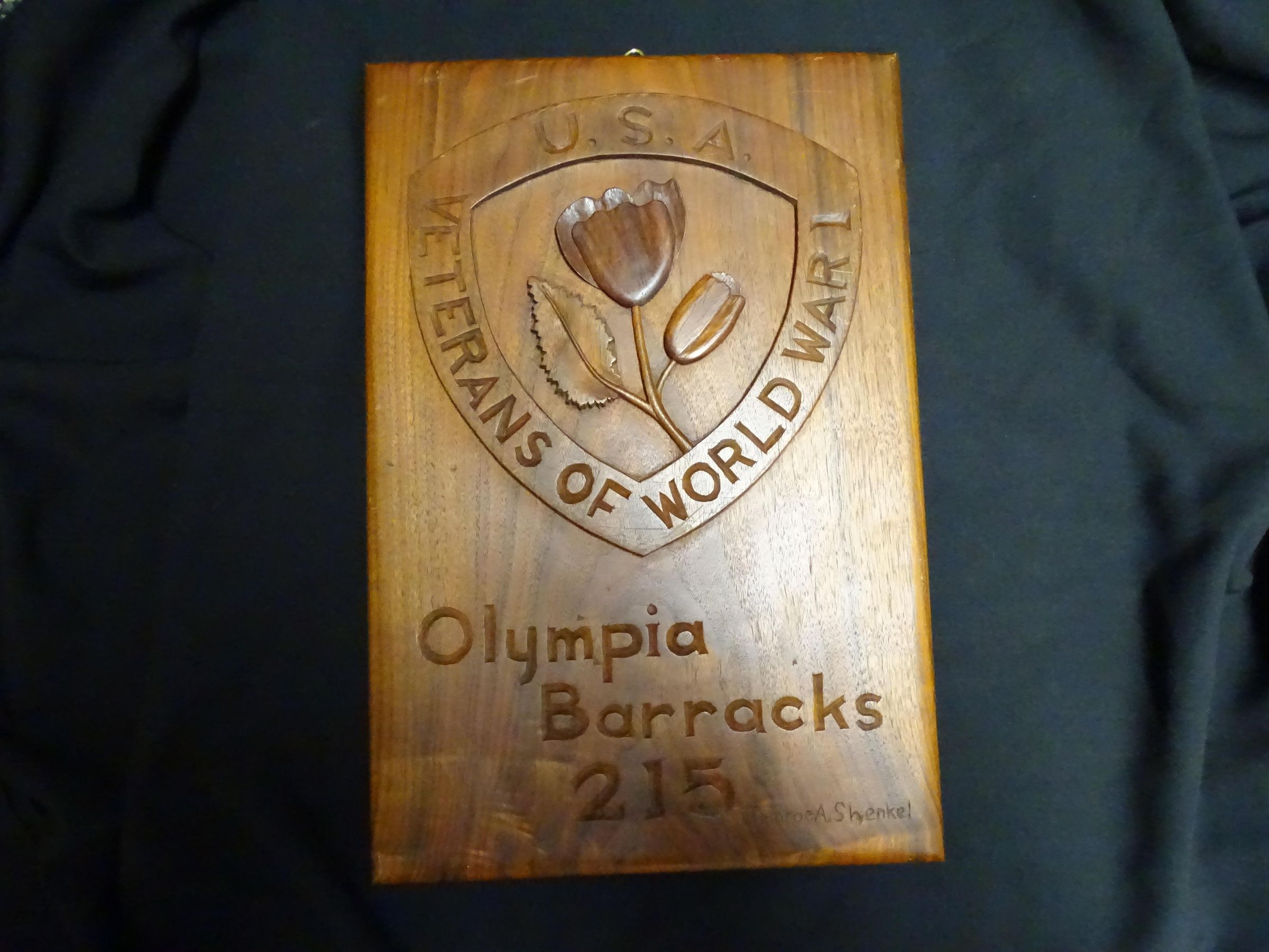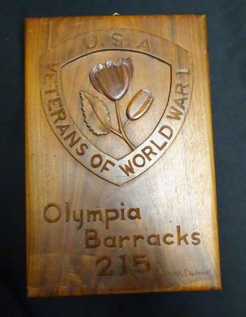 Wooden plaque. On the front is a raised band in the shape of a curved triangle. On the band are the words "U.S.A. Veterans of World War I". Inside the triangle is carved three leaves on a stem. Near the bottom of the plaque is carved "Olympia Barracks 215". In the lower right had corner is scratched "Monroe A. Shenkel".