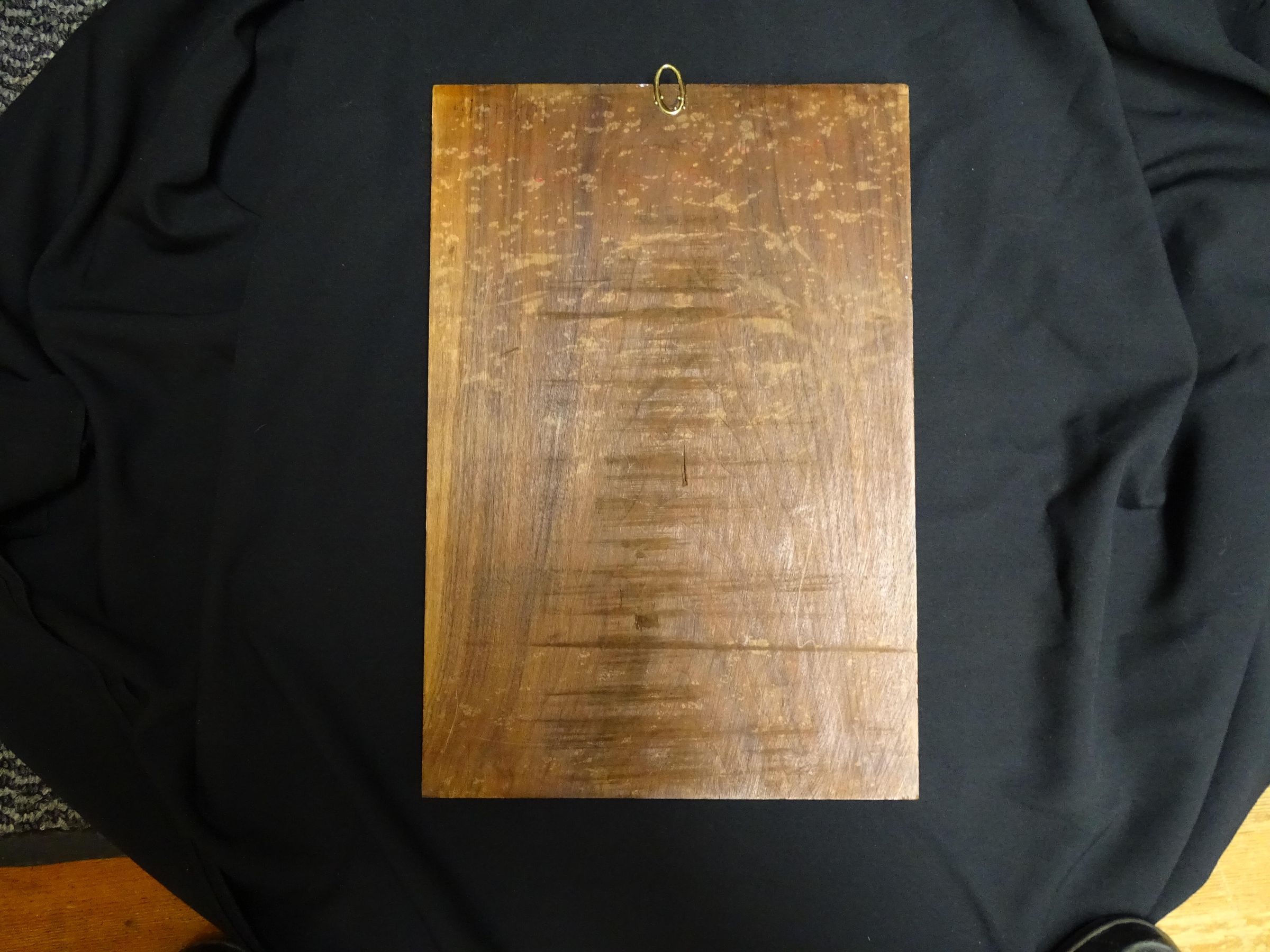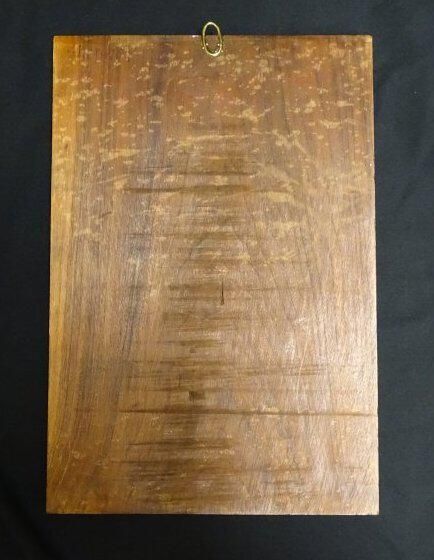 On the back is a brass oval extending above the top for hanging. Written on the back in black is "Shenkel". In red is "Carved by Monroe A. Shenkel Sept 1972, age 77 yrs 1058820". Something else may have been written in pencil and scratched off.Made/Created