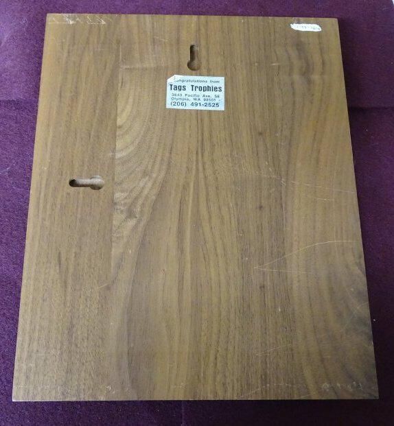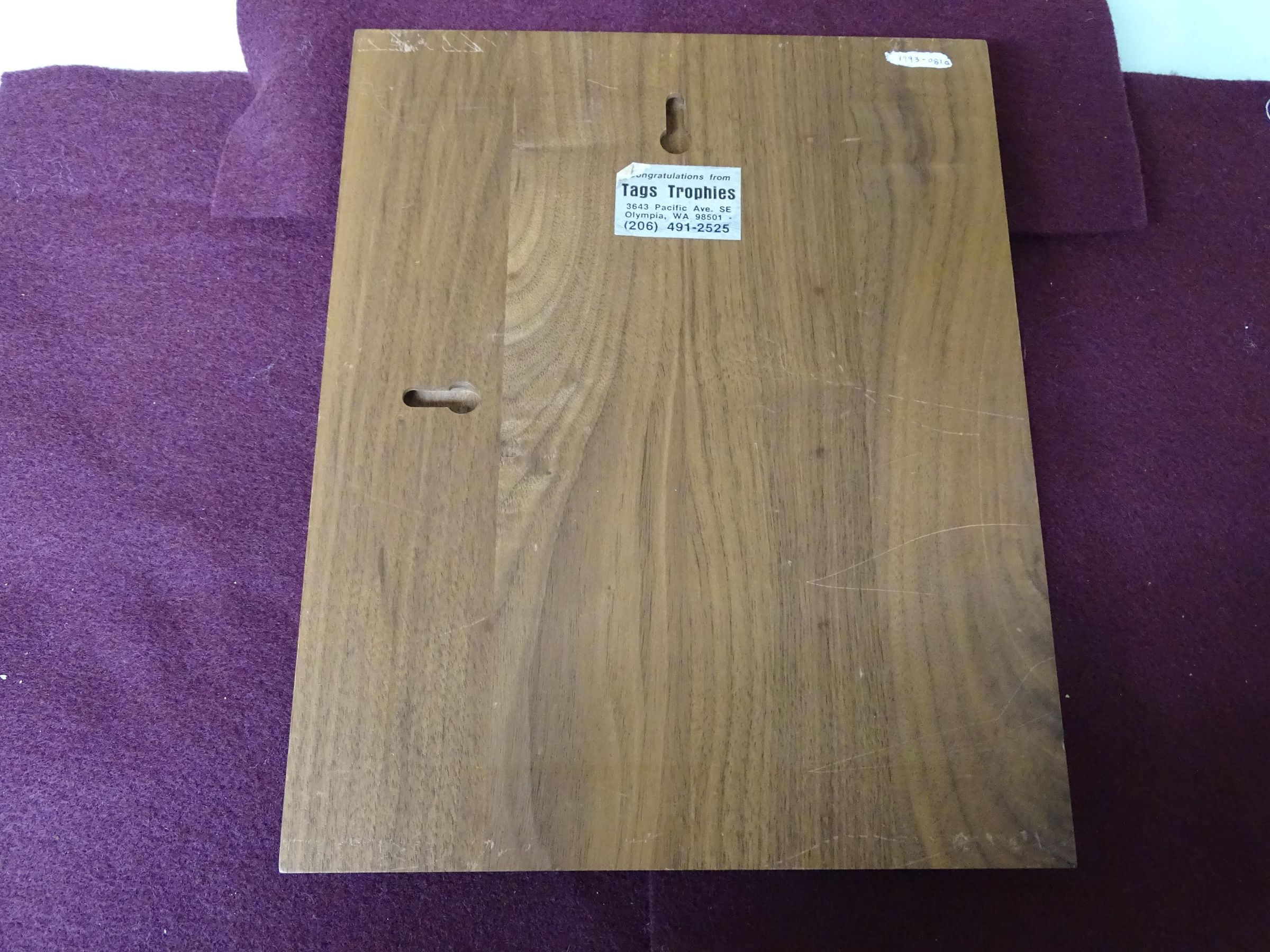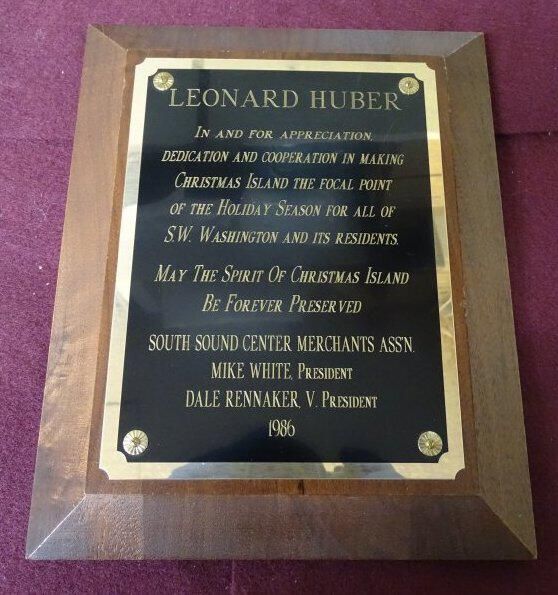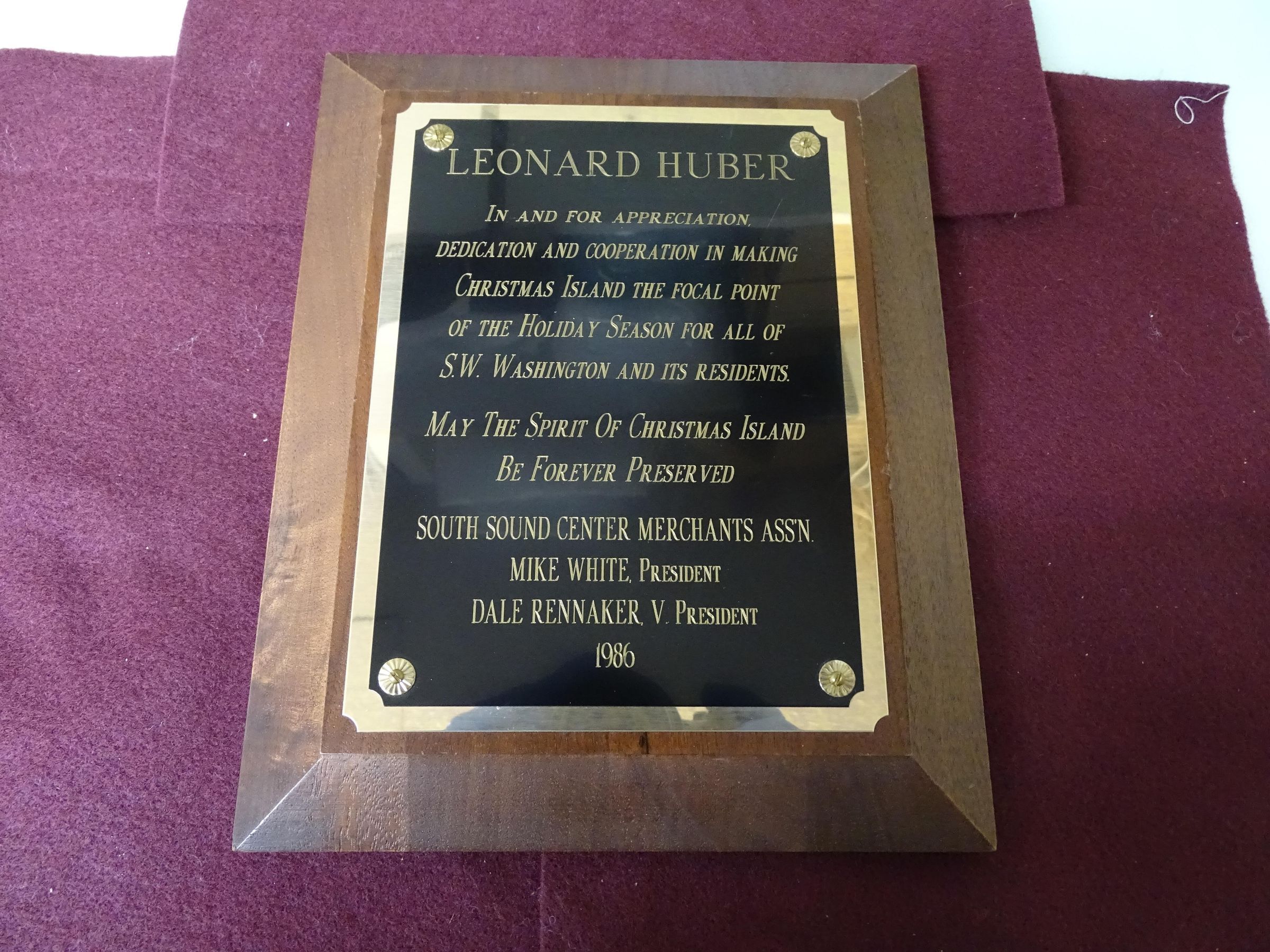 Wood and brass plaque. A plate of brass painted black is fastened to a natural colored brass plate which is fastened to a wooden square with beveled sides. On the top plate are the words "Leonard Huber, In and for Appreciation, Dedication and Cooperation in making Christmas Island the focal point of the Holiday Season for all of S.W. Washington and its residents. May The Spirit of Christmas Island Be Preserved. South Sound Center Merchants Assn. Mike White, President, Dale Rennaker, V. President, 1986". On the back is a paper sticker giving the name and address of "Tags Trophies".Lexicon