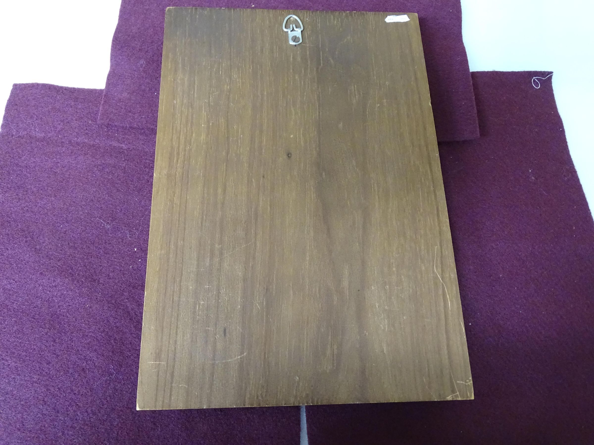 Wood and brass plaque. A brass plate with artistic bends at the top and bottom is fastened by screws to a rectangular piece of wood. On the brass plate are the words "Presented to Leonard Huber in the name of the people of Thurston County in appreciation of his many years of dedicated service in proclaiming the Christmas Message of joy and peace in sight and sound. Christmas Island, December 11, 1975". On the back is a metal ring for hanging.Lexicon