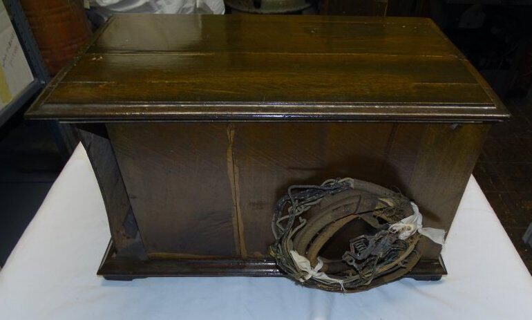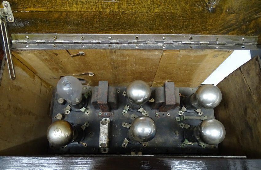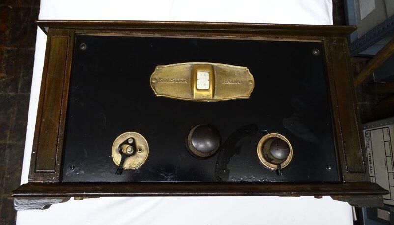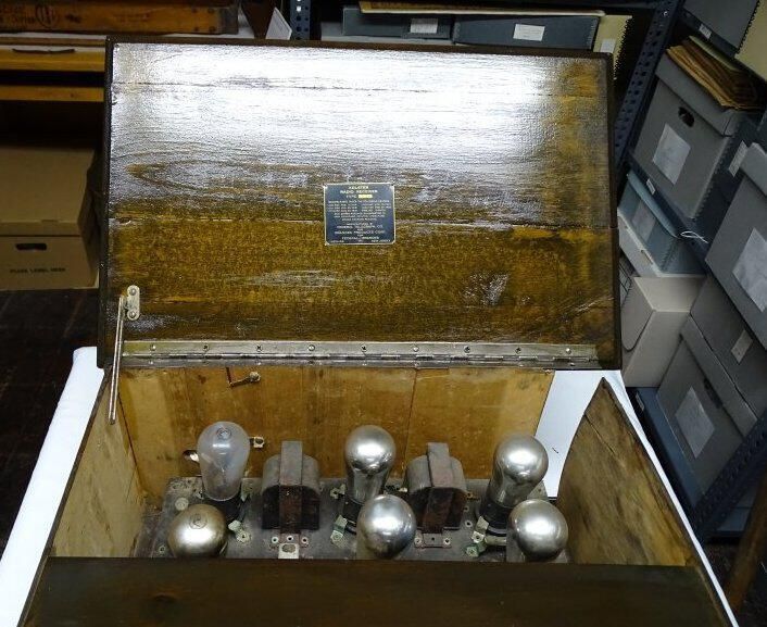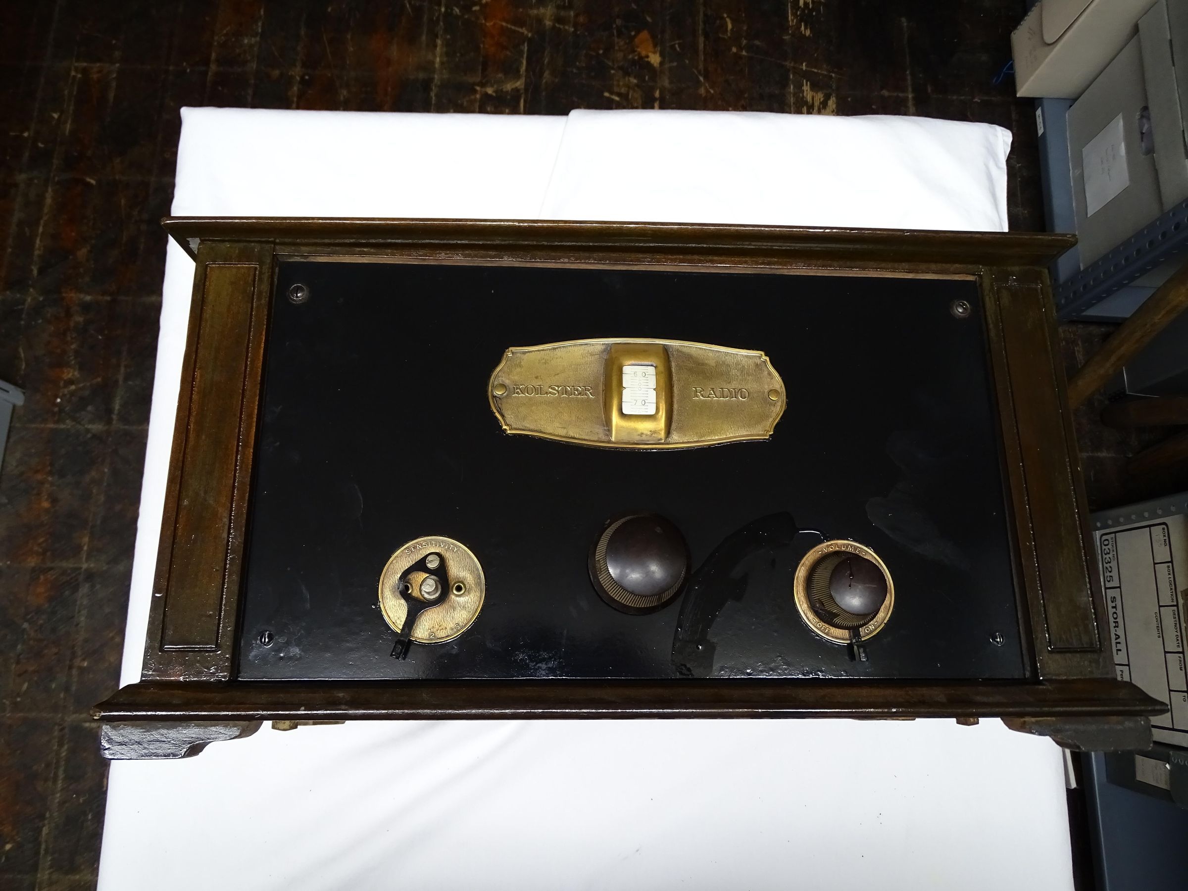 Wooden cabinet containing a 6-tube battery powered radio. There is a hinged lid on the cabinet, and inside is a metal frame containing electronic parts. On the top of the metal frame are 6 vacuum tubes and other parts such as a fuse, condenser, coil, etc. On the front of the cabinet is a brass plate that says "Kolster Radio" and a dial showing the frequency that the radio is tuned to. There are also three knobs: one is labeled "volume" and "On" and "Off", a second knob is labeled "sensitivity" and has the numbers 1, 2, and 3. The center knob has no label. Extending from the back of the cabinet is a cable enclosing various wires for attachment to an antenna, to ground, and to the battery contacts. Inside the lid is a metal plate the has the words "Kolster Radio Receiver 6 D", 6 patent numbers and patent information, and the words "manufactured by Federal Telegraph Co." and "Brandes Products Corp for Federal Brandes, Inc., Newark, New Jersey".Dimensions