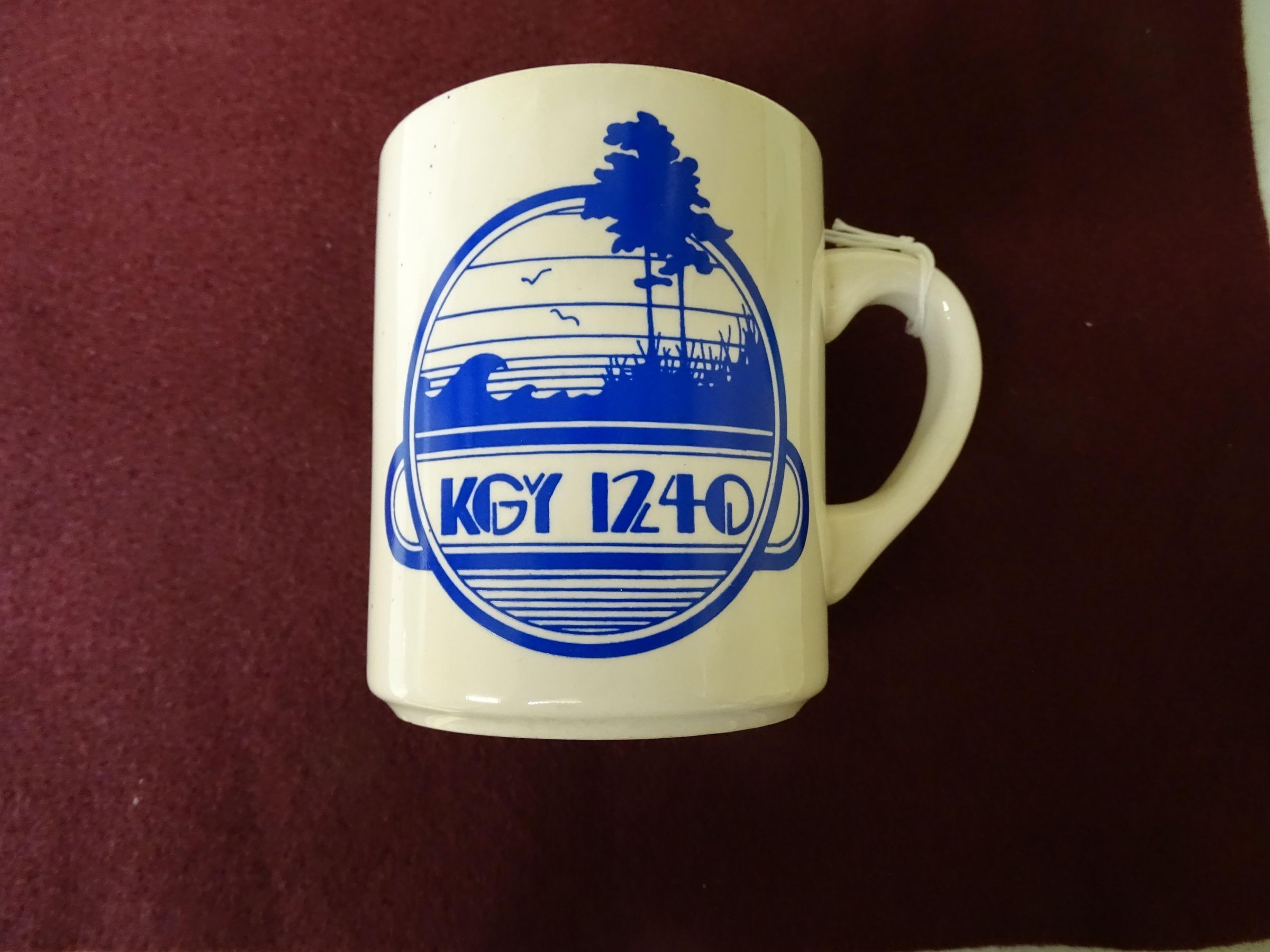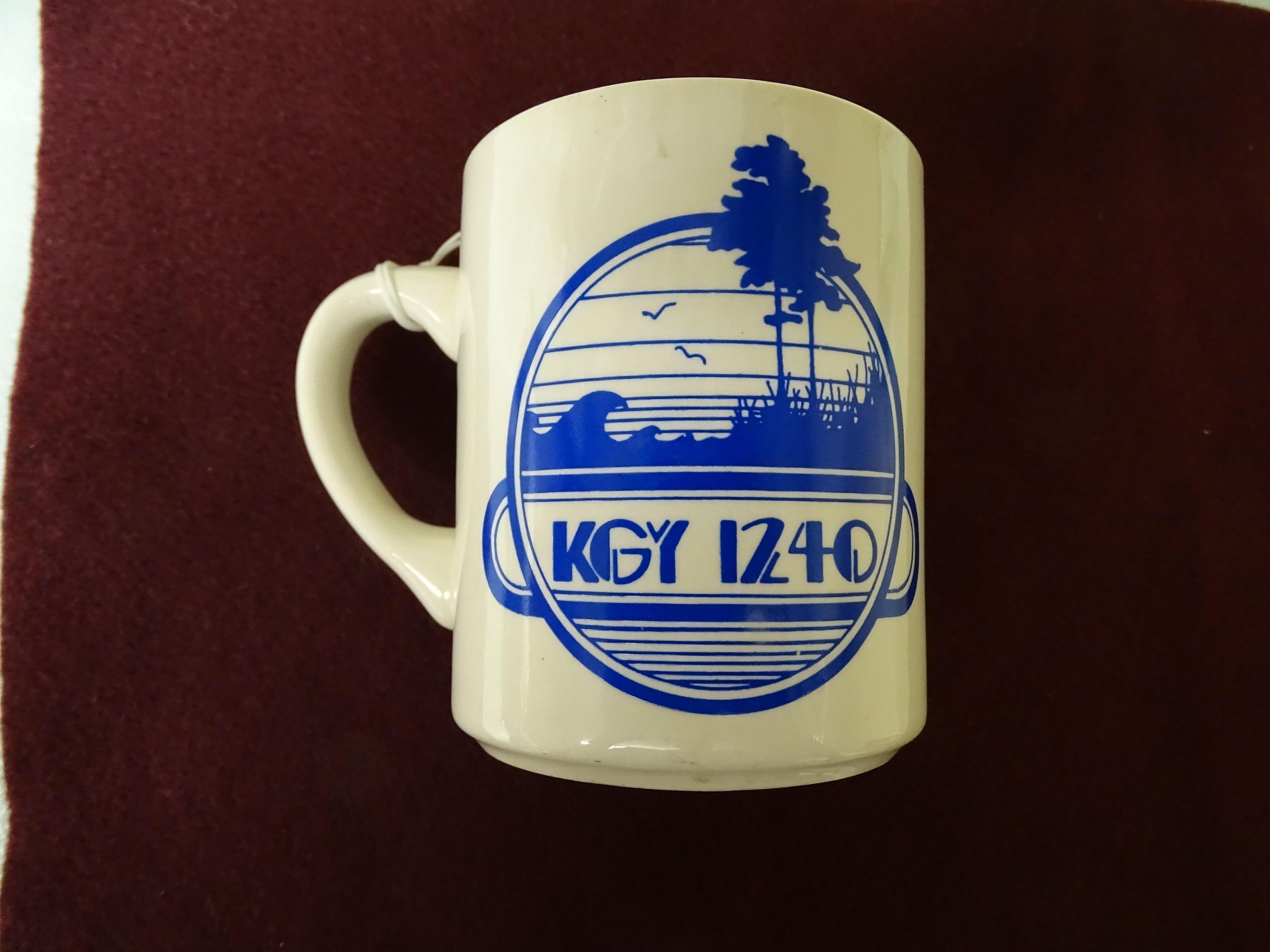 White ceramic coffee mug with blue images. The mug is cylindrical with a U-shaped handle on one side. There are identical images in blue on opposite sides. The image has a circle, waves, trees, birds, and a loop within which is the words "KGY 1240"Made/Created