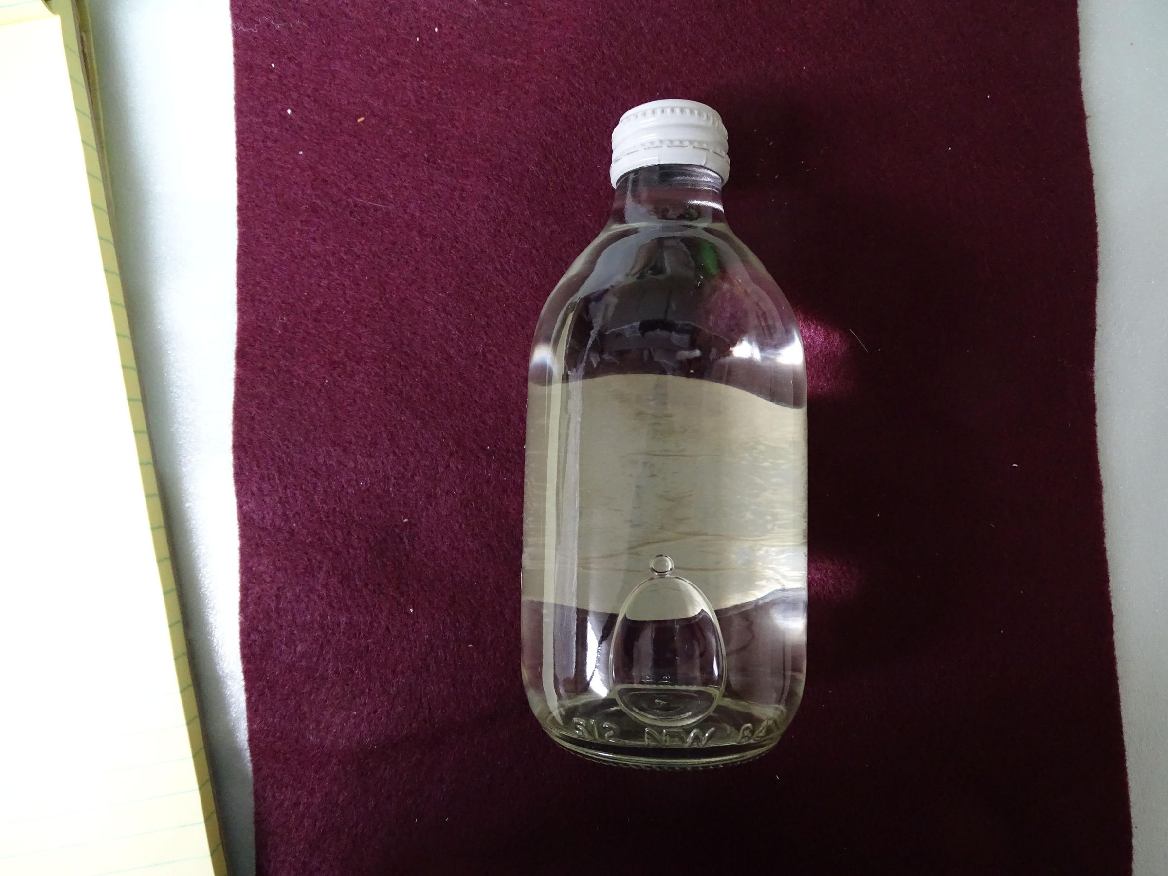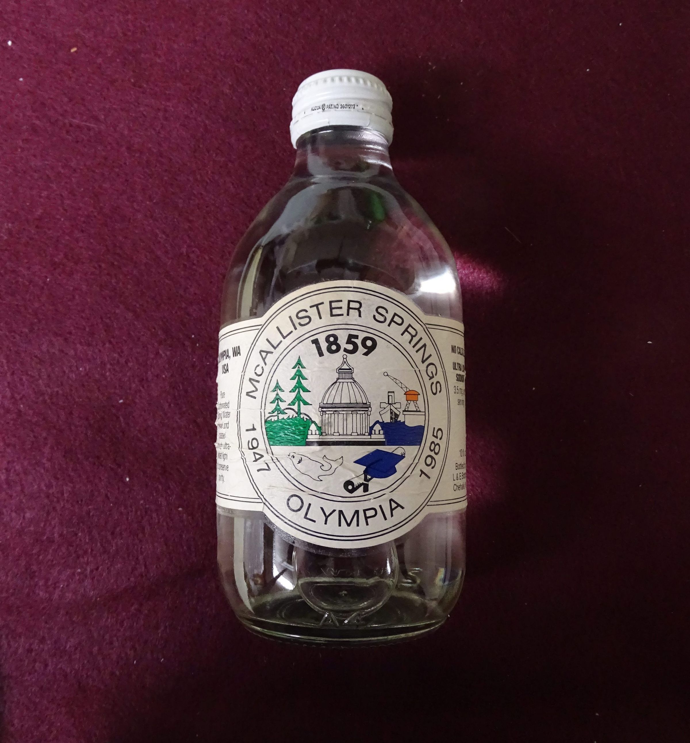 Clear glass 10-oz bottle with metal screw cap and containing water. The cap is a white color and has in black print "Alcoa" and a patent number. A paper label has inside a circle, an image of the capital dome, trees, a ship and loading crane, a fish, a graduation cap and a diploma. Also inside the circle is "1859". Around the circle is "McAllister Springs, 1947, 1985, Olympia". On the left side of the label is "Olympia, WA USA, Pure Carbonated Water filtered and passed through ultra violet light to preserve purity". On the right side is "No calories, Ultra Low Sodium, 3.5 mg per serving, 10 fl. oz., Bottled by L & E Bottling, Chehalis, WA". Molded into the glass at the base is "A4, 512 N W 84". Molded on the bottom is "4" inside two concentric circles.Made/Created