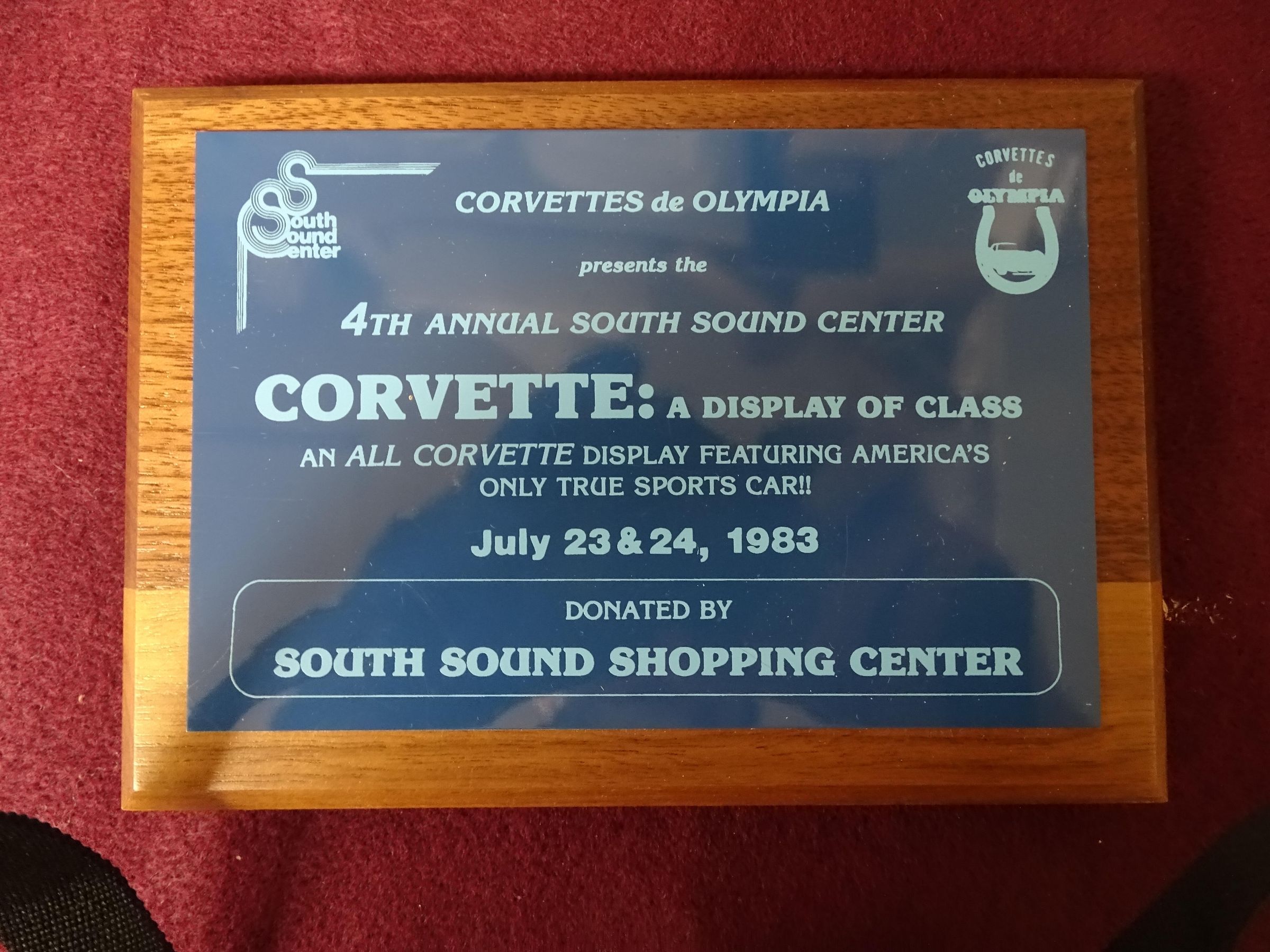 Wooden plaque with a brass plate with two shades of blue paint. In light blue paint on the blue back ground is a logo for South Sound Center and one for Corvettes of Olympia. Written are the words "Corvettes de Olympia presents the 4th annual South Sound Center Corvette: a display of class, an all corvette display featuring America's only true sports car!! July 23 & 24 1983 Donated by South Sound Shopping Center" On the back of the plaque are two holes bored for hanging. Also on the back is a mark where a label had been attached. The label, which is now separate says "Rallye Productions, Inc., P. O. Box 14037, Milwaukee, WI 53214, Area Code (414) 546-1150, Custom Plaques, T-shirts, Jacket patches & Decals".Dimensions