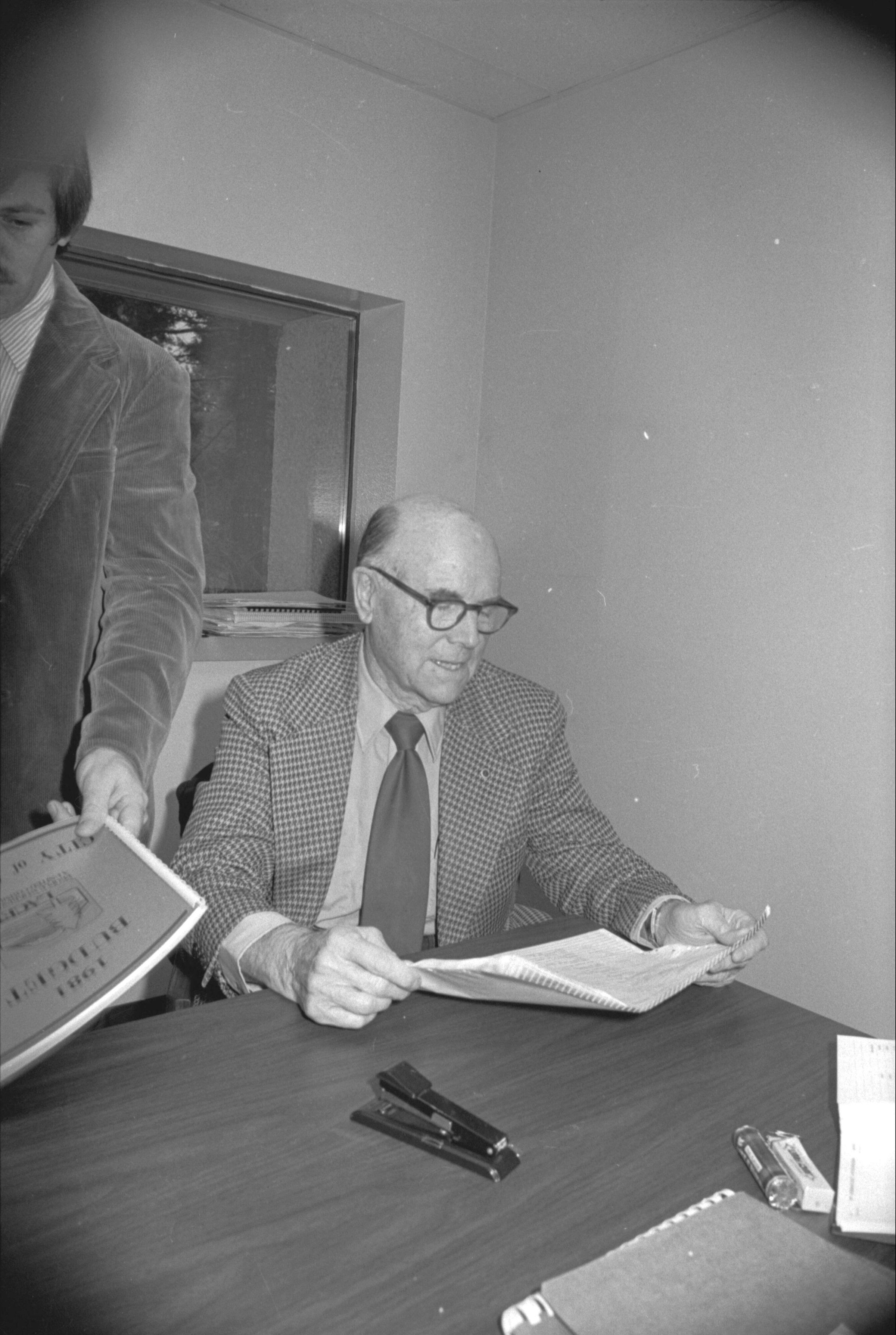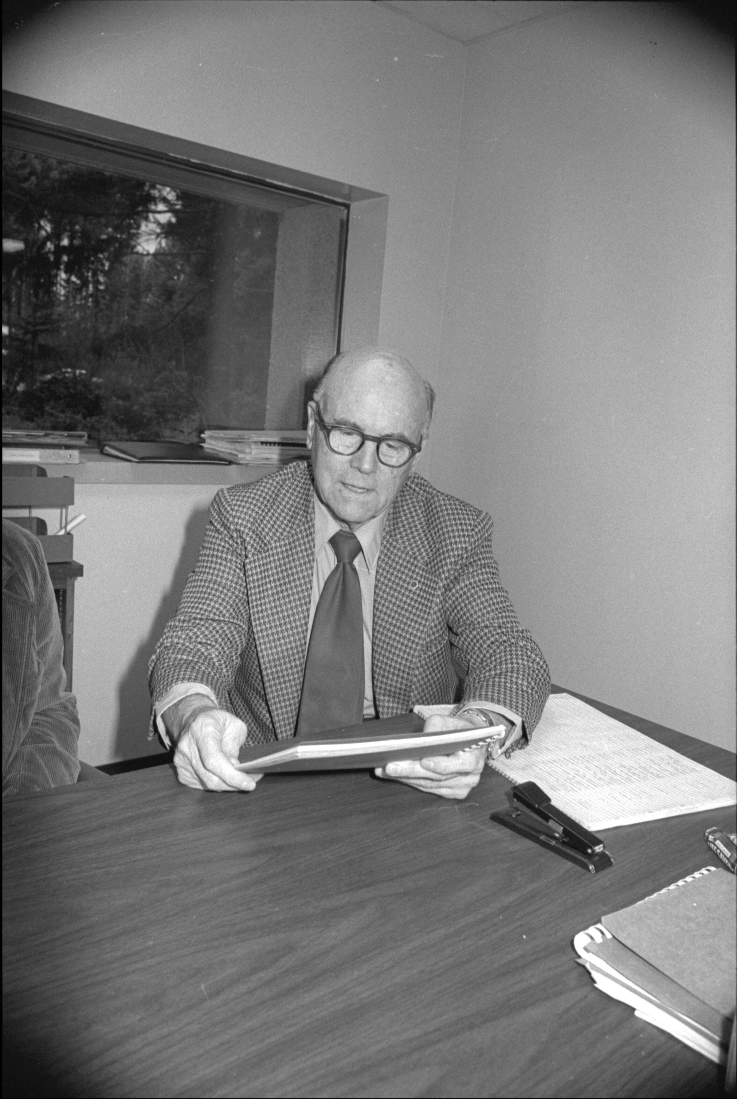 Archie Knowles, 1980. This single black and white film negative strip was created for the Lacey Leader newspaper. These images show an older, bald man (Archie Knowles) with glasses wearing a tie and a houndstooth jacket seated at a desk and looking at a document. Image 28 shows Mr. Knowles looking down at a spiral-bound document he is holding in his hands. There is a stapler on the desk in front of him. A man with a mustache in a corduroy jacket is partially visible at the left-hand edge of the image. A spiral-bound document is in this man's hand. This document appears to be a copy of the 1981 City of Lacey budget. Image 29 shows Mr. Knowles holding the City of Lacey budget document in his hands and looking down toward it. Here the man in the corduroy jacket's left arm is visible at the left-hand edge of the image.