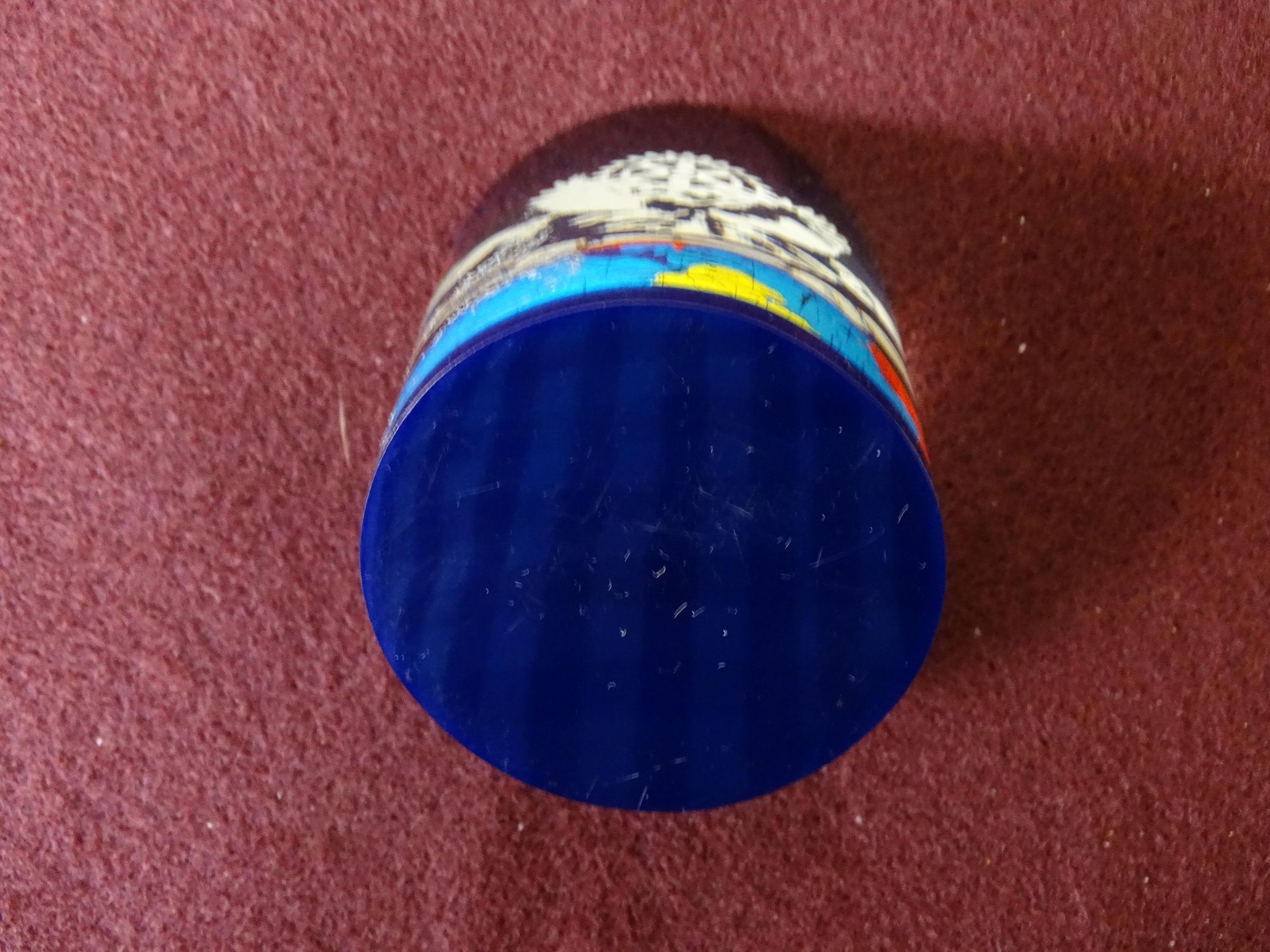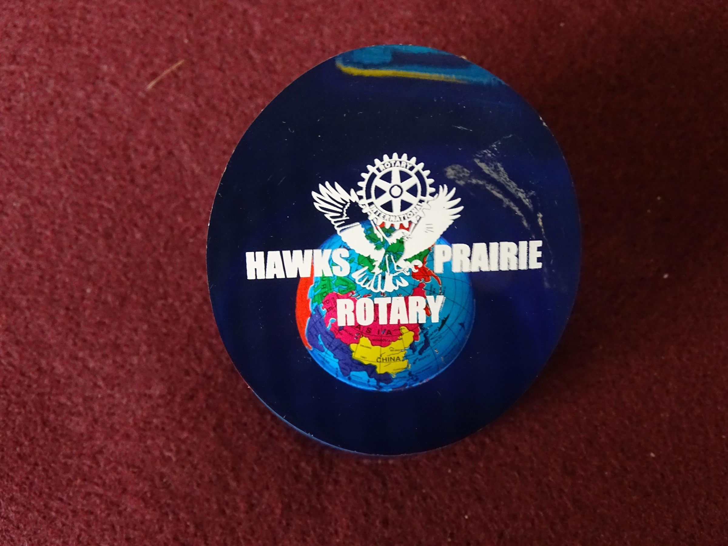 Glass and plastic cylindrical paper weight. The glass cylinder has a plastic bottom and a sloping top which has written in white ink "Hawks Prairie Rotary" together with the Rotary logo. Visible inside the glass is a world globe in blue, red, and yellow. Hawks Prairie Rotary gave this out as speaker gifts.Relationships