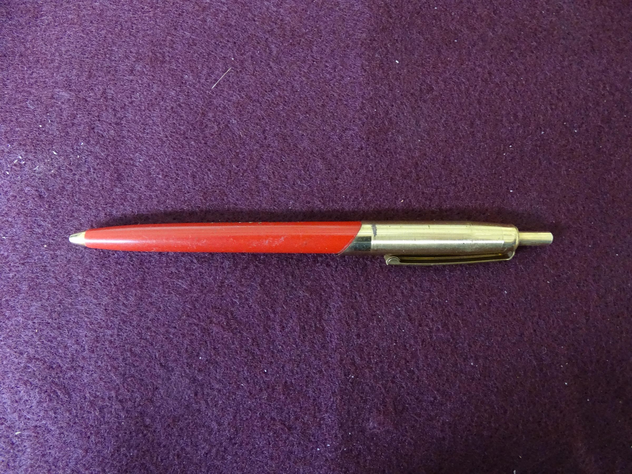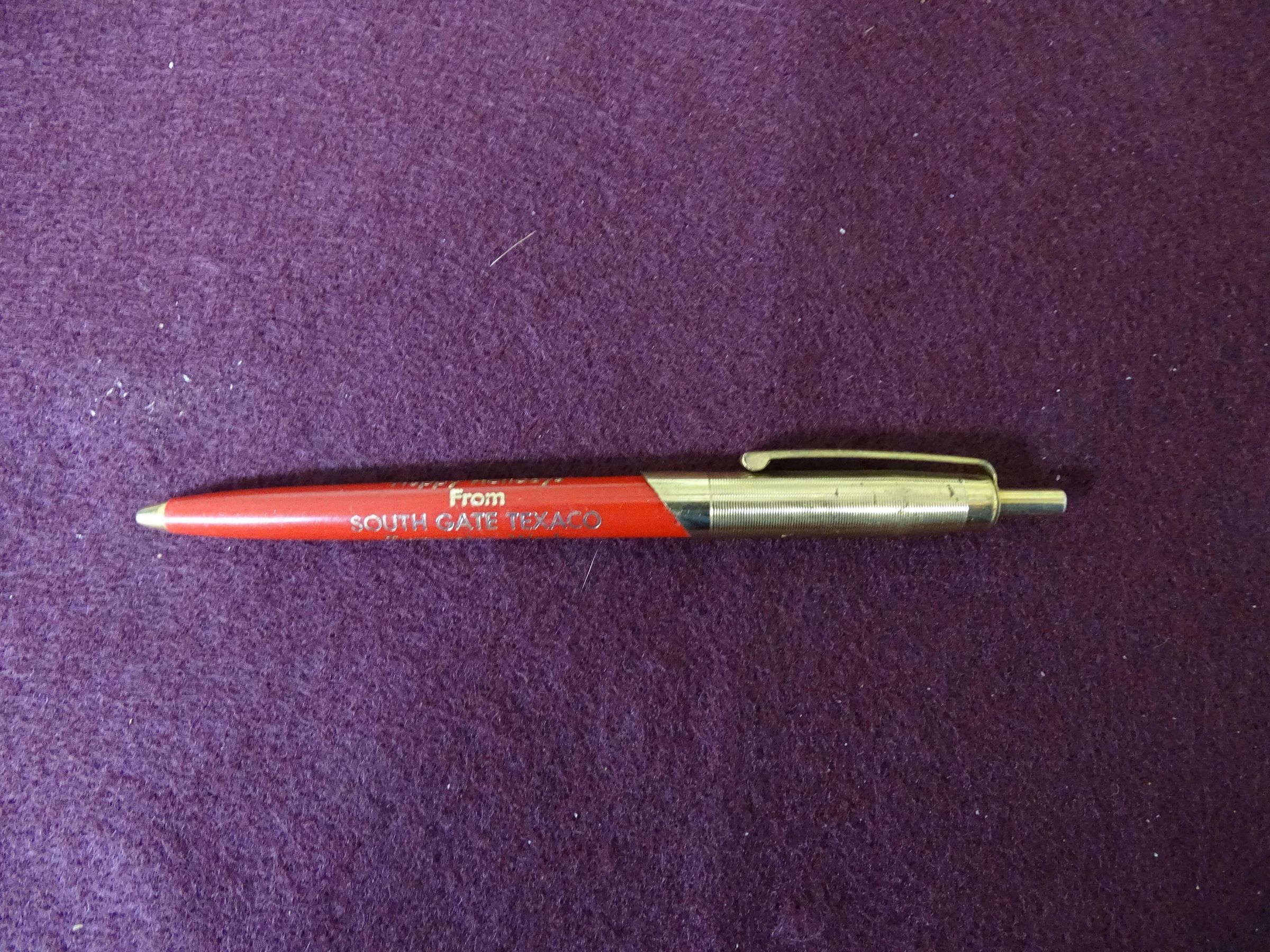 Metal and plastic ballpoint pen with clip. The upper portion and the clip are metal and gold in color. On the clip is a stylized "Y" and the words "York Pen, Yonkers, N.Y." and "U.S.A." The lower portion is red plastic and has written in gold ink "Happy Holidays from South Gate Texaco, Tumwater, Wash.".Dimensions