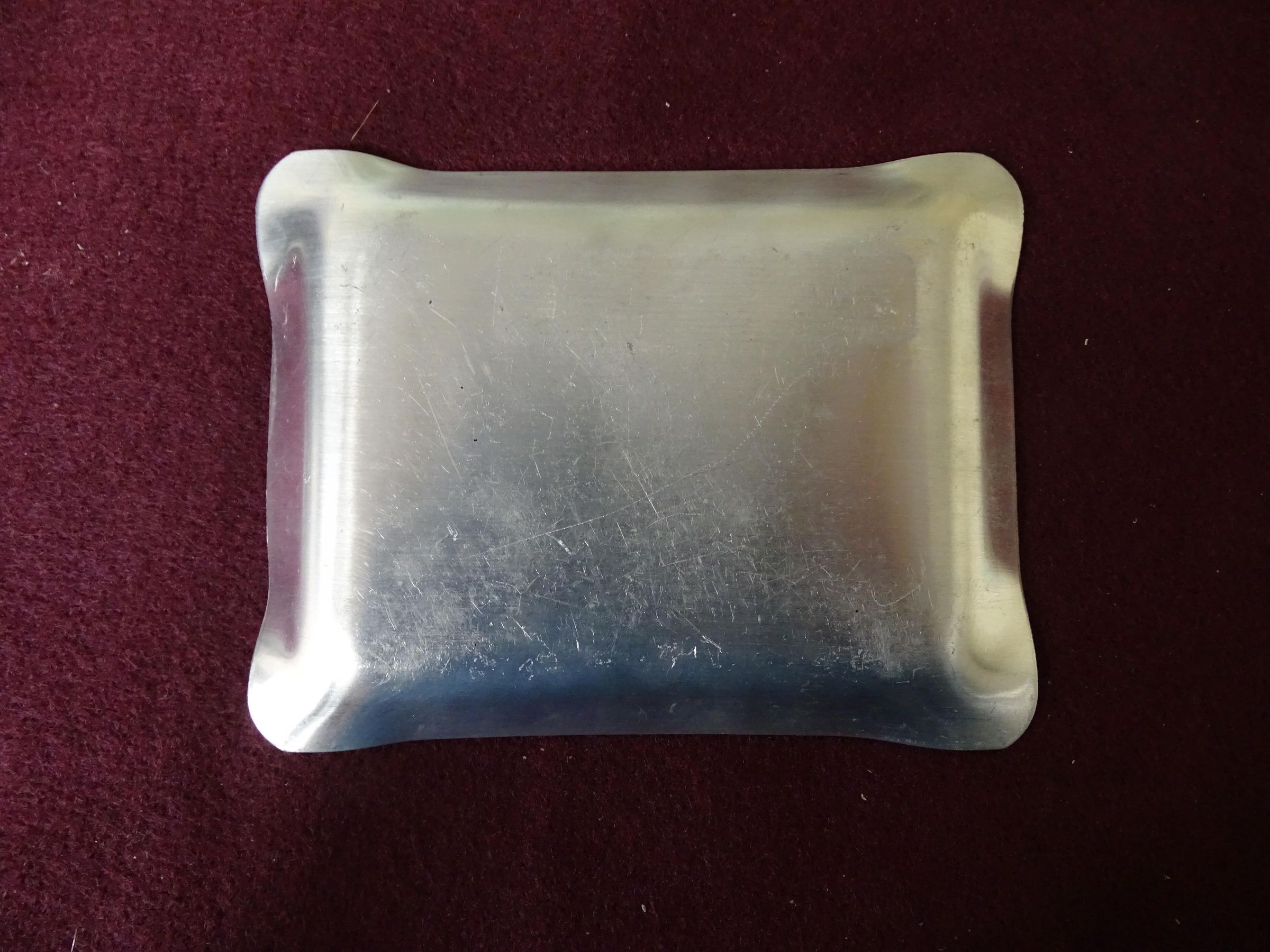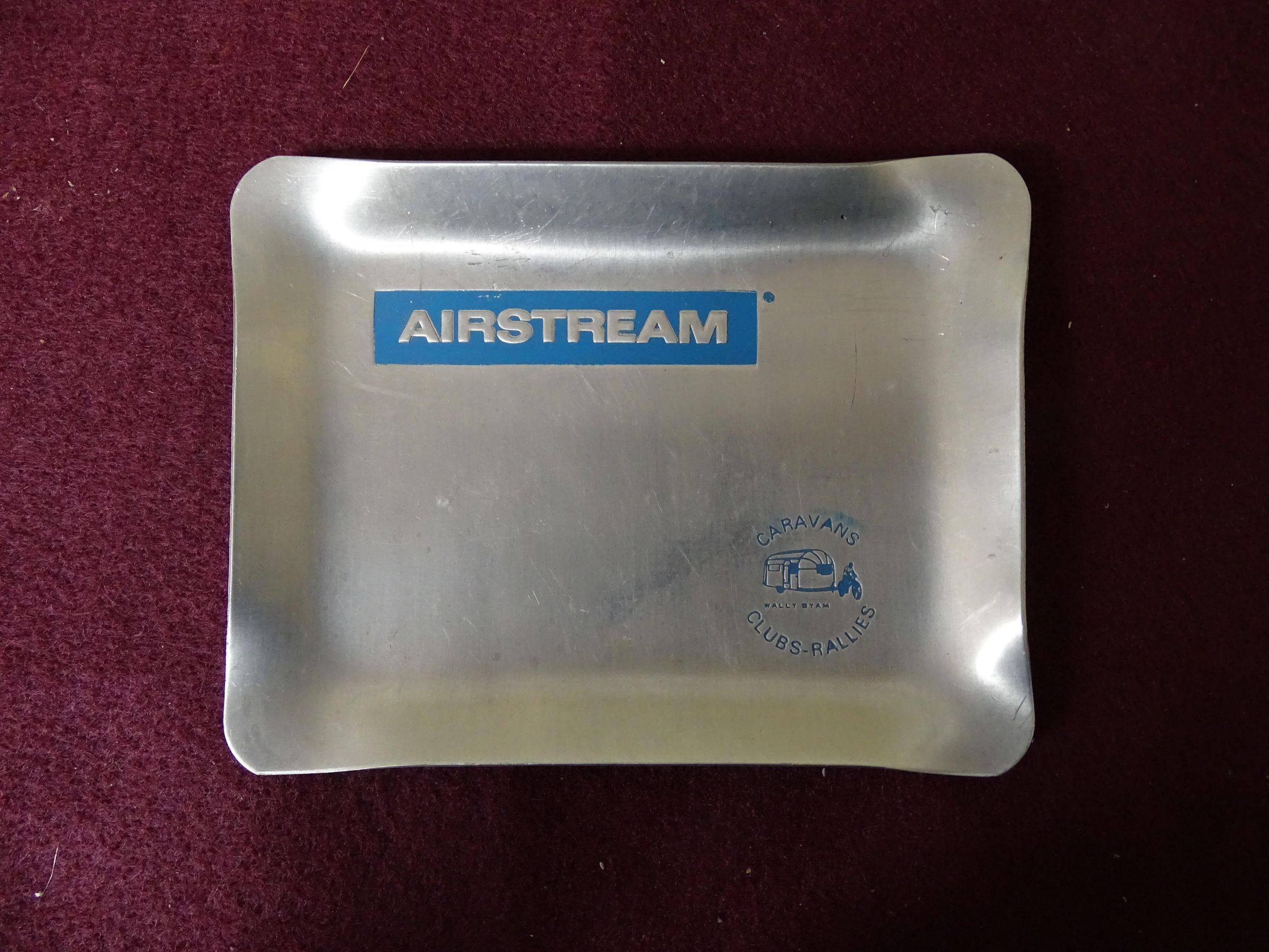 Aluminum ashtray with Airstream name and logo. The tray is silver in color with silver letters on a blue background that says "Airstream". Also in blue paint is an image of a trailer and the words "Caravans, Clubs, Rallies, Wally Byam". On the bottom of the tray are marks that indicate plastic tape had been attached. There is no tape there now.Dimensions