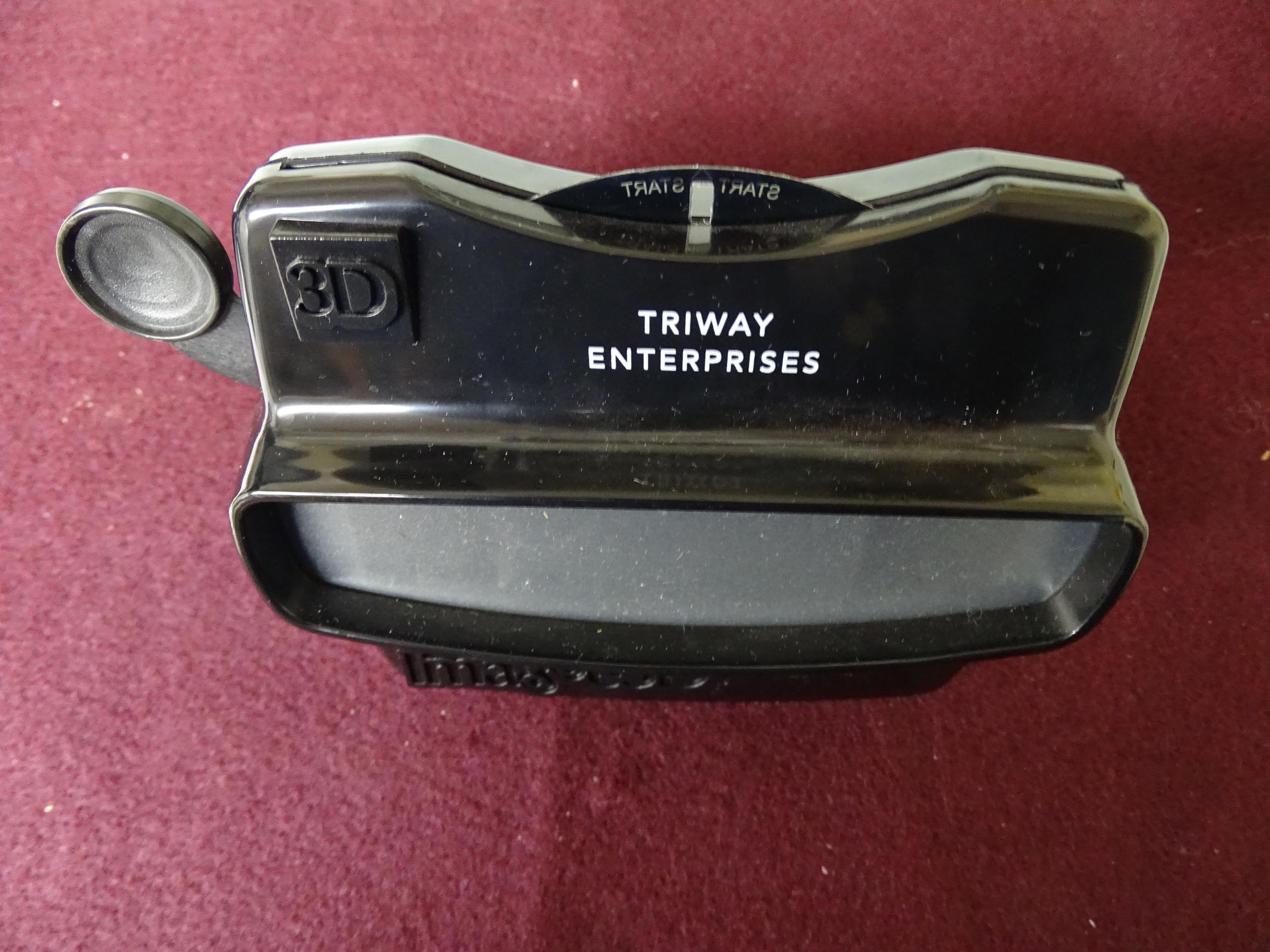 Black plastic stereoviewer with glass lenses and with a circular plastic slide inserted containing promotional images for a proposed development in the Lacey area called Gateway. On both the front and back of the viewer are molded "3D" in a square, and "Image3D". On the back only is printed in white letters "Triway Enterprises". On the slide, besides various images, is "start start' and "Triway Enterprises, The future is in view"Made/Created