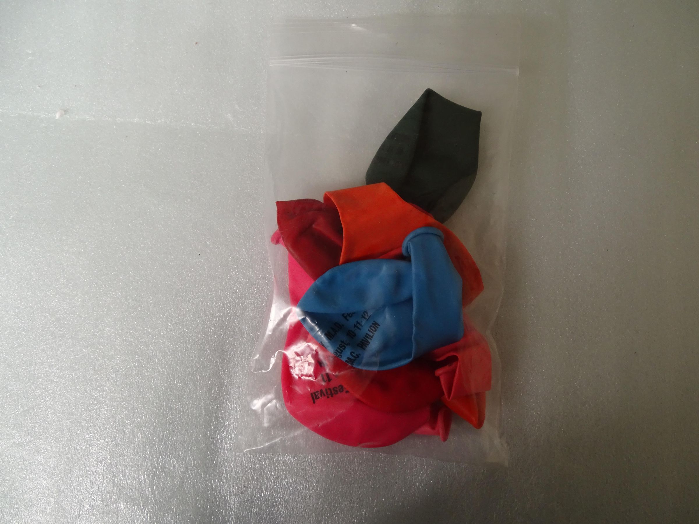 Latex balloons of various colors, including red, orange, blue and green. On seven balloons is printed "Lacey M.A.D. Festival August 9-10-11 S.M.C. Pavilion". One balloon has printed "FCB, First Community Bank, We belong together". One balloon has no printing.Dimensions