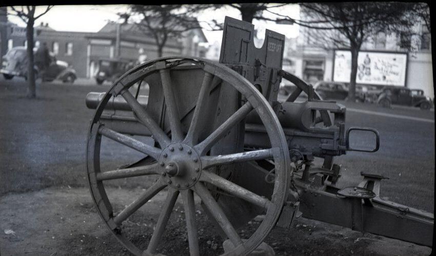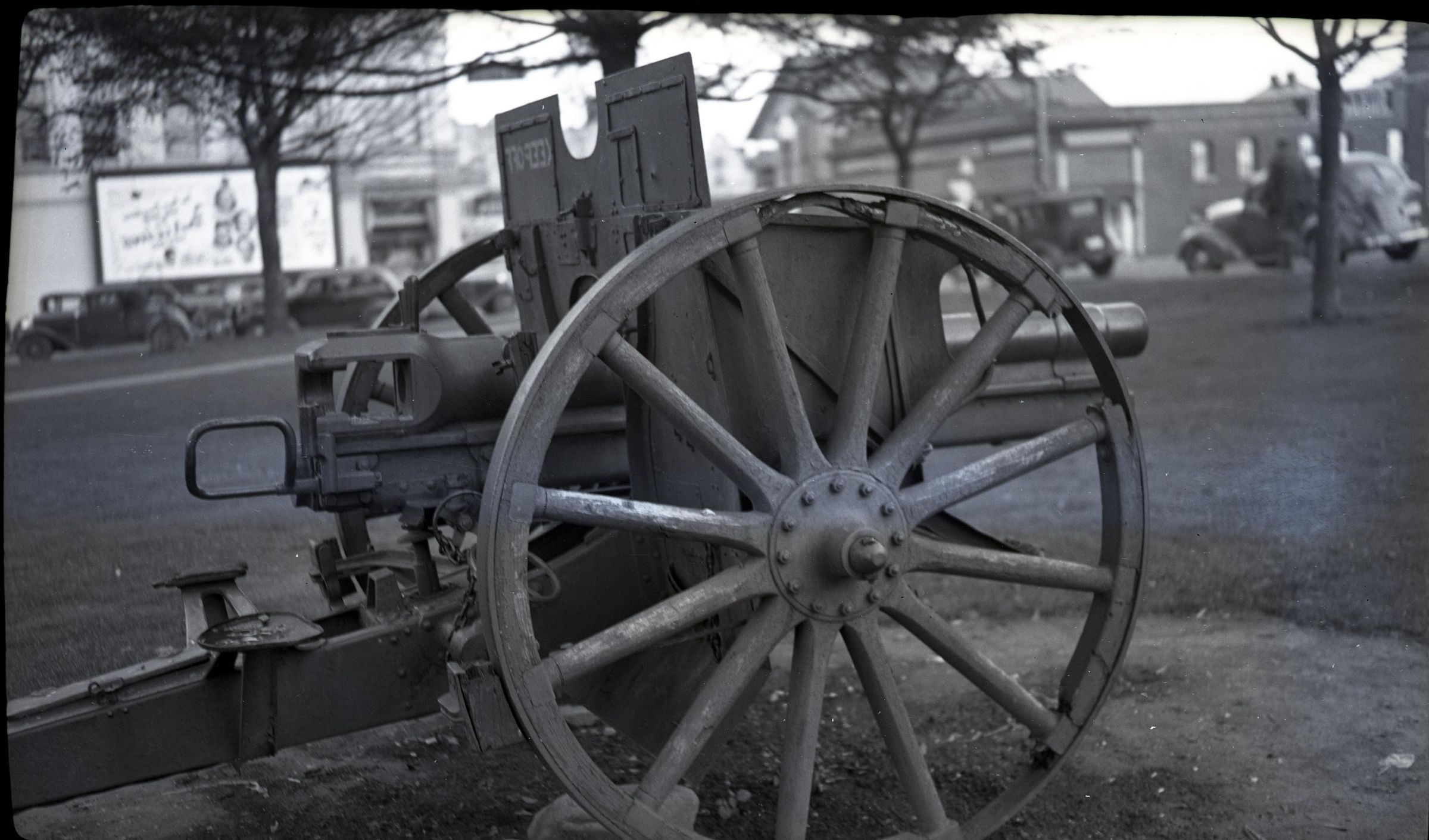The negative is inserted, along with a print of the image, into a cream colored envelope that has typed "January 5, 1940 Another view of an old German field piece in the city park, Olympia, a World War trophy Taken about 3 p.m. on a cloudy day. Aperture 6.3 exposure 1/10s; distance 10 feet". Stamped is "2005" and "indexed".Made/Created