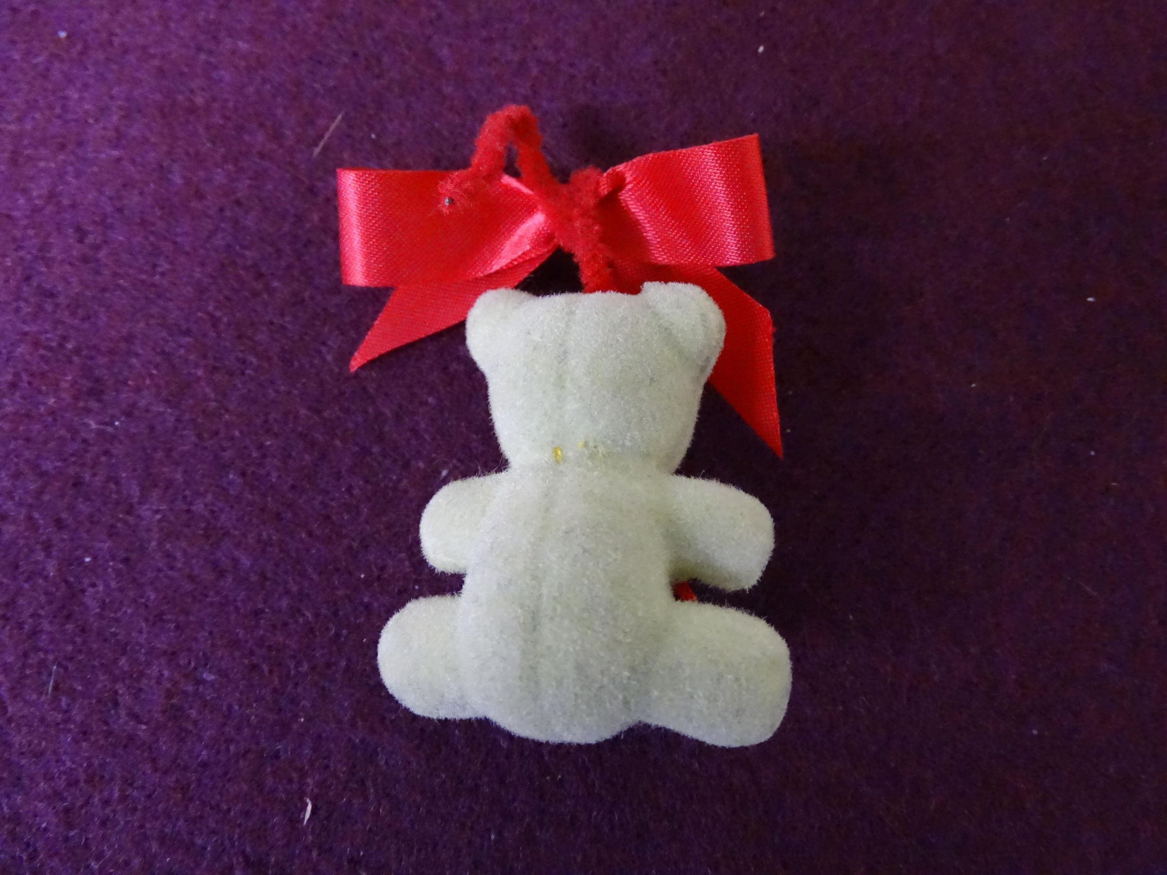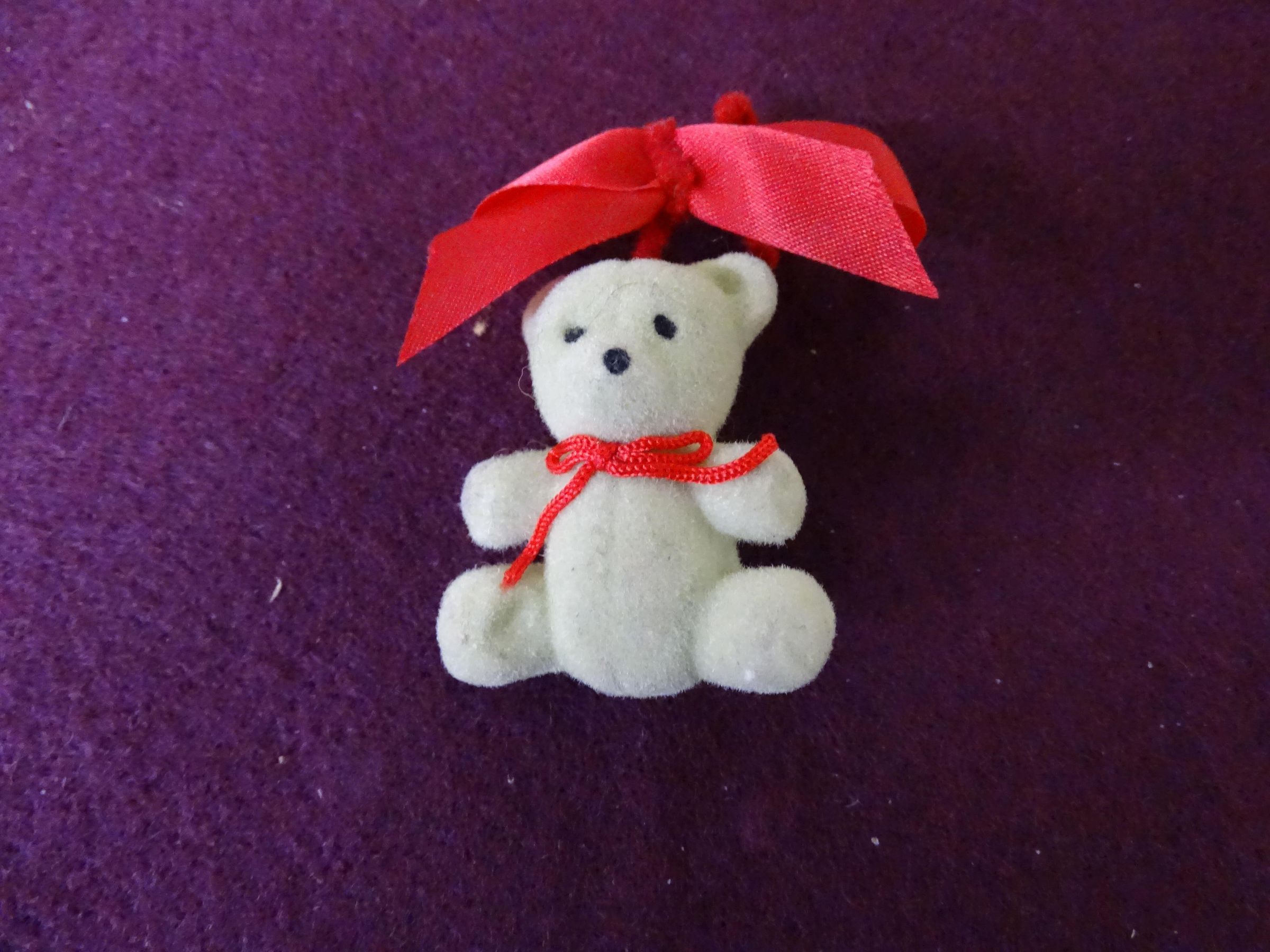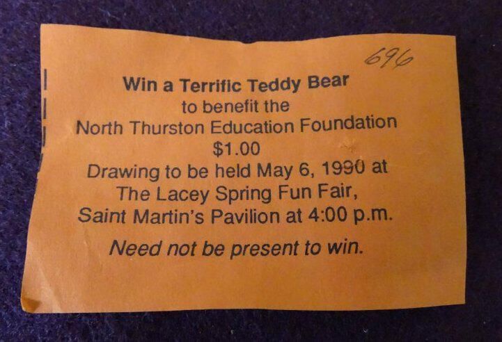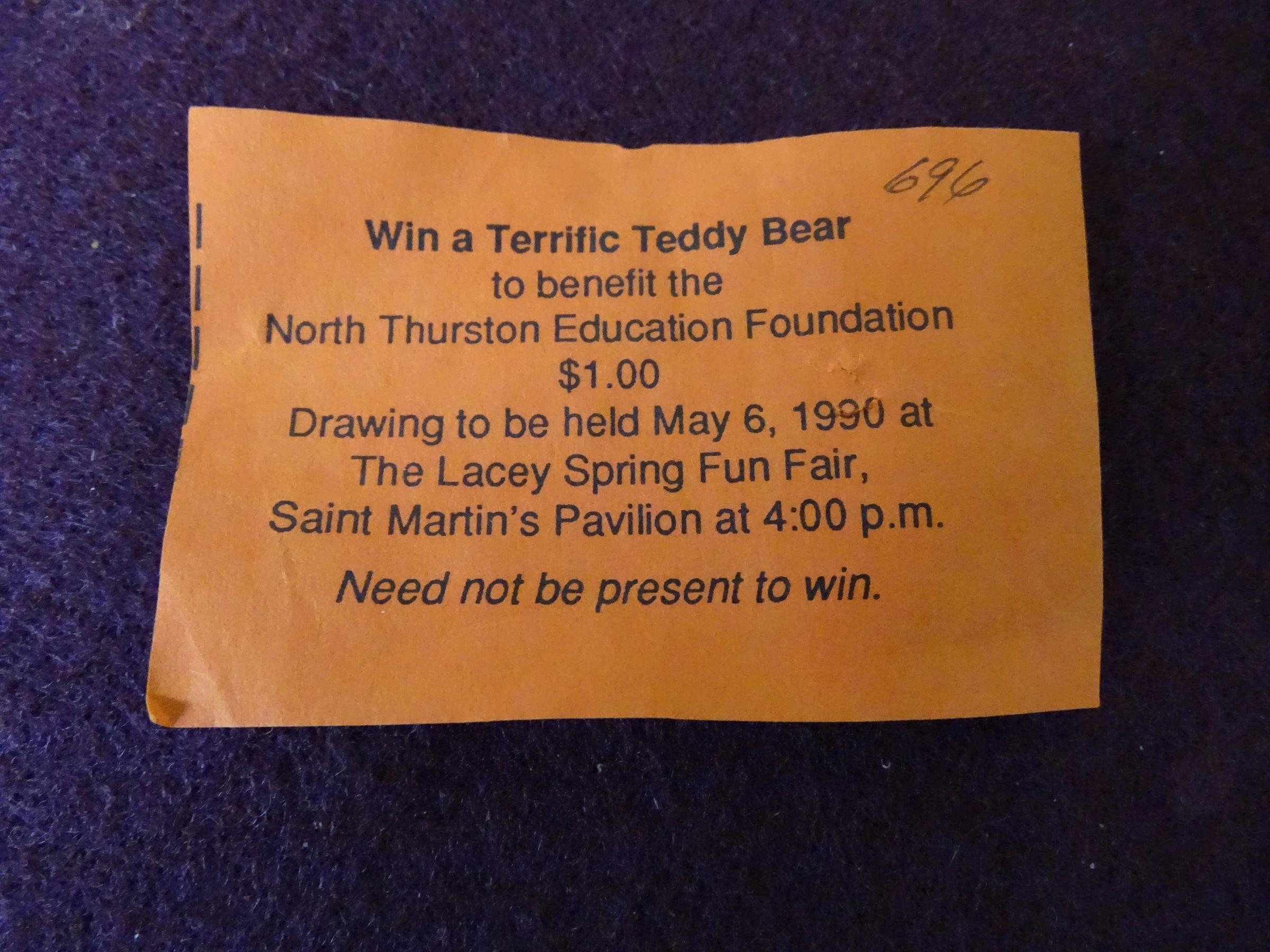 Small buff-colored cloth teddy bear with a red string around its neck and a stiff bendable hanger. The hanger is wrapped around a red cloth bow. Accompanying the bear is a red paper ticket with the following printed on it "Win a terrific Teddy Bear to benefit the North Thurston Education Foundation, $1.00, drawing to be held May 6, 1990 at the Lacey Spring Fun Fair, Saint Martin's Pavilion at 4:00 p. m. Need not be present to win". Written on the ticket in ink is "696".Dimensions