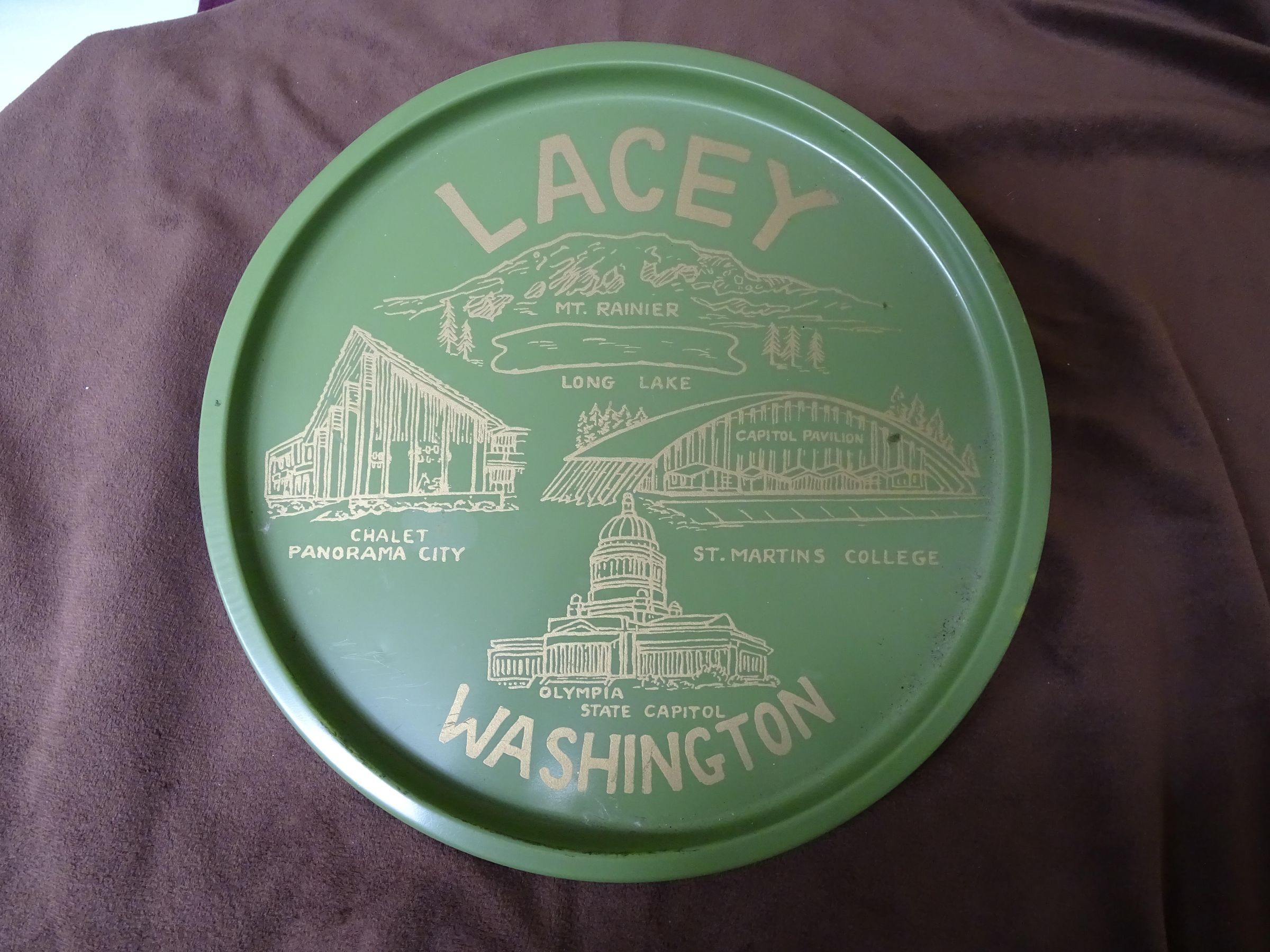 Metal tray painted white on the bottom and green on the top. on the top in gold print is, in large letters, "Lacey, Washington" and the name and an associated image of Mt. Rainier, Long Lake, Panorama City, St. Martin's College, and the State Capitol.Made/Created