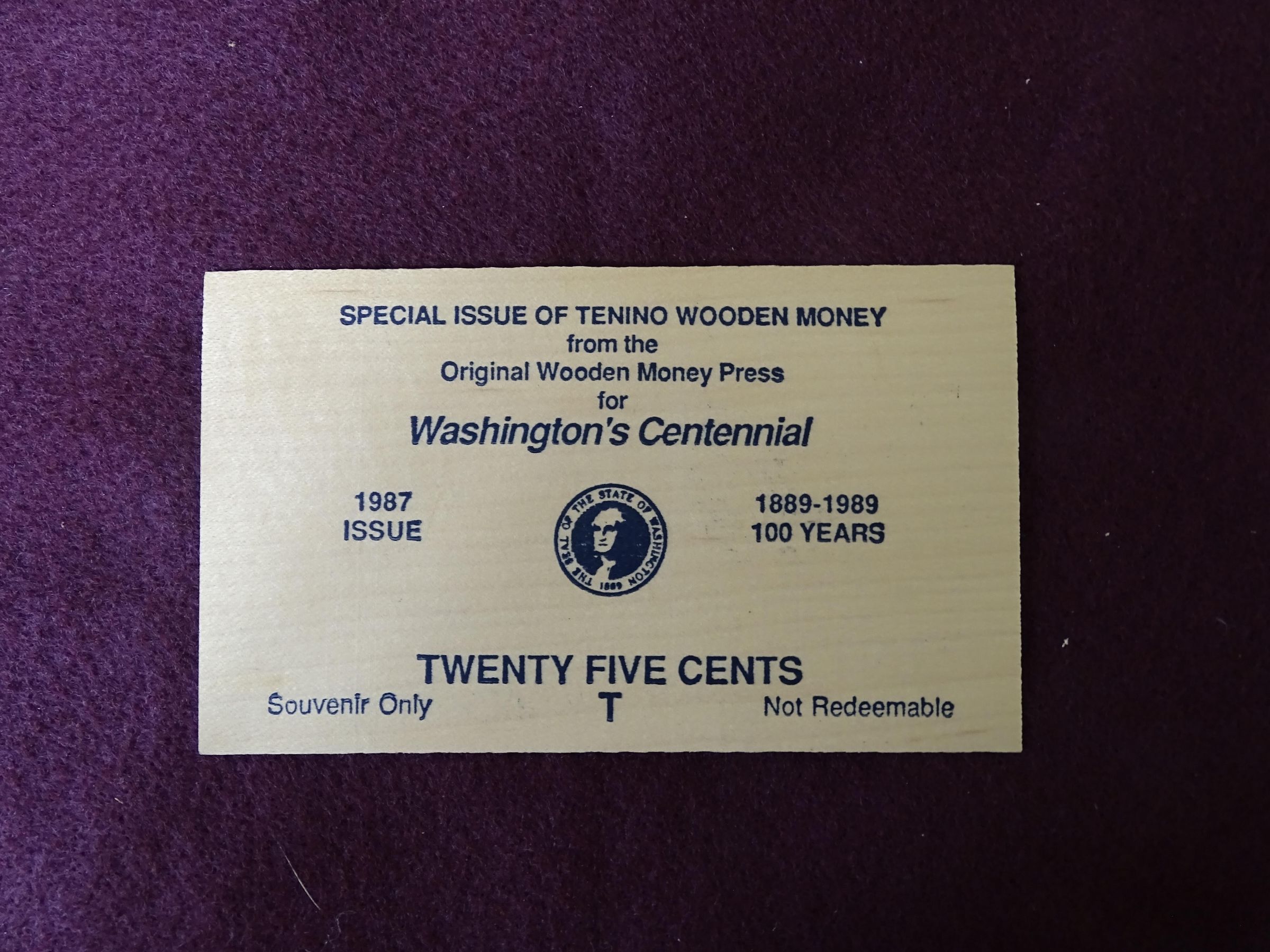 Thin wooden rectangle with black ink printing. On the front is "Second issue of the Tenino Museum Series of Tenino Wooden Money Society, Proceeds of this issue will be donated to the Tenino Museum fund, TWENTY-FIVE CENTS, in Wooden Currency, Issue of May 1978, This issue printed on the same press that printed the world's first legal wooden money in December 1931, E, Kenneth E. Hedden, TWMS president". On the back is an image of a steam locomotive and a depot, a description of the images, and "25 Cents, Printed by The Tenino Independent, Tenino, Wash.".Made/Created
