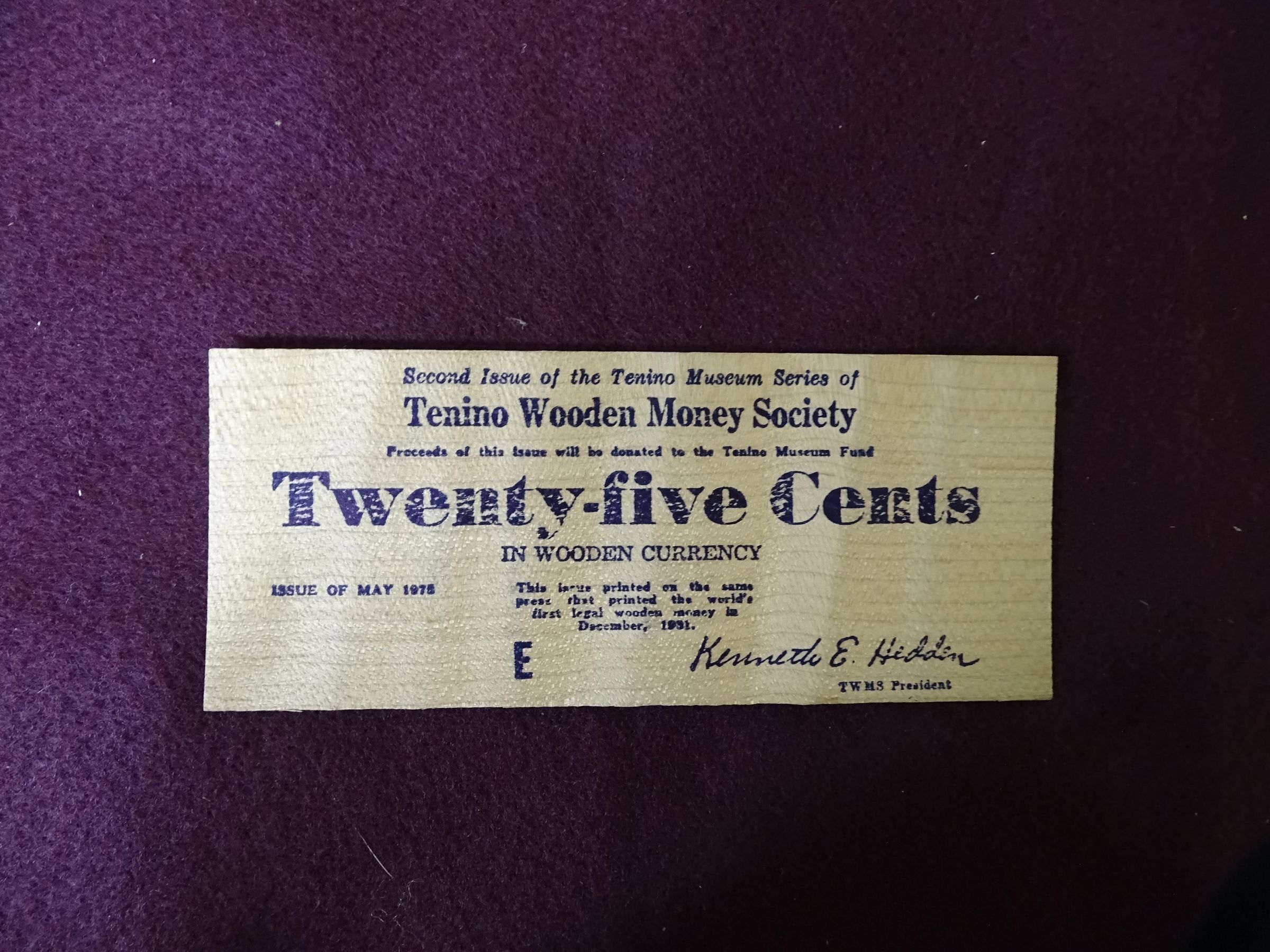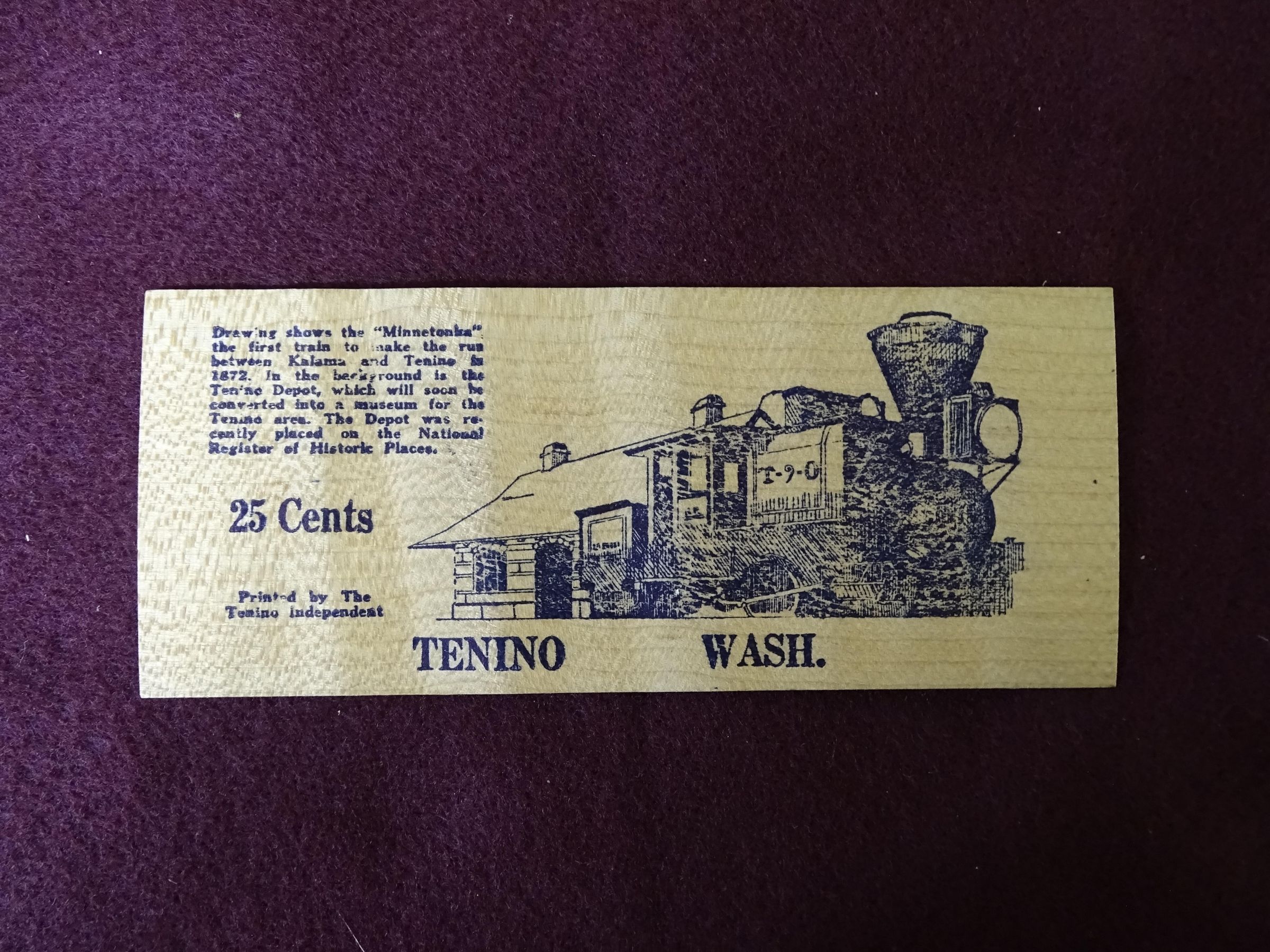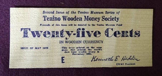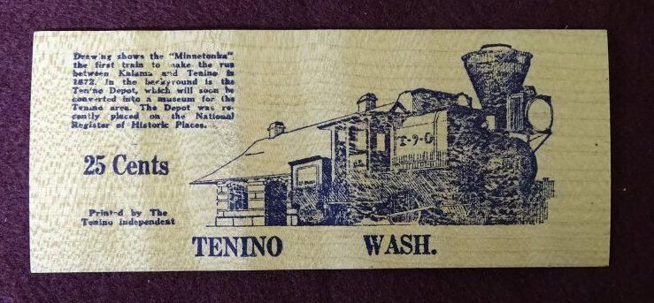 Thin wooden rectangle with black printing. On the front is the seal of the State of Washington and the words "Special issue of Tenino wooden Money from the Original Wooden Money Press for Washington's Centennial, 1987 Issue, 1889-1989, 100 years, TWENTY FIVE CENTS, Souvenir only, T, Not redeemable". On the back is an image of the first capitol building and the words "Washington's First Capitol".Relationships