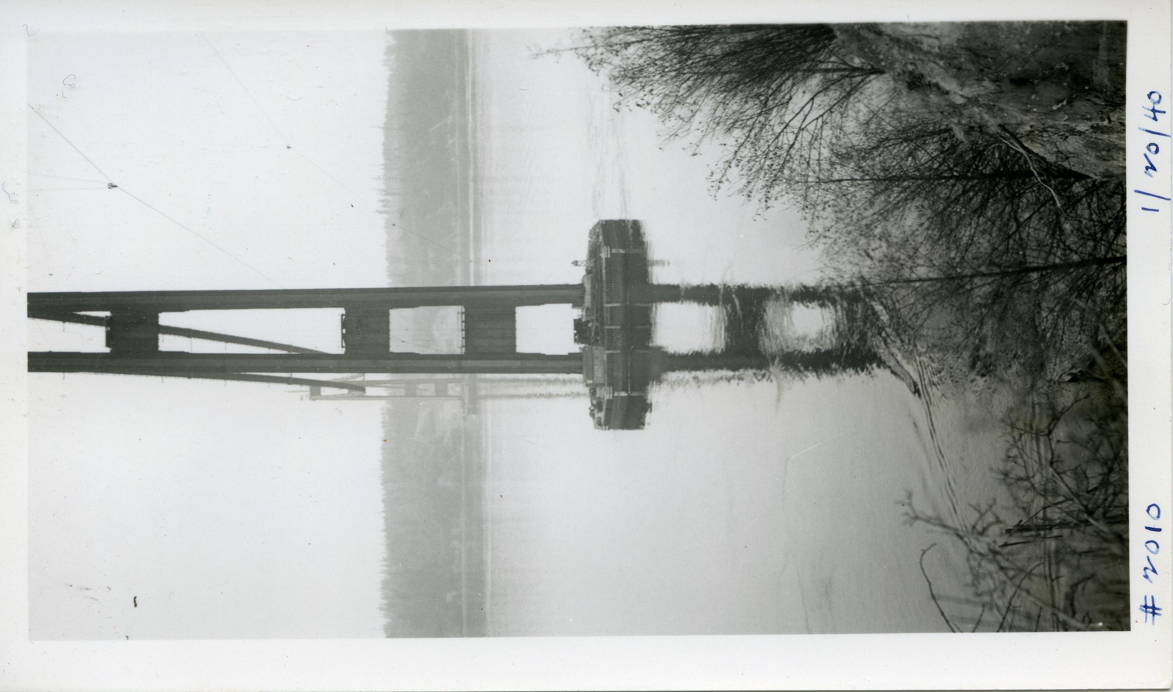 Black and white photo of the Tacoma Narrows Bridge under construction. In the foreground are trees. In the middle distance is the East Tower and further back is another tower. Suspension cables are strung between the towers. The far shore is visible in the background. There is a white border on all sides, and in the bottom border is "#2010" and "1/20/40". On the back is "313"