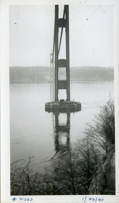The photo is inserted, along with a negative of the image, into a cream colored envelope that has typed "January 20, 1940 Narrows Bridge at Tacoma Base of eastern tower from the shore". Stamped is "2010" and "indexed".Made/Created