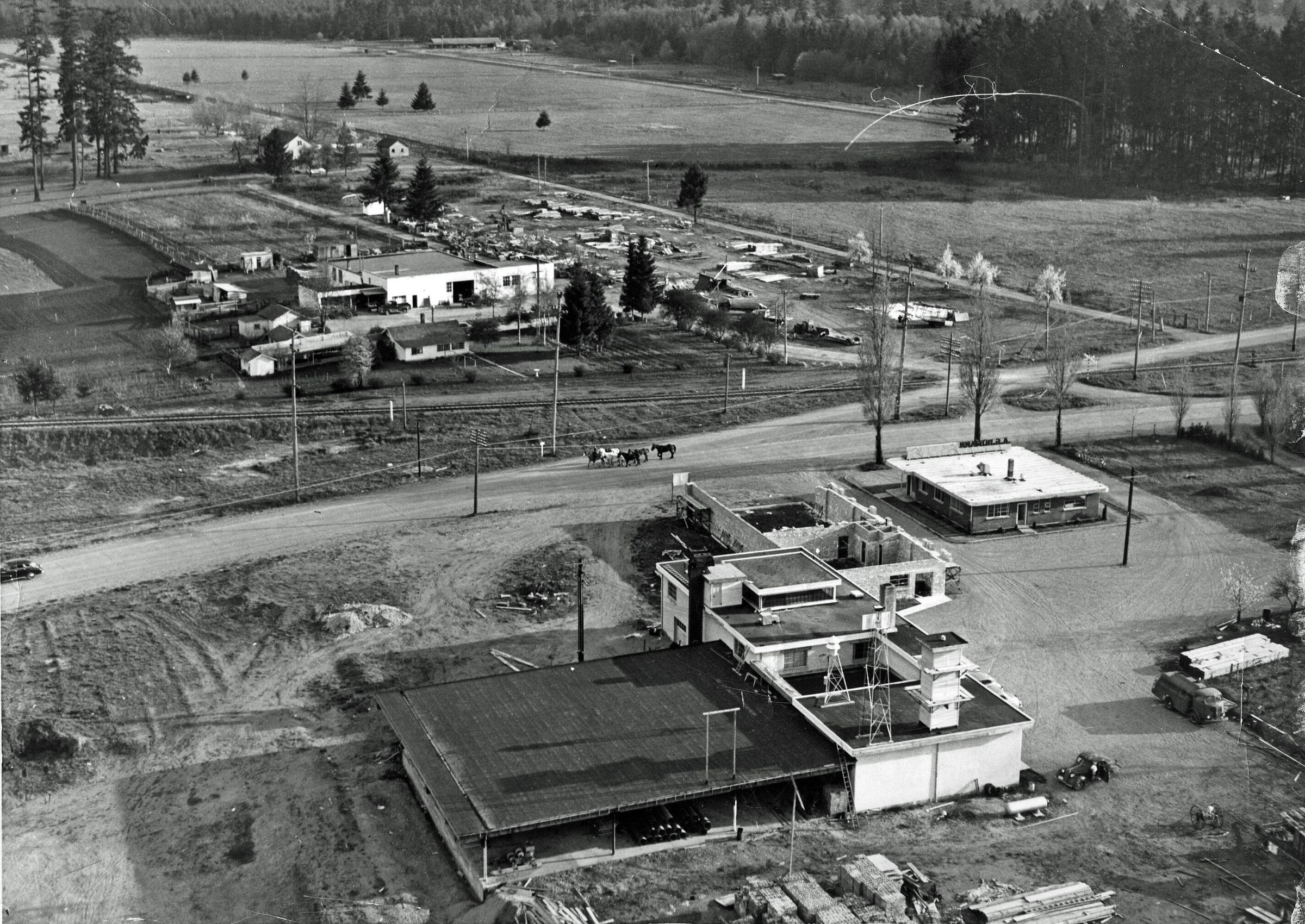Black and white photograph (scanned copy) of the intersection of Lacey Boulevard, Pacific Avenue, and Homann Drive. The streets are unpaved and a man is leading four horses east on Pacific. A car can be seen ahead of them on the left. At the bottom (north side) is A. G. Homann Construction (built 1947) and the fire hall and fire tanker to the northwest. Across Pacific Avenue on the south side is the house that Al Homann purchased and renovated (on Lacey's Historic Register) and the expanse of land that was once the racetrack.Made/Created