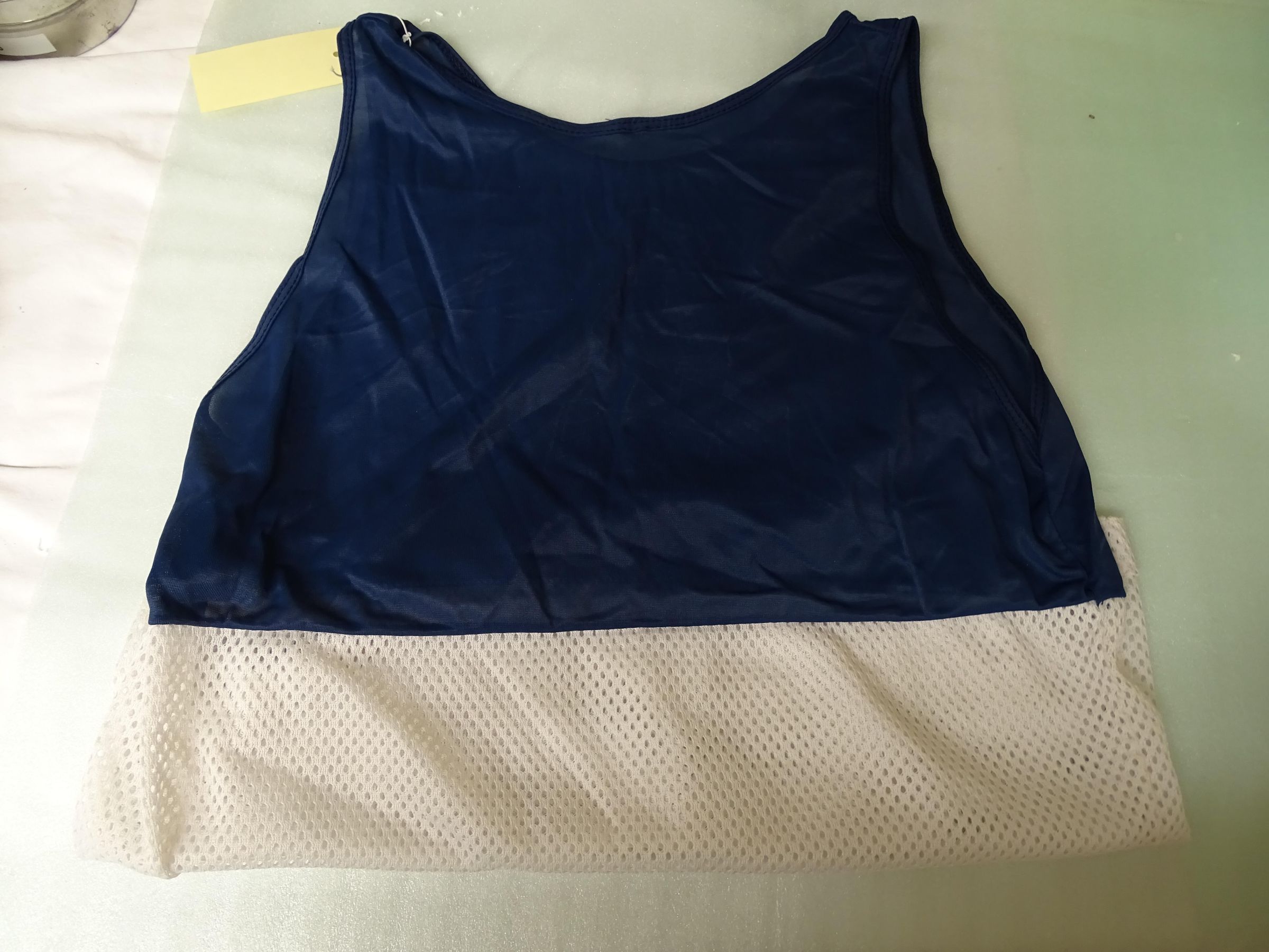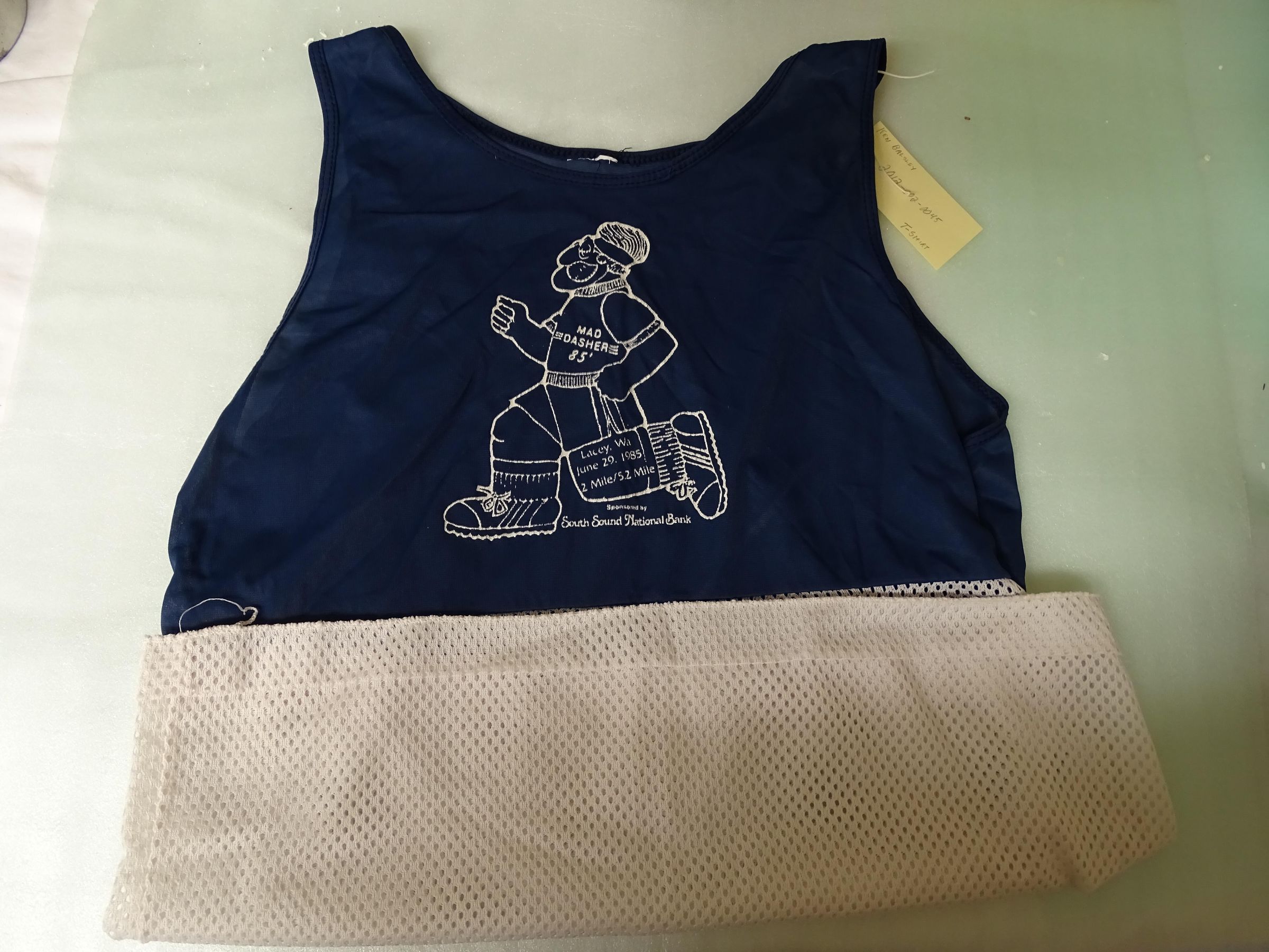 Blue and white tank top T-shirt. The upper half is blue cloth and has, in white, an image of a runner. Also in white are the words "mad dasher, 85', Lacey, Wa,June 29, 1985, 2 Mile/5.2 Mile, sponsored by South Sound National Bank". The lower half of the shirt is white mesh cloth. At the back of the neck line is a small portion of what had been a cloth label.