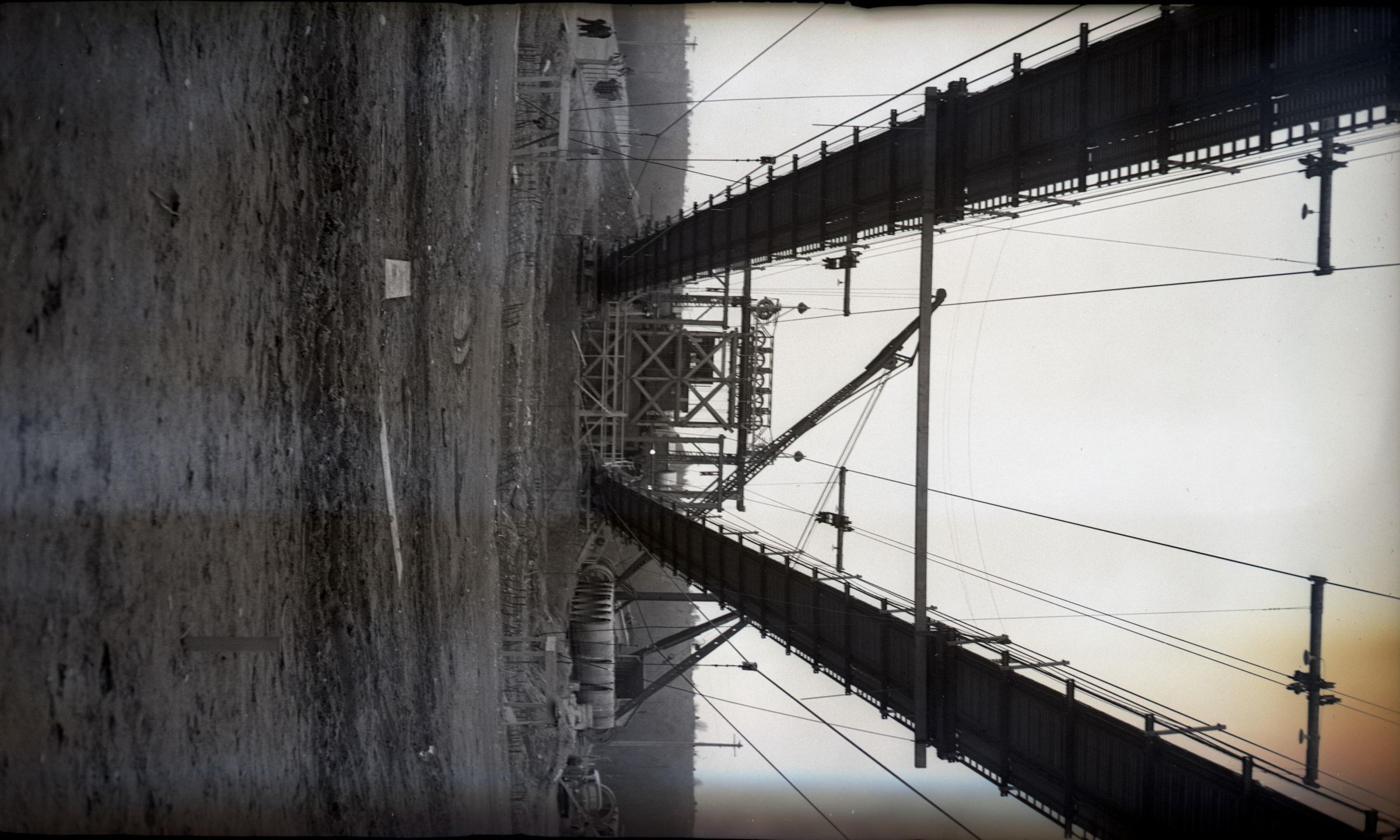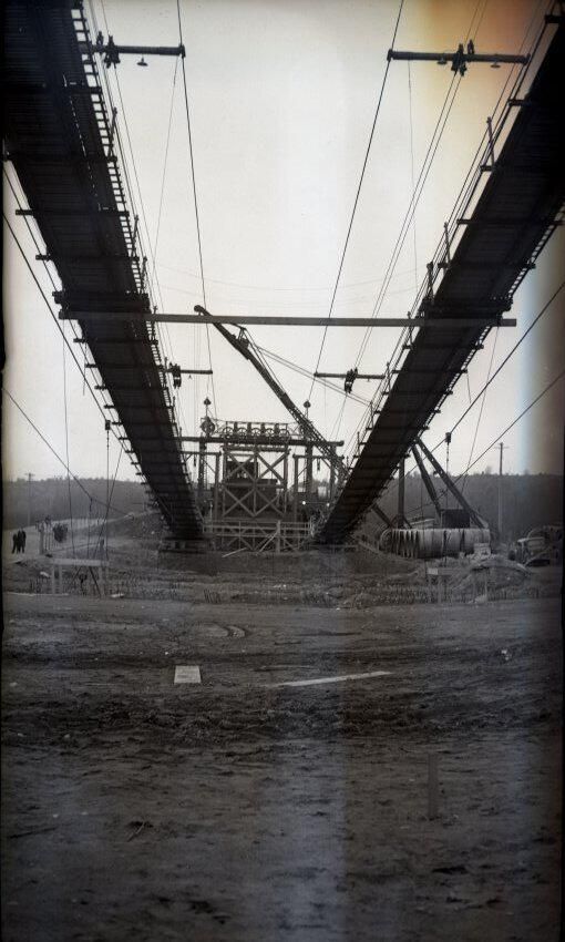 The negative is inserted, along with a print of the image, into a cream colored envelope that has typed "January 20, 1940 Narrows Bridge at Tacoma Eastern anchorage from the same point but in the opposite direction used in #2011". Stamped is "2012" and "indexed".Made/Created