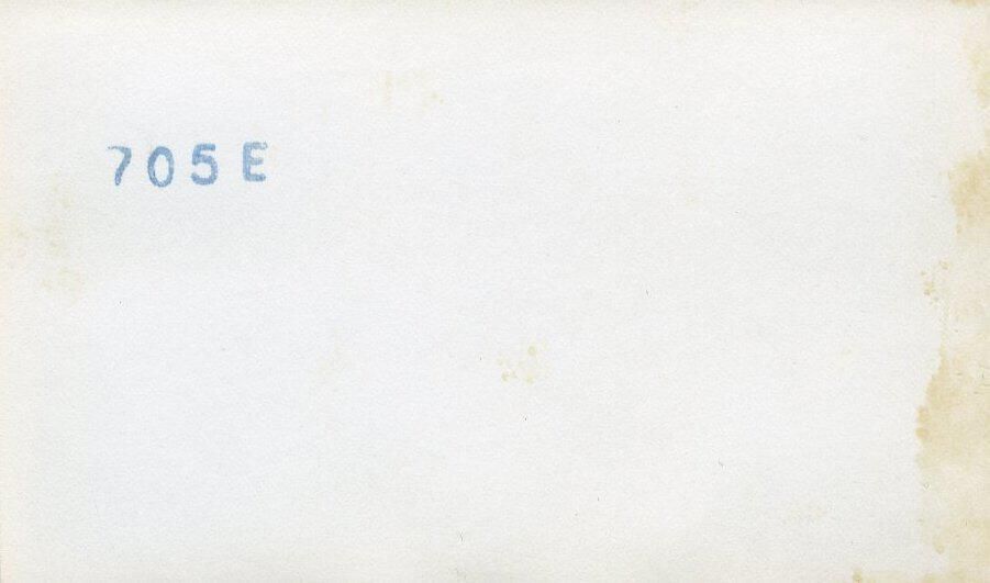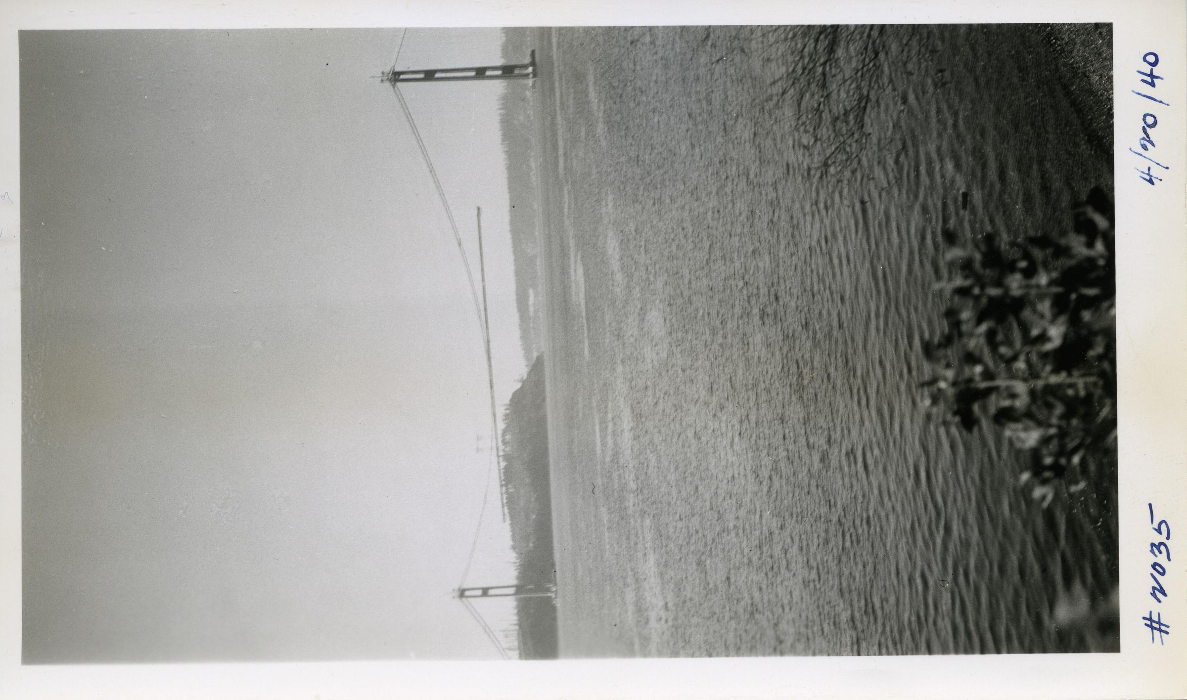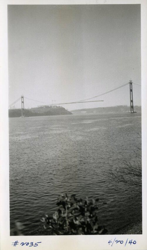 Black and white photo of the Tacoma Narrows Bridge under construction. In the foreground is a shrub and some bare branches and then a long stretch of water. In the middle background are two towers with cables strung between them and a part of the roadway in place. At the left is land. There is a white border on all sides, and in the bottom border is "#2035 4/20/40". On the back is "705E".