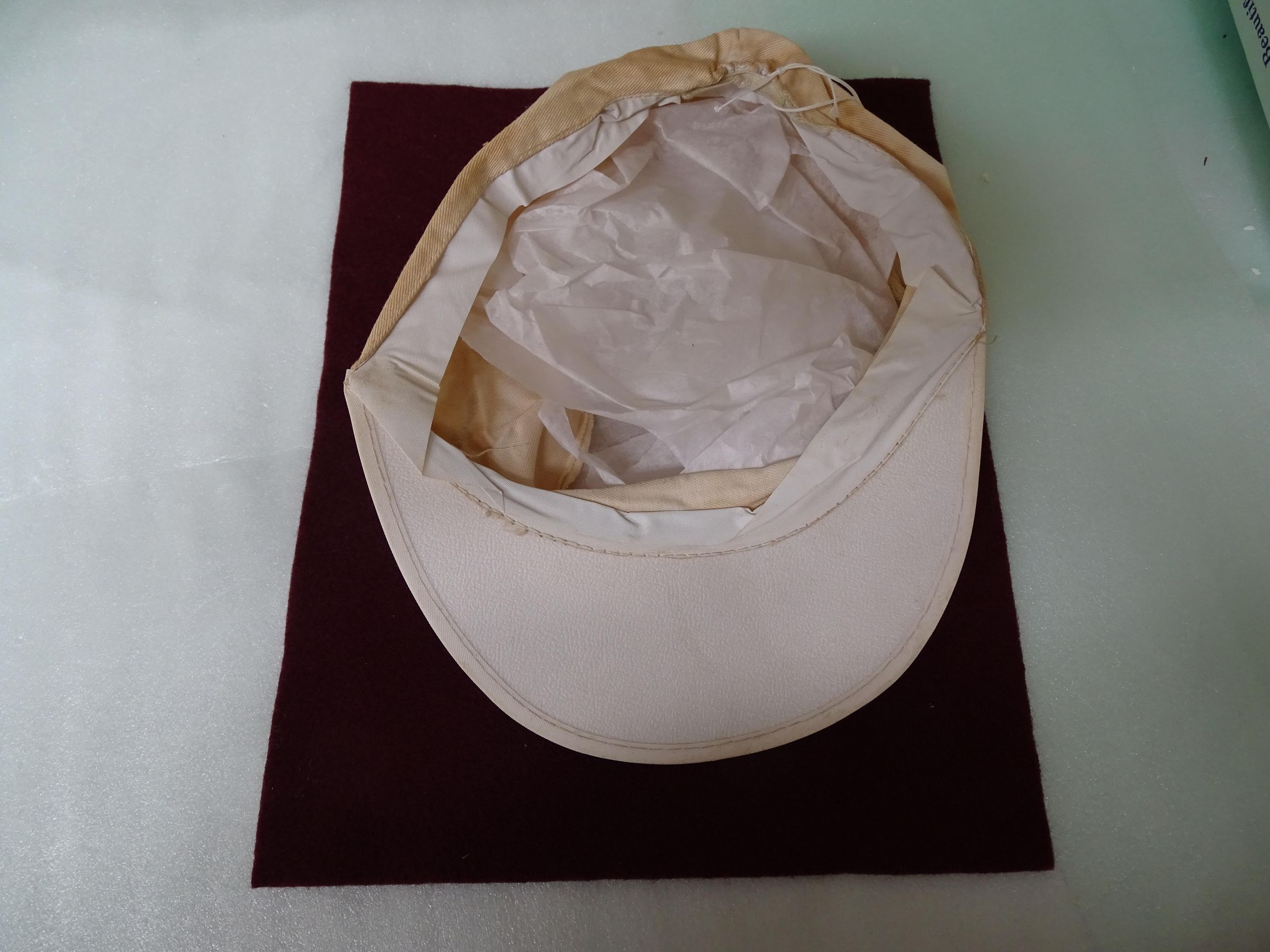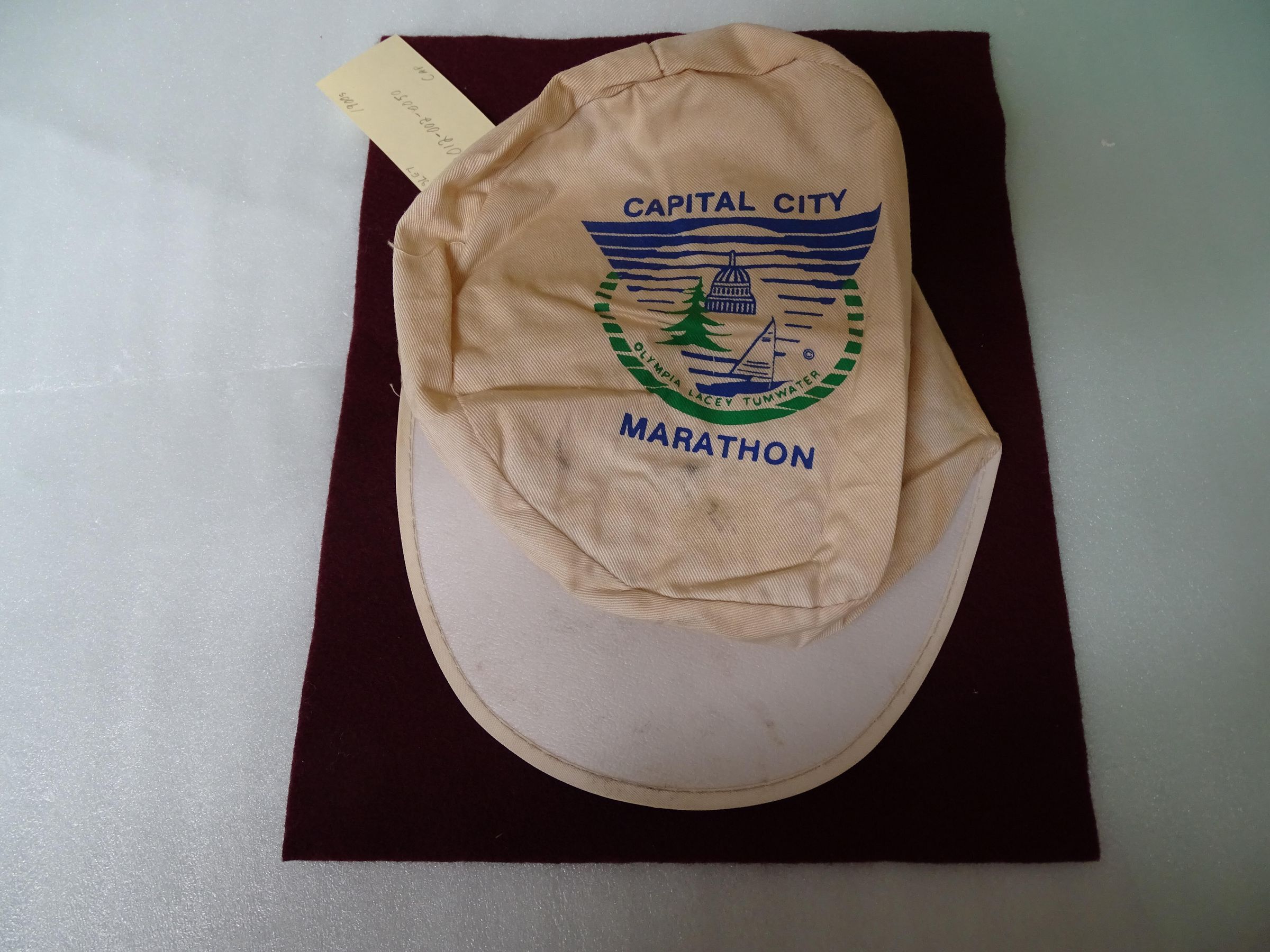 White canvas cap with a plastic bill and an elastic strip at the back. On the top in blue and green ink is an image of the Capitol dome, a tree, and a sail boat and the words "Capital City Marathon, Olympia, Lacey, Tumwater".Made/Created