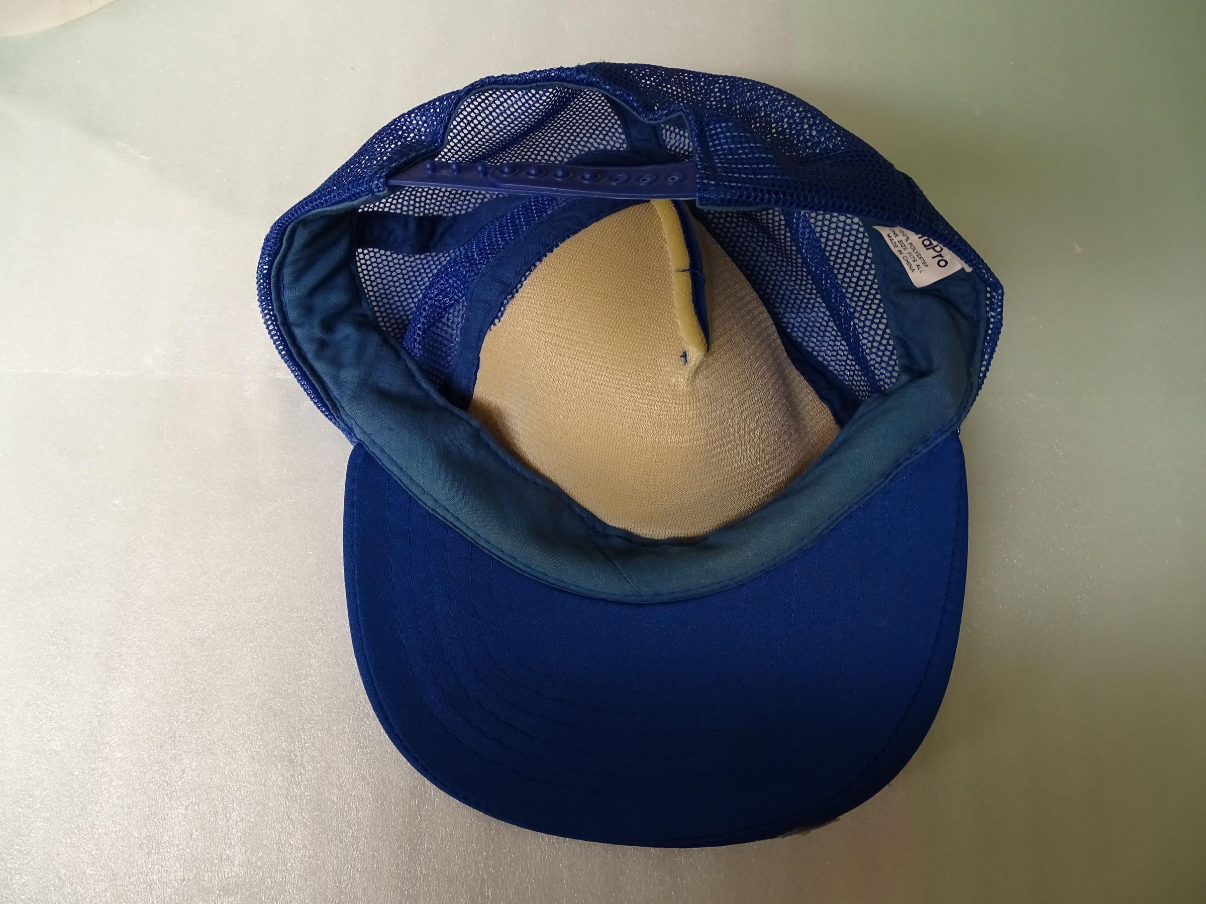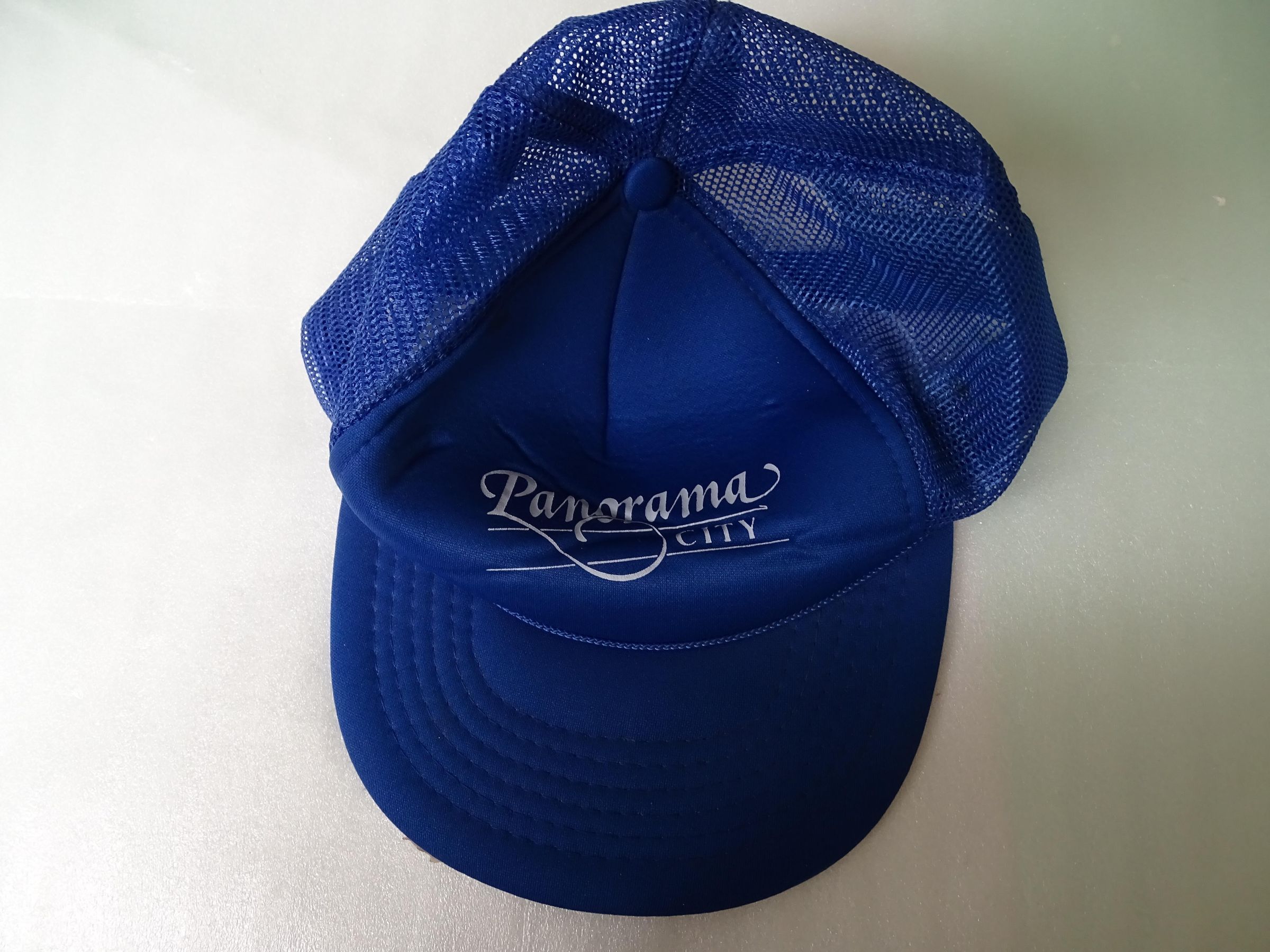 Blue cloth baseball cap, In white ink are the words "Panorama City". There is a button at the top that is cloth-covered metal. There are two plastic strips at the rear that permit size adjustment. There is a cloth liner in the front portion and the rear portion is mesh. It has a paper label that says "AmaPro, 100% polyester, one size fits all, made in China".Dimensions