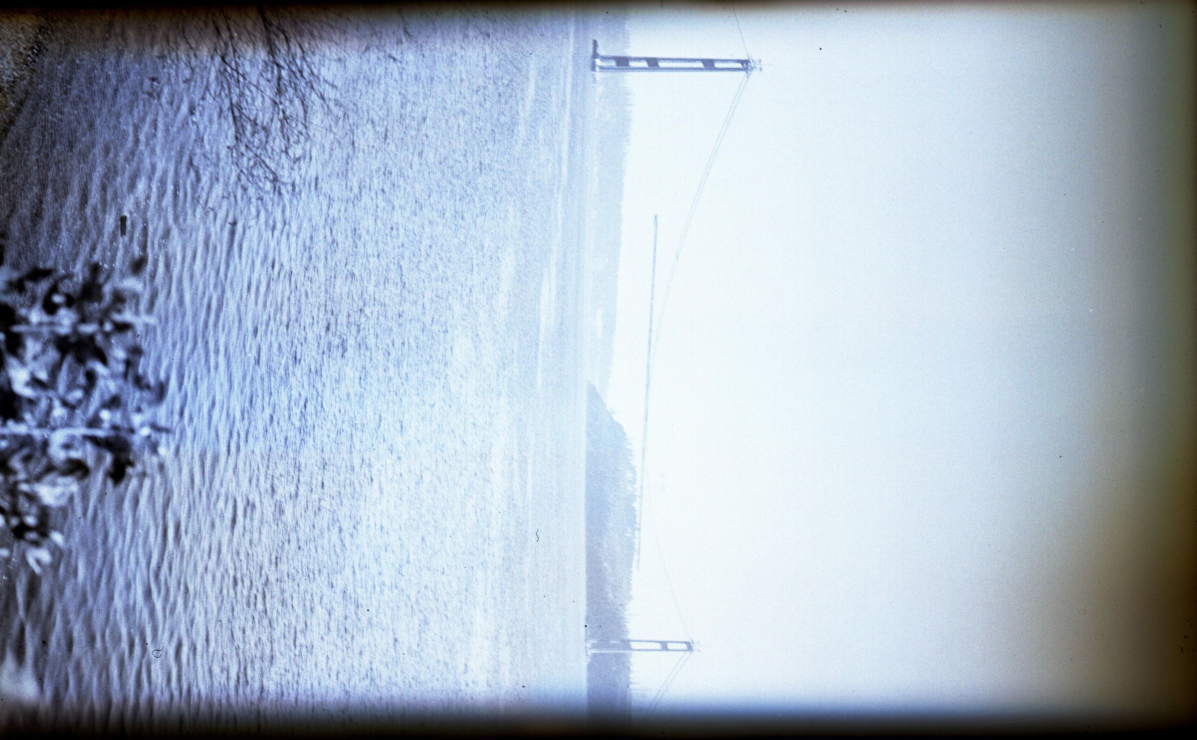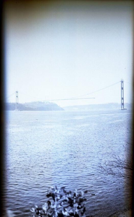 Black and white negative of the Tacoma Narrows Bridge under construction. In the foreground is a shrub and some bare branches and then a long stretch of water. In the middle background are two towers with cables strung between them and a part of the roadway in place. At the left is land. There is a white border on all sides, and in the bottom border is "#2035 4/20/40".